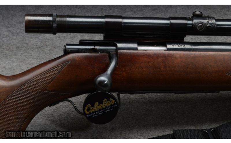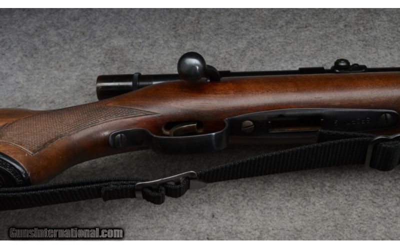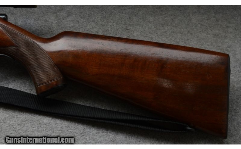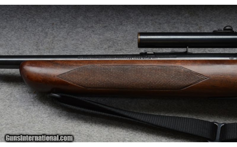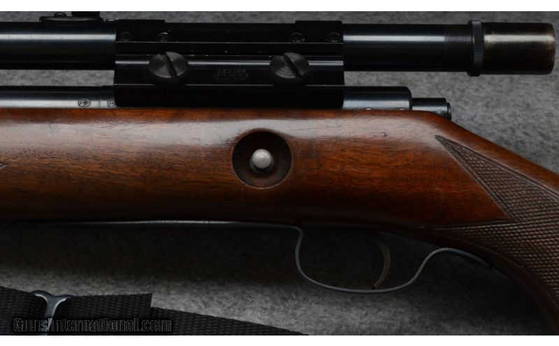 Description: SOLD Curio/Relic: Yes Manufacturer: The year of manufacture for serial number 68xxx is 1949. Caliber Info: .22 Long Rifle Metal Condition: Very good to excellent. A few shallow pits on the barrel. Wood Condition: Very good, has some scratches from handling. Bore Condition: Shiny and good. Barrels: 23-1/2 inch Stock: Checkered walnut pistol grip Stock Dimensions: 13-1/2 Inch LOP Butt Pad: Steel plate. Weight: 6 lbs - 10 oz. as shown with scope Sights: Hooded bead and ramp open sights. Drilled and tapped for your choice in scopes. Topped with a Weaver G4 scope. Extras: Scope, one magazine total, sling Item Location: Rogers, MN, MN |