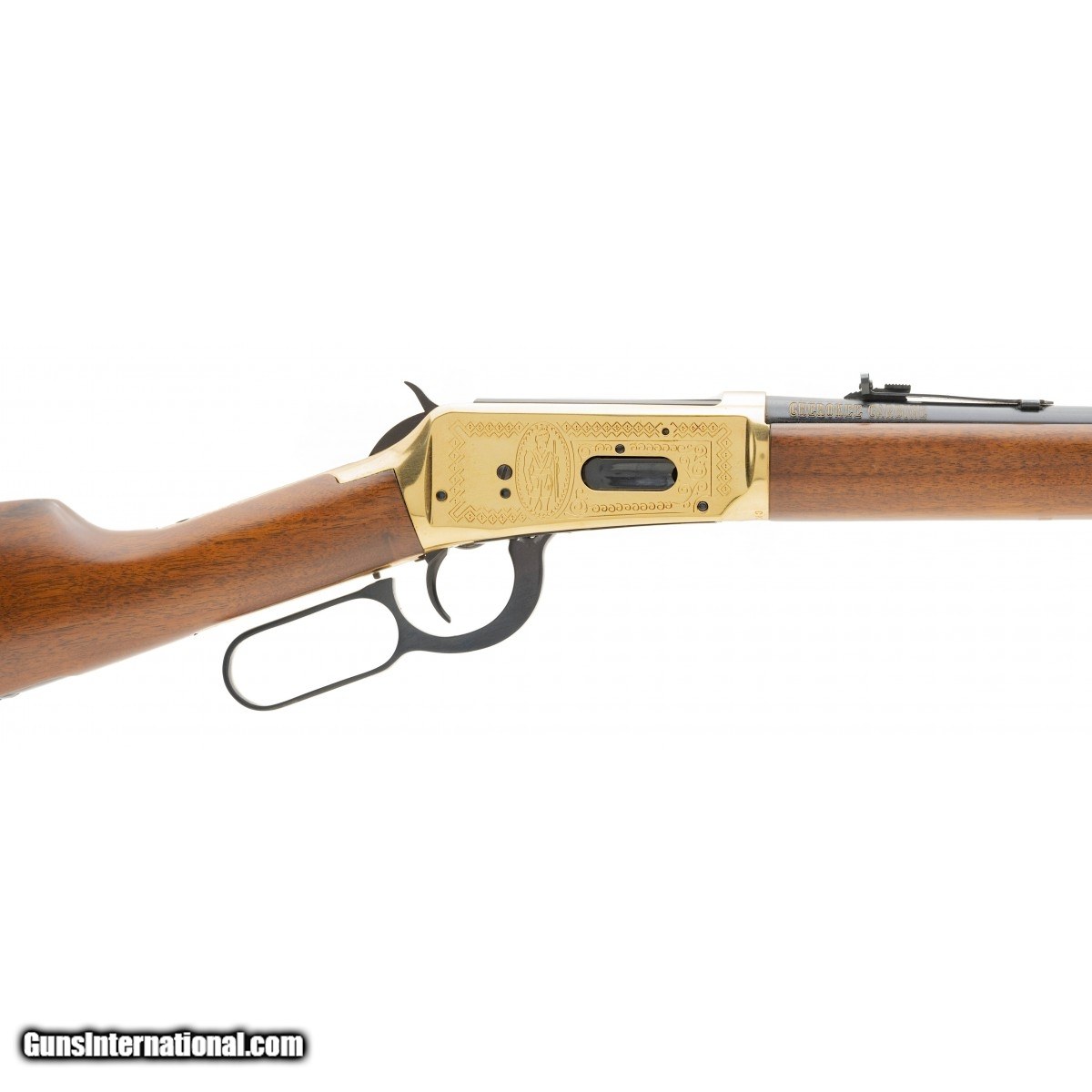 Description: " Scarce lever action Winchester Cherokee Carbine Commemorative with 20"" barrel and engraved golden receiver. Originally issued in Canada circa 1978. Overall excellent condition. SOLD |