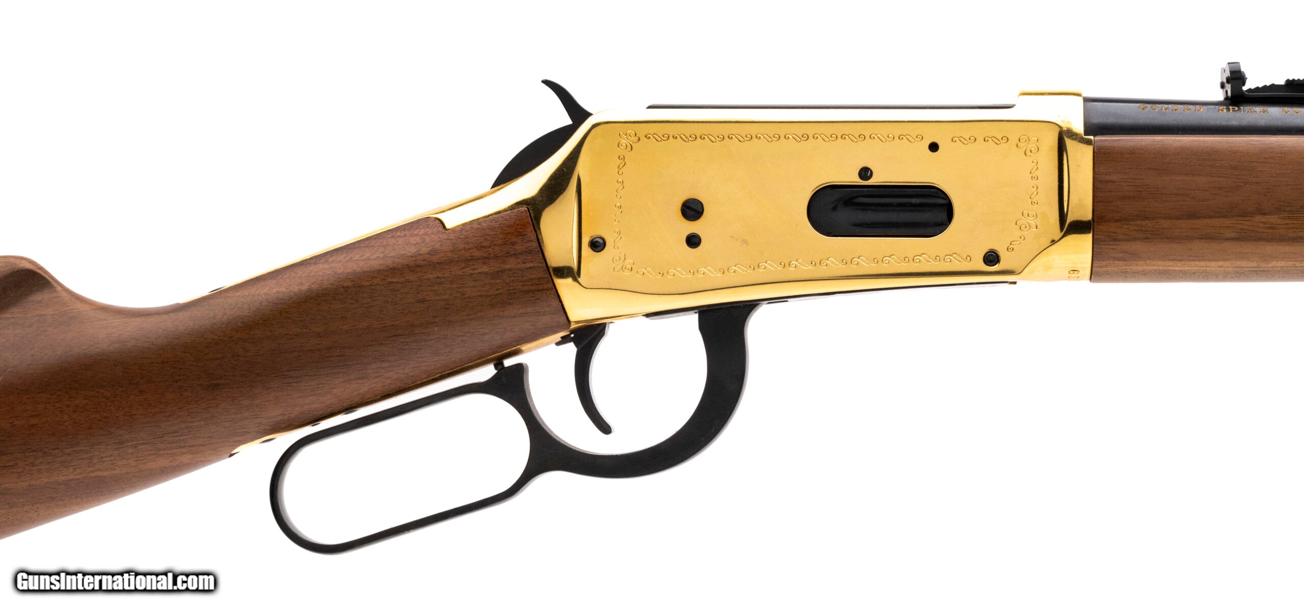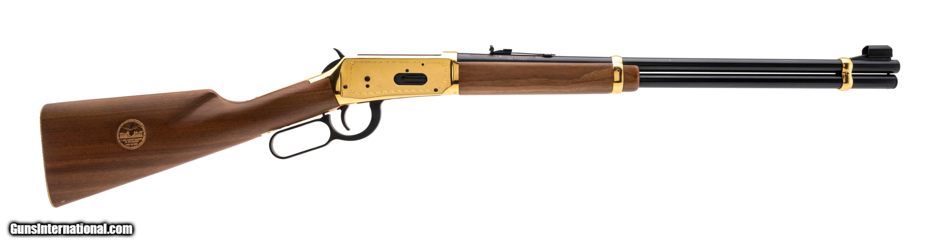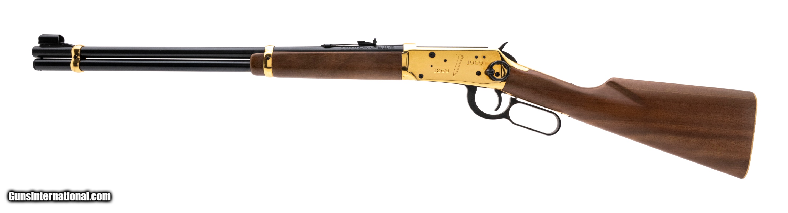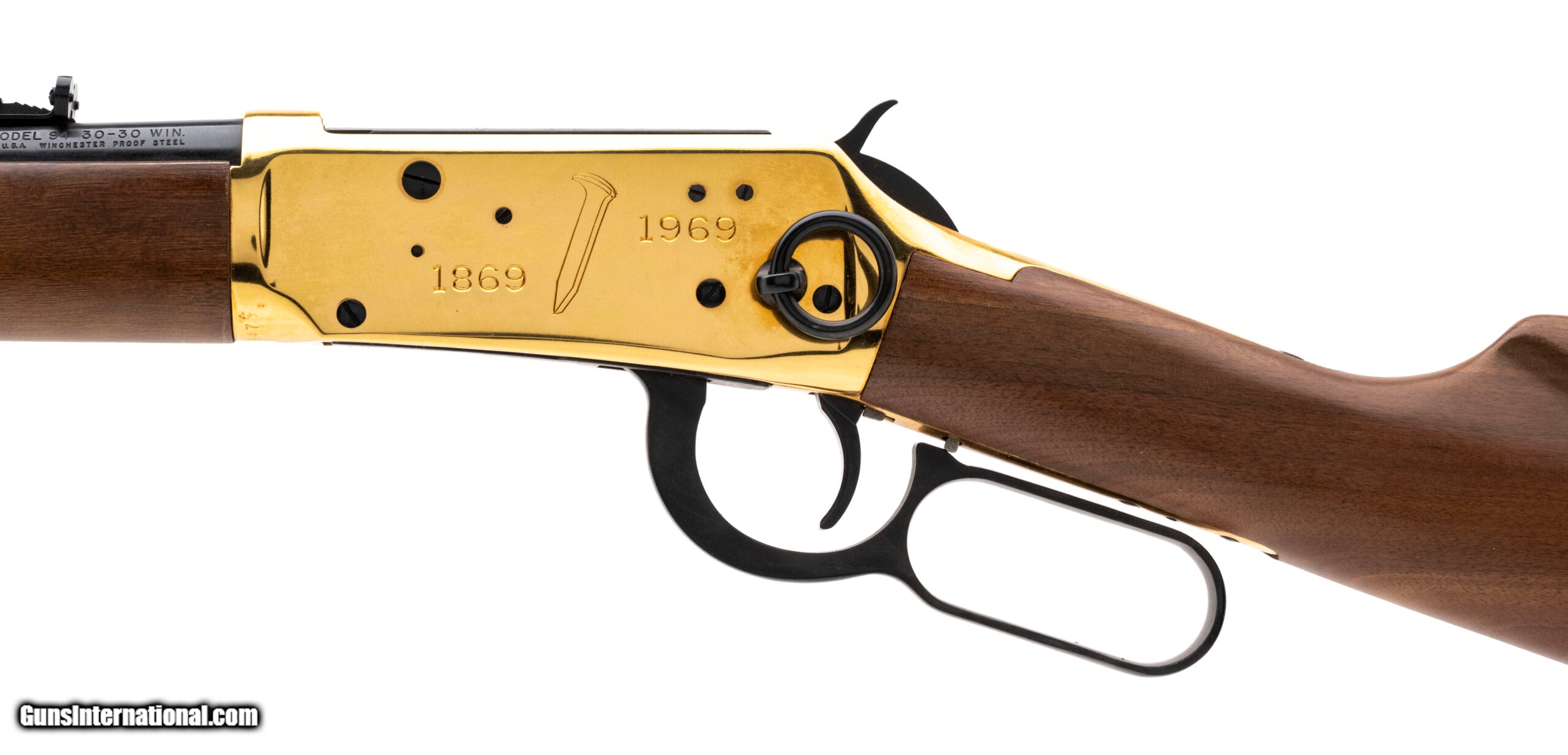 Description: "SN: GS3947. Made in 1969, .30-30 Winchester with an 20"" Barrel. Bore is bright with excellent rifling. Lever-Action Carbine with a golden receiver and accents with engravings also a commemorative coin inlaid in the right side of the stock. Finish is in very good condition with minuscule wear present along the receiver. Wood stock and forend are in very good condition with insignificant wear along the stock. SOLD |