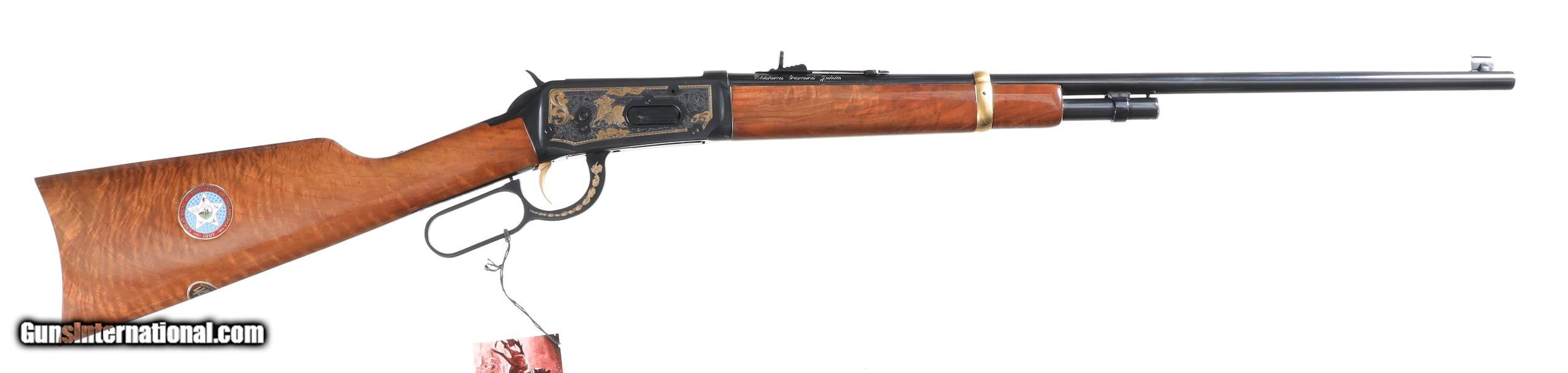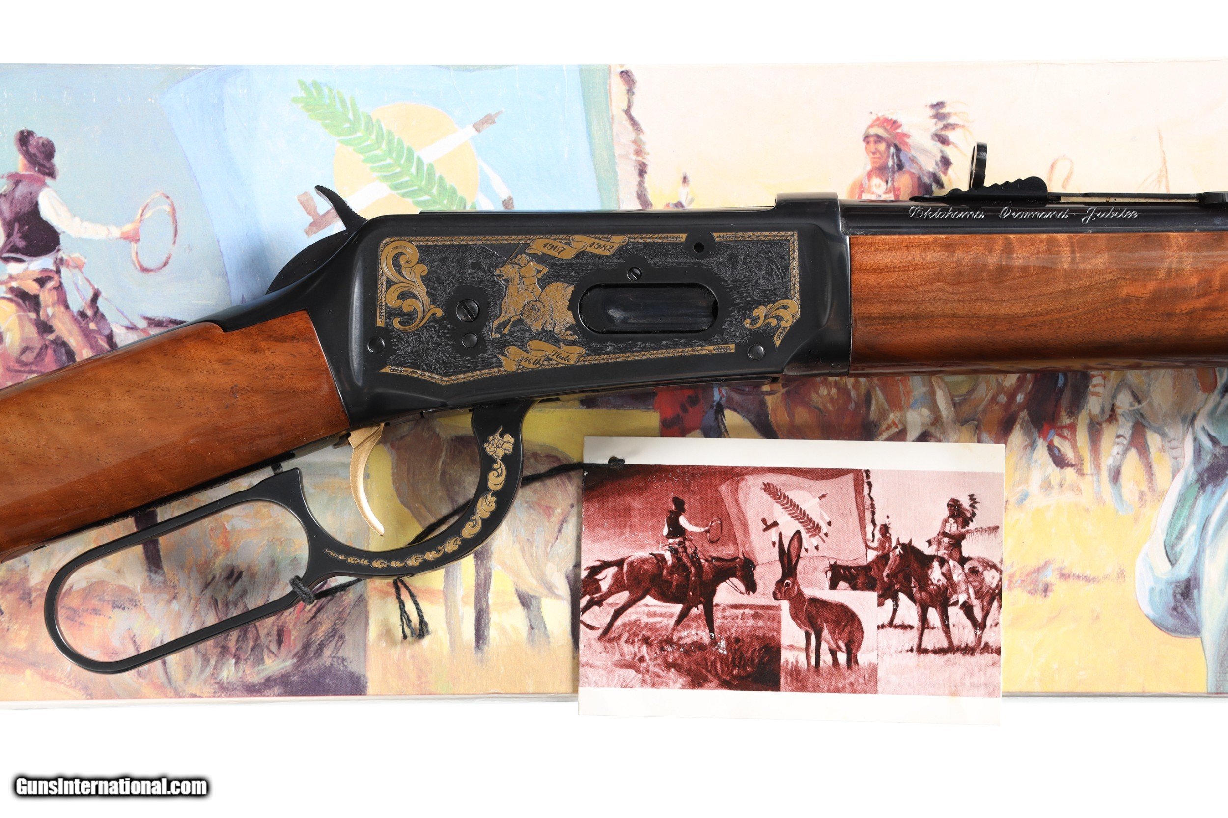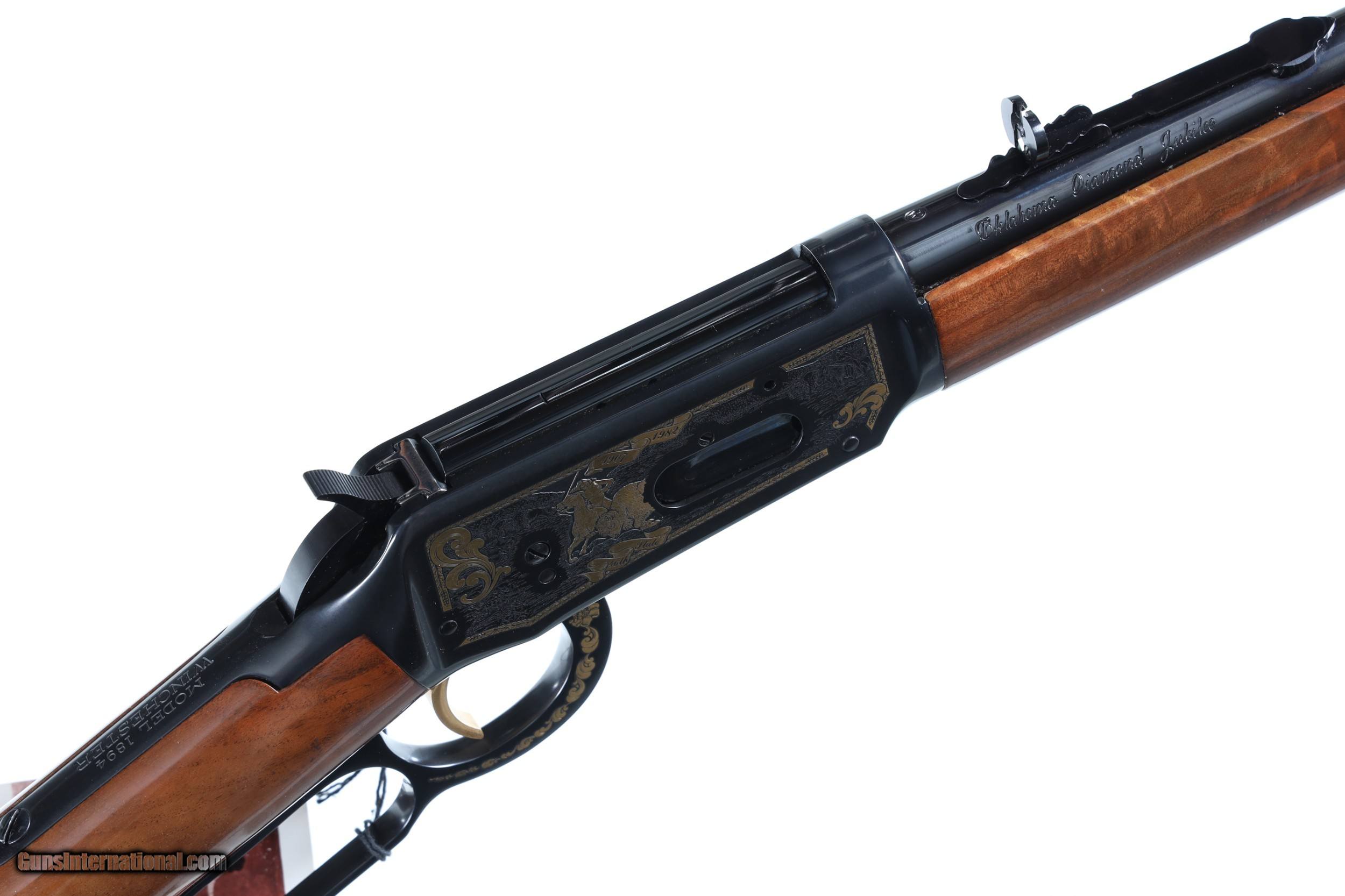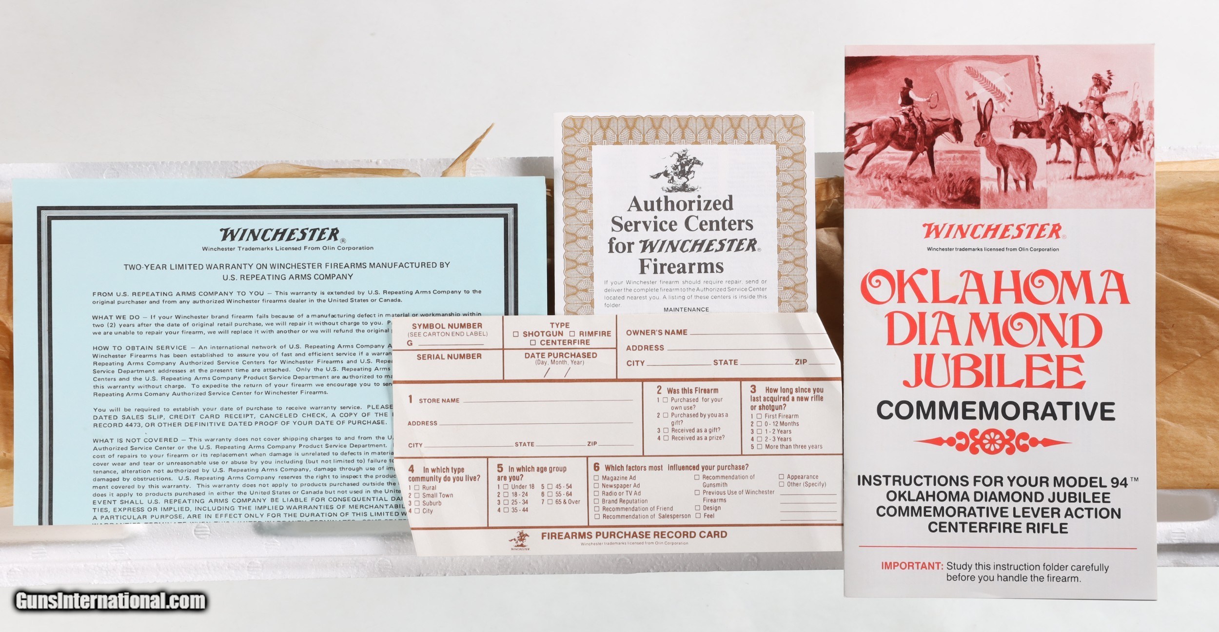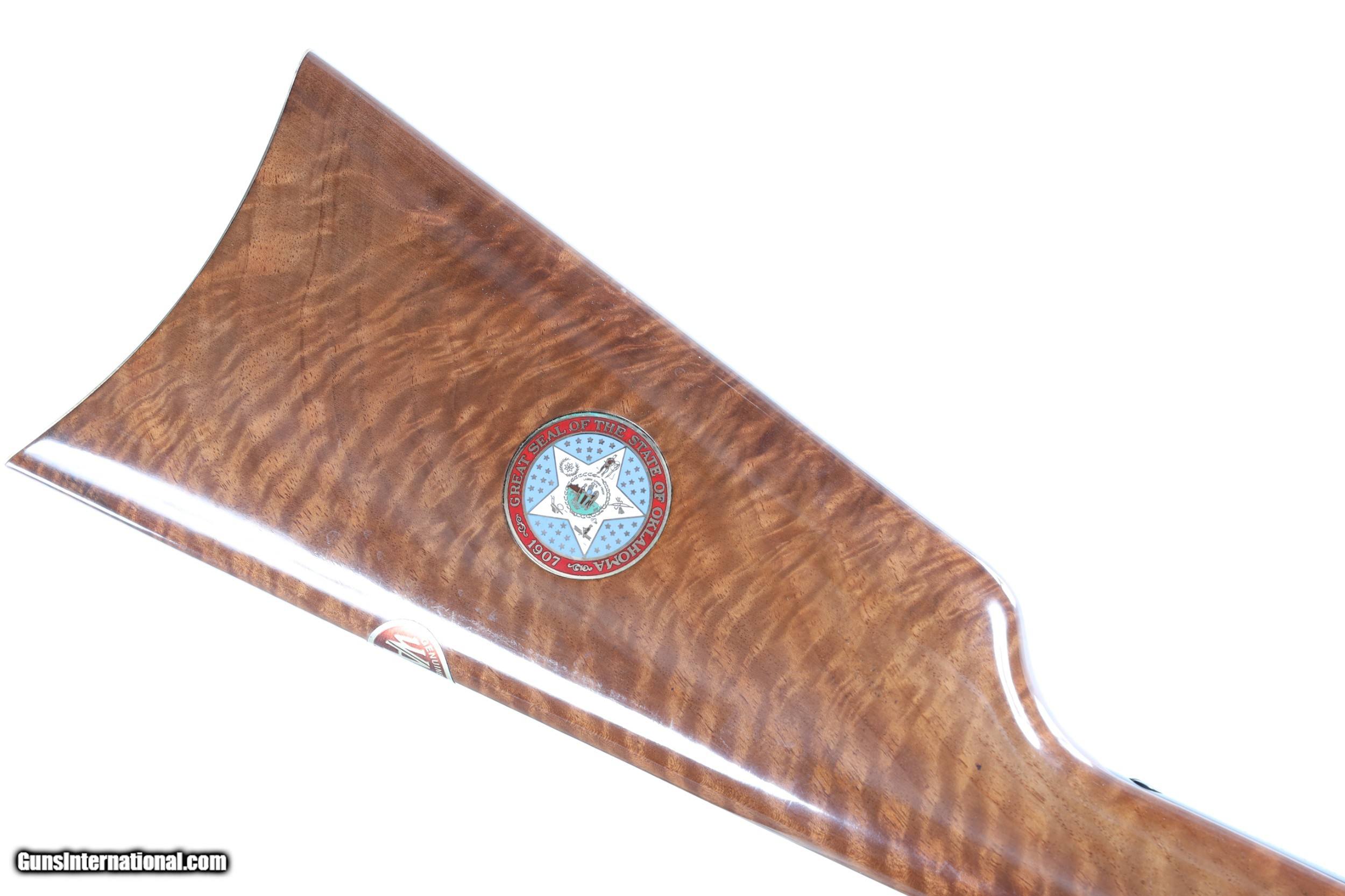 Description: Oklahoma Diamond Jubilee Commemorative in like new overall condition with matching factory box and papers. 1982 only 100 porduced at $2200 issue price. • Free Shipping, No Credit Card Fees. • Lay-a-way available for this firearm. • 1/3 Down, a 1/3 in 30 Days 1/3 in 60 Days. SOLD Curio/Relic: Yes Manufacturer: Winchester Model: 94 Serial Number: ODJ449 Barrel Length: 23 |