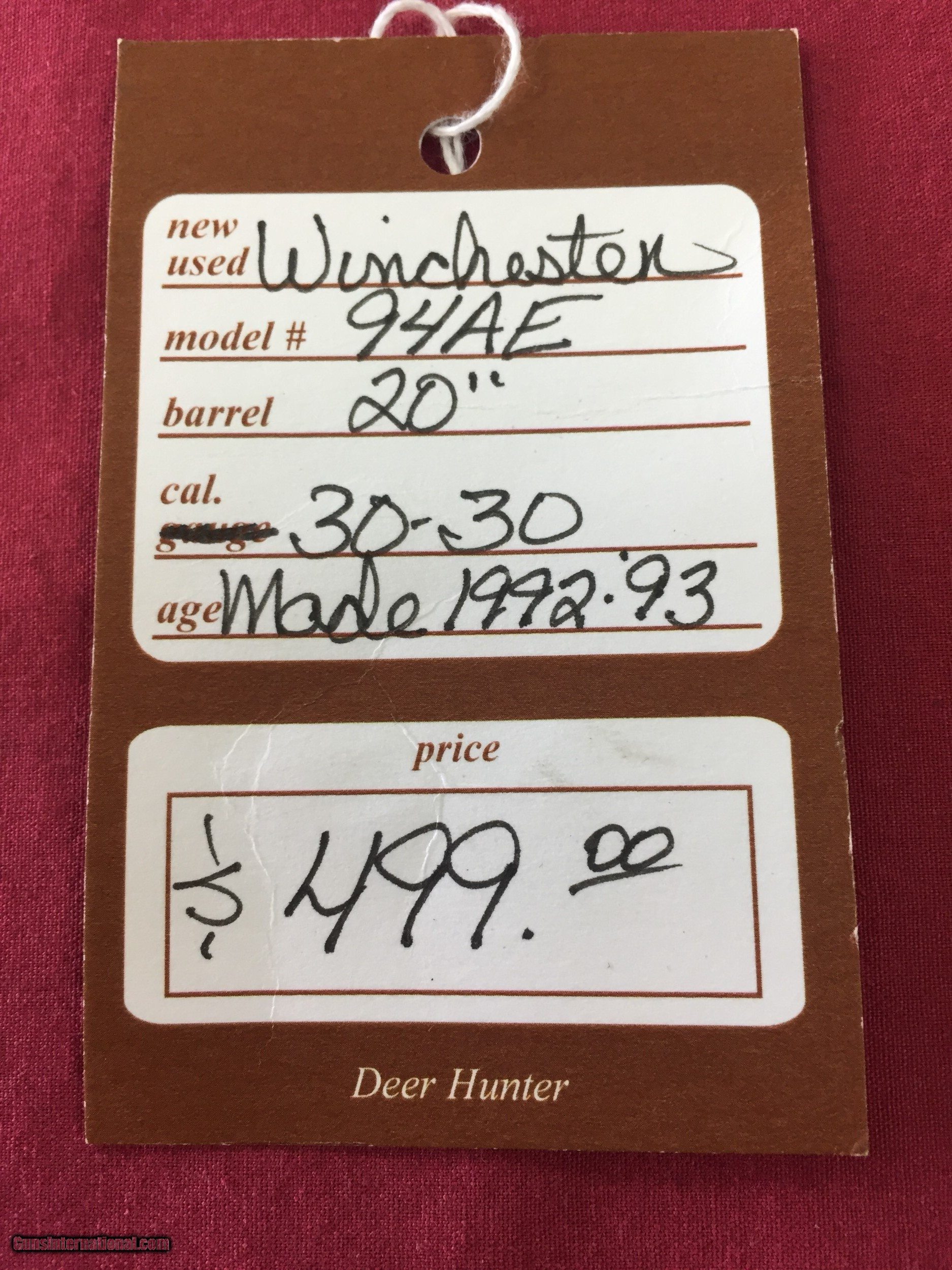 Description: SOLD FOR SALE Winchester 94AE, Excellent Condition, Beautiful Bore, 20" Barrel, 6 Shot, 30-30 winchester Circa 1992-1993 We Accept VISA, M/C, & DISCOVER Shipping to Lower 48 is Handguns = $30.00 ( US PRIORITY MAIL) Long guns = $40.00 (UPS GROUND) SOLD |