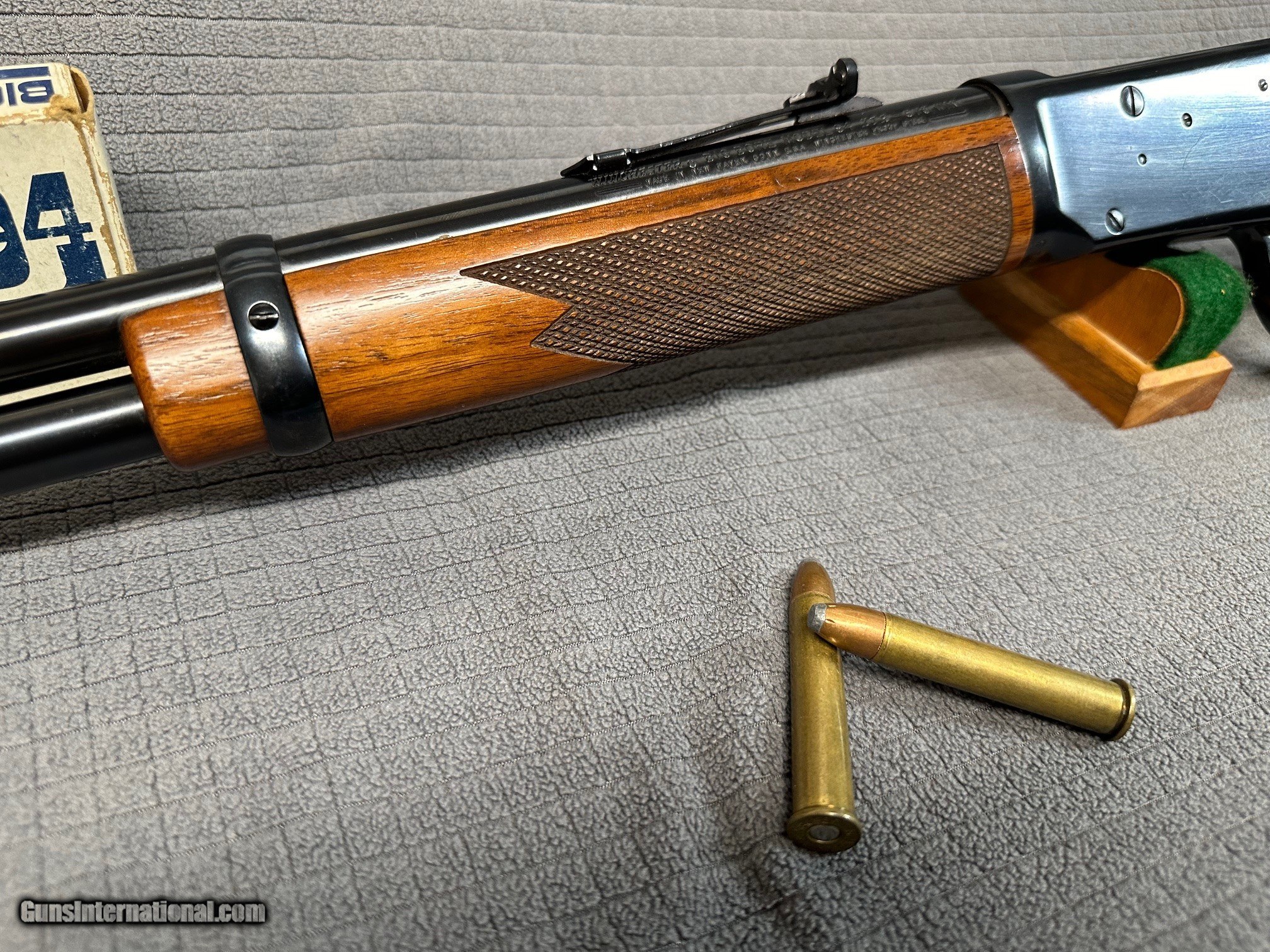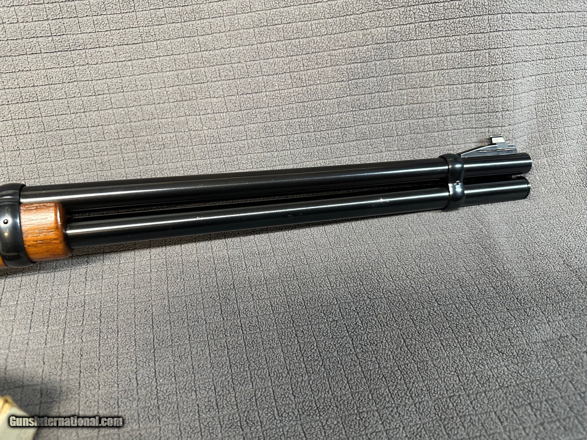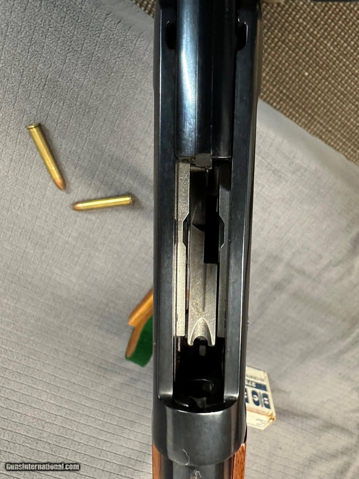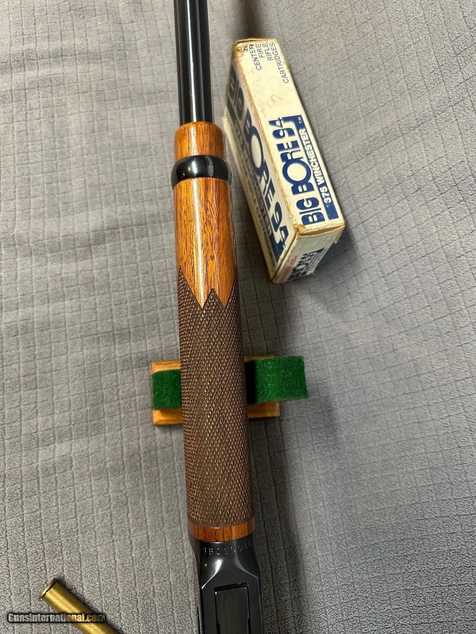 Description: *Collector Condition* TOP EJECT(Winchester Repeating Arms) Big Bore 94 XTR chambered in the formidable 375 Winchester. This rifle is in NEAR NEW condition and original. Wood is 98%+.Only a few very small handling marks. Blue is 98%+ as well. Couple small marks on mag tube(visible in pics). 20" barrel with bore as new. Front sight hood is absent. This rifle has been fired very little. Nice light brush gun with some knock down power. Be great for bear or moose. Shipping & insurance $50.00(lower 48) to your FFL. NO CA Sales. Thanks for looking. SOLD |