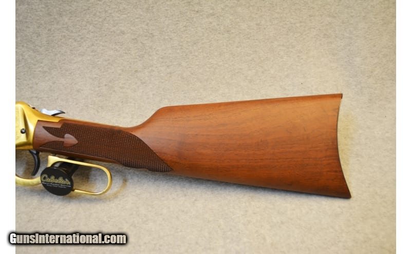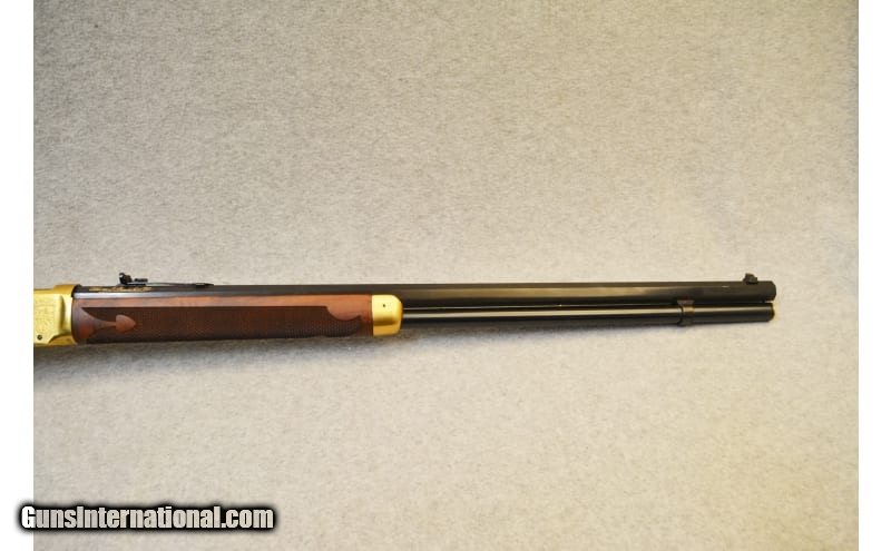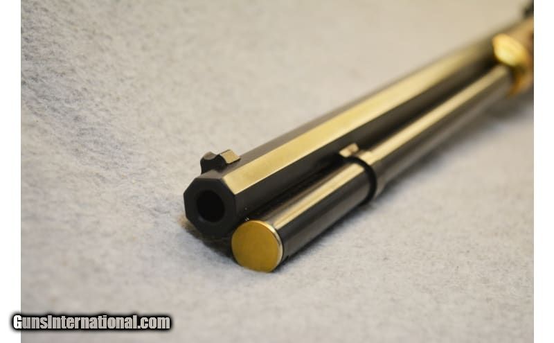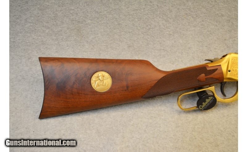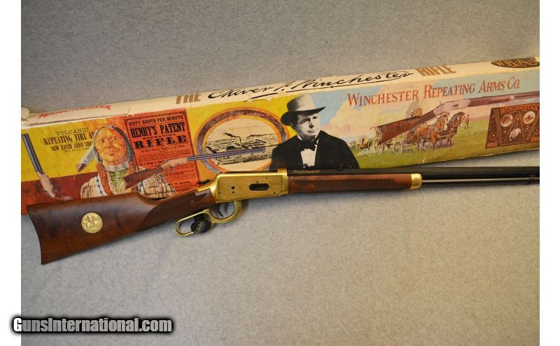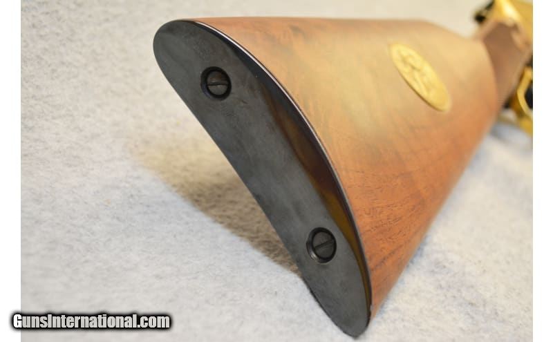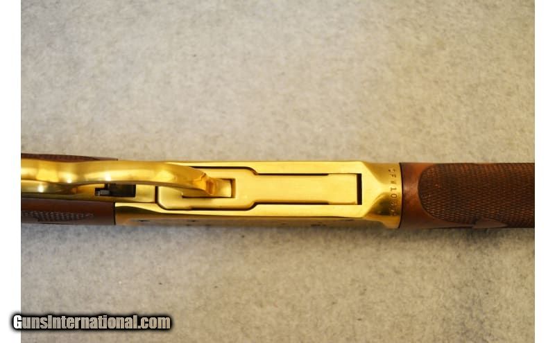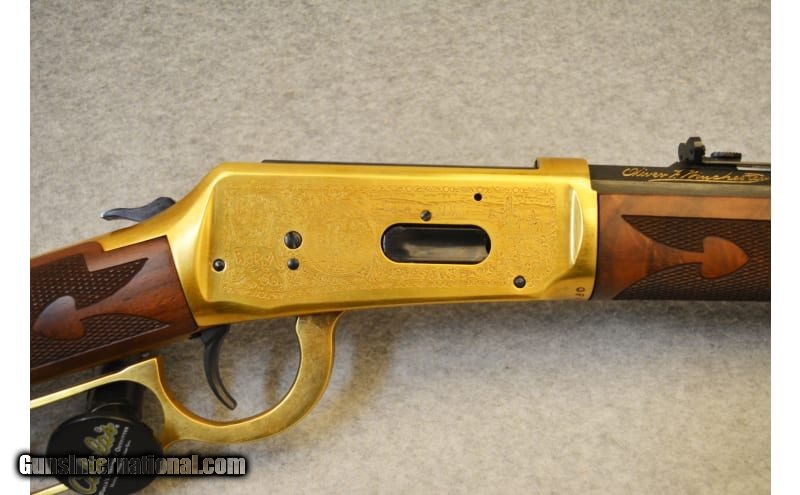 Description: Serial #OFW10354, .38-55, 24" octagonal barrel with a great bore. This is the Oliver Winchester Model 94 lever action commemorative rifle featuring an engraved gold-plated receiver with scenes of the Winchester factory on the left side and early frontier scenes on the left with W.R.A Co. scroll and gold inlay Oliver F. Winchester signature on the barrel with Oliver Winchester medallion 1810-1880 in the butt stock. The barrel is in excellent condition there is only a half in scratch on the right side by the top of the barrel. The walnut stock is likewise excellent with crisp checkering showing only light handling marks. The rifle comes in the original styrofoam box with the commemorative sleeve. .38-55 Winchester SOLD Barrels: 24 inch Item Location: Hazelwood, MO |