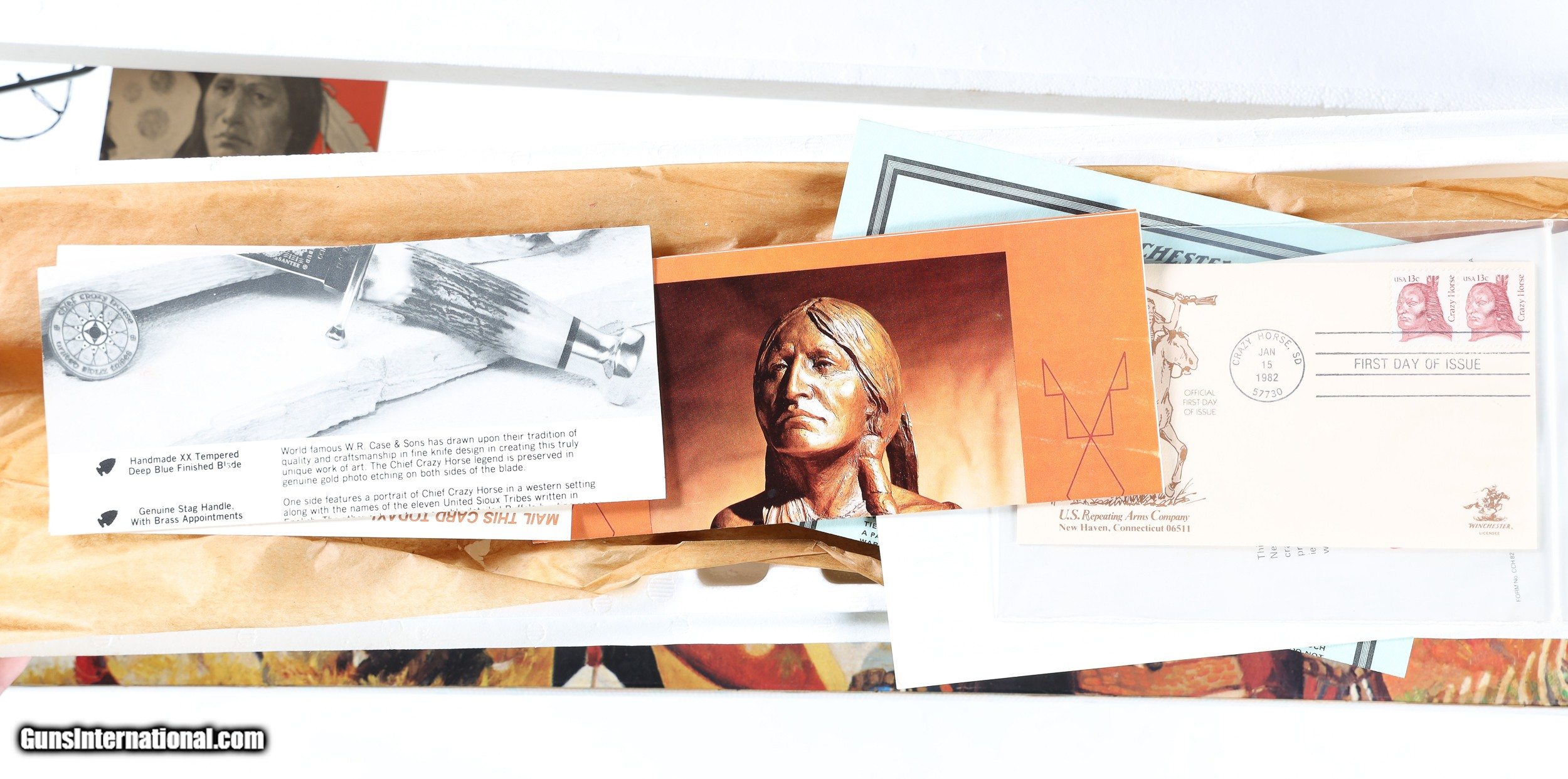Description: Chief Crazy Horse Commemorative like new with factory box numbered to gun. Mfd in 1983. This Winchester Commemorative Edition Chief Crazy Horse .38-55 Rifle is a historic, sentimental and beautiful work of art. With total production never topping 20,000, this rifle is highly sought-after and difficult to find. The colored casehardened reciever and forend cap compliment the walnut stock's tacked-stain finish wonderfully. The left-side of the blued barrel is marked with Wenchester's trademark and address. The right-side of the barrel is marked "Chief Crazy Horse", along with a golden colored filling. This rifle is accompanied by its orginal box, instructions manual and a catalog of supplementary Crazy Horse collectibles and Sioux artifacts. • Free Shipping, No Credit Card Fees. • Lay-a-way available for this firearm. • 1/3 Down, a 1/3 in 30 Days 1/3 in 60 Days. SOLD Curio/Relic: Yes Manufacturer: Winchester Model: 94 Serial Number: CCH14189 Barrel Length: 24 |