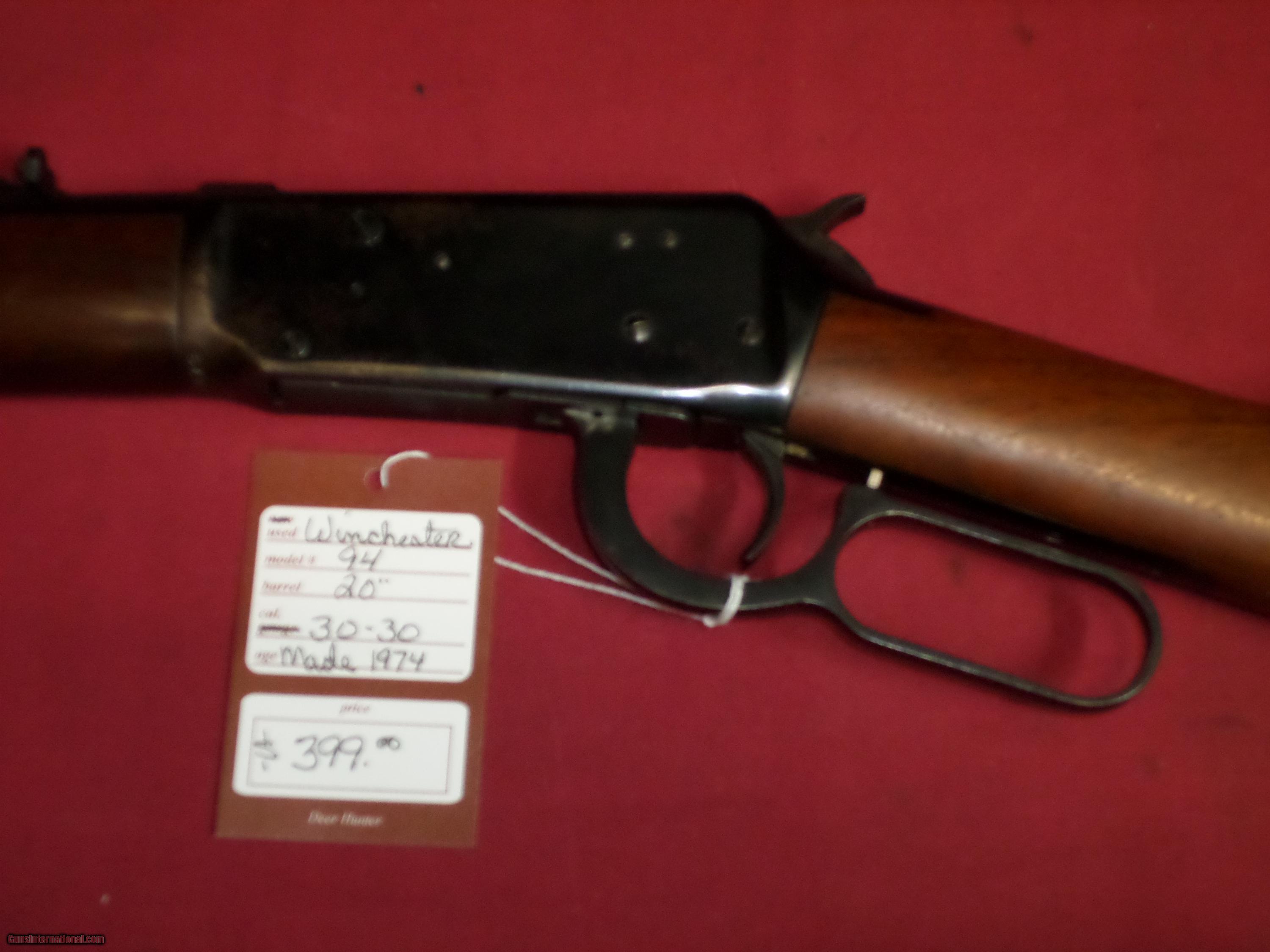 Description: SOLD For sale, Winchester 94 carbine, .30-30, 20" bbl. Excellent condition, with sling swivels added. Circa 1974 SOLD To see more of our inventory, visit deerhunterguns,com We collect 7% sales tax for Florida sales. We accept MC, Visa and Discover, no AmEx. No Sales to California. Like us on Facebook: Deer Hunter Guns SOLD |