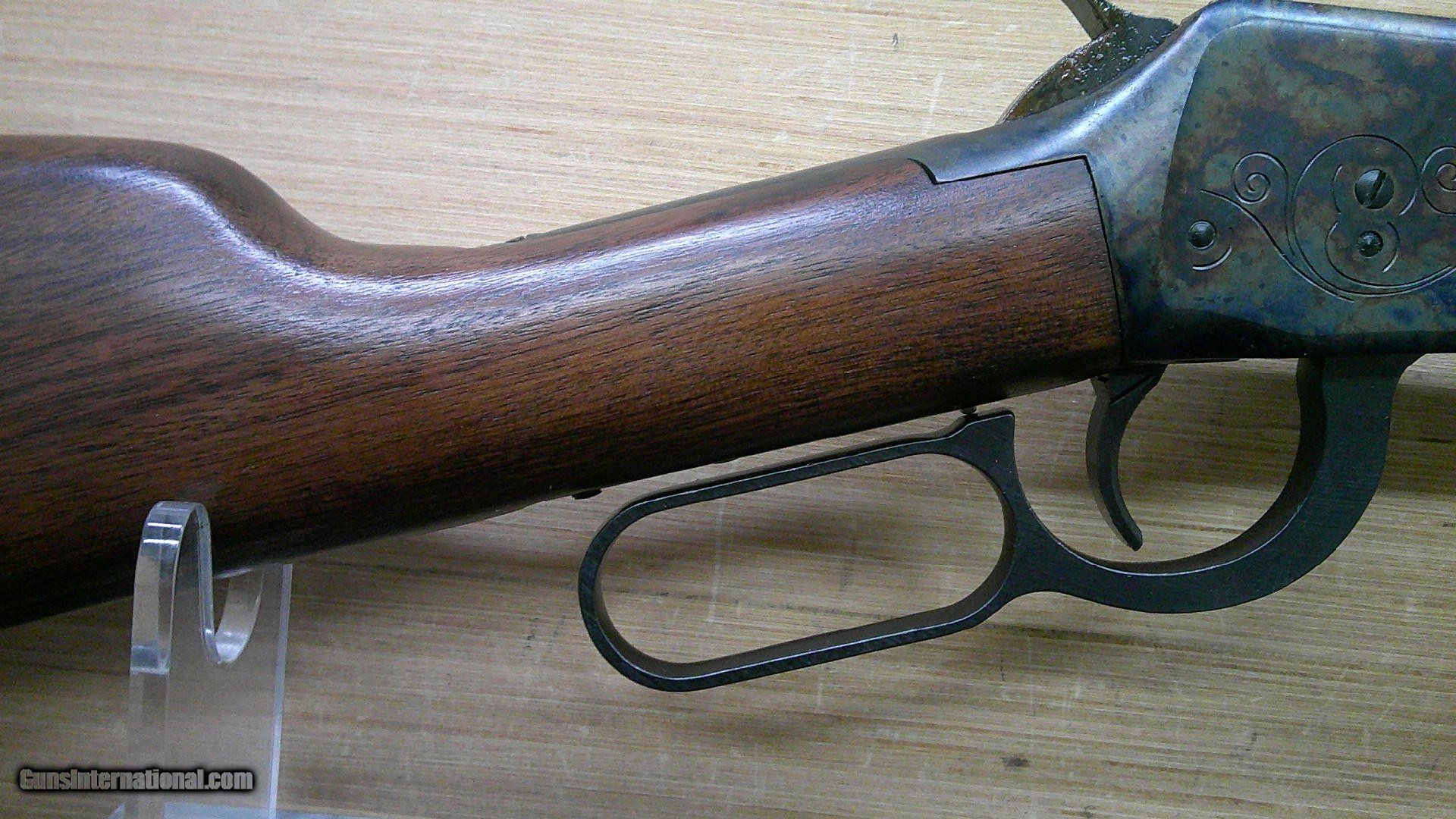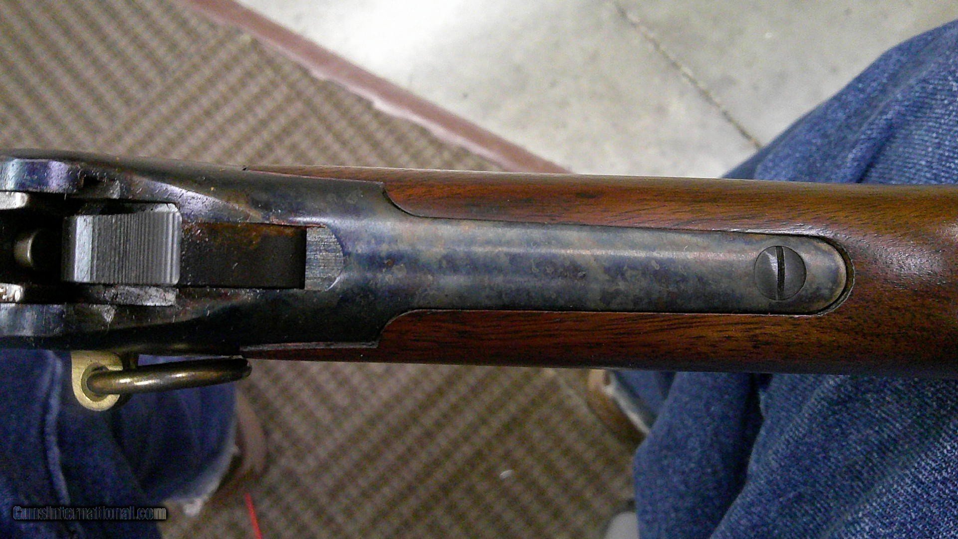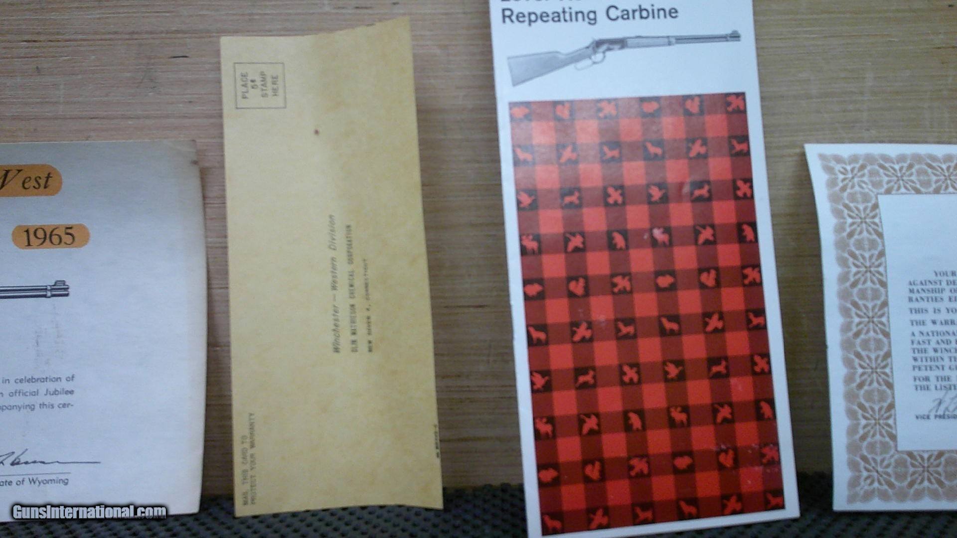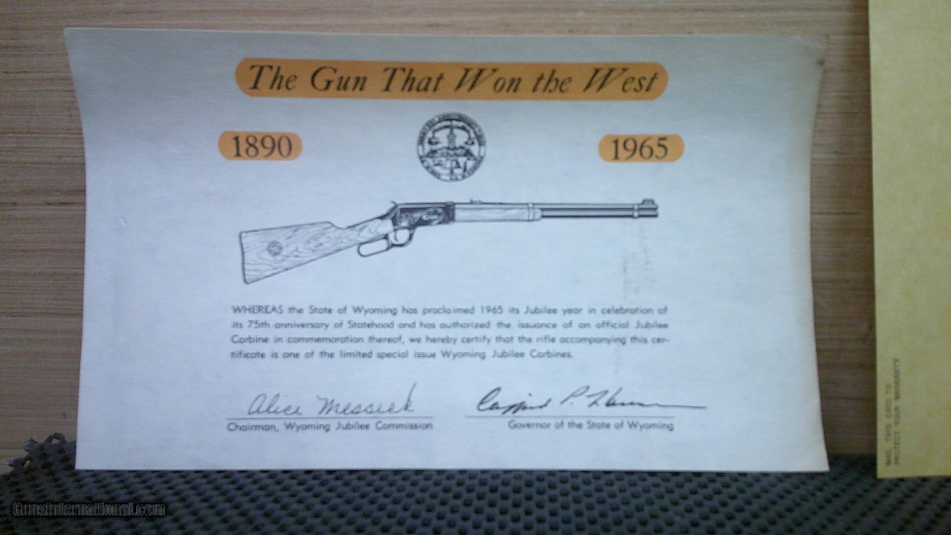 Description: CONSIGNMENT EXCELLENT CONDITION Winchester 94 Wyoming Diamond Jubilee .30-30 Win caliber 20" Barrel, Commemorative rifle. Blued finish. Color case hardened receiver. Top of barrel stamped "Wyoming Jubilee 1890-1965" "75th Anniversary of Statehood". Engraved receiver. Walnut stock with 75th Anniversary medallion.Serial # WJ733 WITH FACTORY BOX, MANUAL, WARRANTY CARD & CERTIFICATE AND "The Gun That Won the West" certificate also THERE IS A LITTLE OF THE PLATING MISSING OFF OF THE LOADING GATE (SEE PHOTO # 12) We would suggest insurance on this one. ****PLEASE CALL IN THE WITH THE SELLER’S INVENTORY NUMBER IF INQUIRING ABOUT A FIREARM****** WE DO NOT SHIP FIREARMS AND/OR FIREARMS’ PARTS OUT OF THE 50 UNITED STATES, SO DON’T ASK—YOU NEED TO KNOW IF FIREARM IS LEGAL FOR YOUR STATE PRICE REFLECTS PAYMENT BY MONEY ORDER / CASHIERS CHECK. A 3% PREMIUM IS ADDED FOR CREDIT CARDS. WE DO ACCEPT PERSONAL OR BUSINESS CHECKS, BUT THERE IS A GRACE PERIOD OF 10 BUSINESSS DAYS ON THEM. Shipping is $60 for handgun and $50 for long gun. Shipping to Alaska and Hawaii will be more based on weight of firearm. USPS SHIPPING IS HIGHER. WE DO OFFER LAYAWAY PLANS FOR 30,60, OR 90 DAYS.NOT ON CONSIGNMENT GUNS THERE IS A $5.00 CHARGE FOR EVERY 30 DAYS ITEM IS ON LAYAWAY. WE ALSO REQUIRE A 20% DOWN PAYMENT ON TOTAL OF LAYAWAY SALE. LAYAWAYS ARE NON- REFUNDABLE. HERE IS HOW THIS PROCESS WORKS. YOU WOULD CALL US AT 540-337-9218 WITH LISTER # TO PURCHASE THE GUN. THEN ONCE I HAVE RECEIVED PAYMENT AND AN FFL (FEDERAL FIREARMS LICENSE) FROM A LICENSED DEALER IN YOUR AREA OF YOUR CHOICE. WE WILL THEN SHIP THE GUN TO THEM. YOU WOULD THEN PICK UP THE GUN AT YOUR LOCAL DEALER AND DO PAPER WORK THERE. Please have your FFL Dealers contact information when you call. DOMINION OUTDOORS 15 ANGELA COURT FISHERSVILLE, VA 22939 540-337-9218 540-337-2422 fax M – F 9 a.m. to 6 p.m. ETZ Sat 9 a.m. to 4 p.m. ETZ ****PLEASE CALL IN THE WITH THE SELLER’S INVENTORY NUMBER**** ***PLANO HARD CASES AVAIABLE FOR PURCHASE $25.00 WITH THE PURCHASE OF A FIREARM** *** Online prices compared to in store prices will vary. *** SOLD |