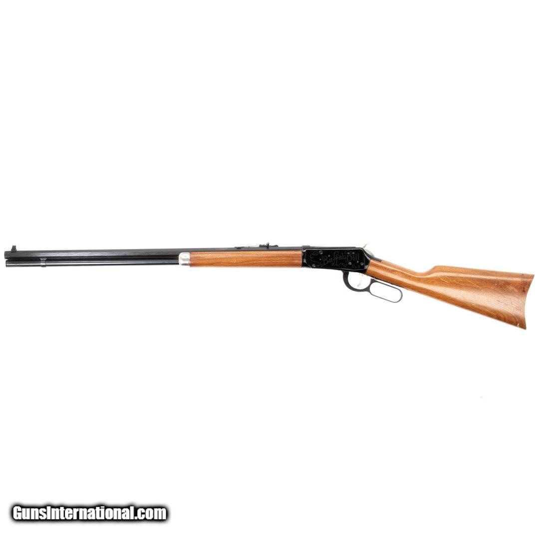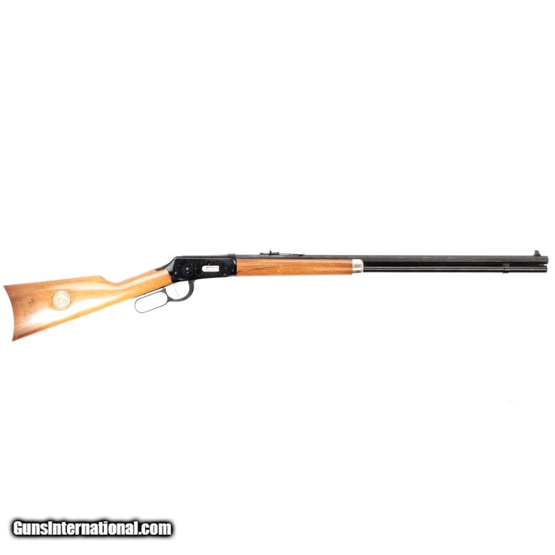 This Winchester 94 Buffalo Bill Commemorative features a coin in the stock, Buffalo Bill scrolling on the receiver, and \"W.F. CODY CHIEF OF SCOUTS\" on the receiver top tang. There are chips, scratches, and dents on the stock and forearm.