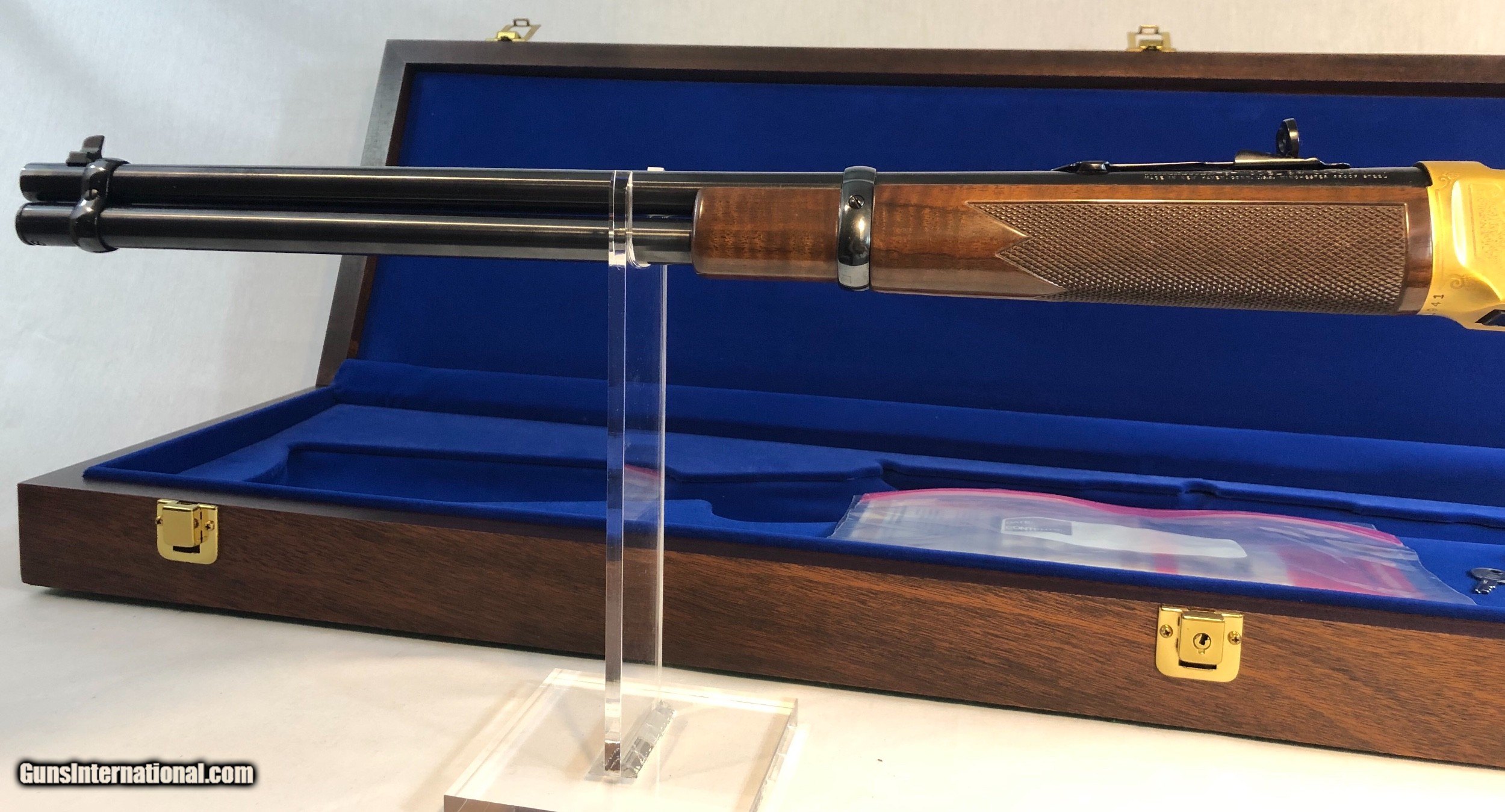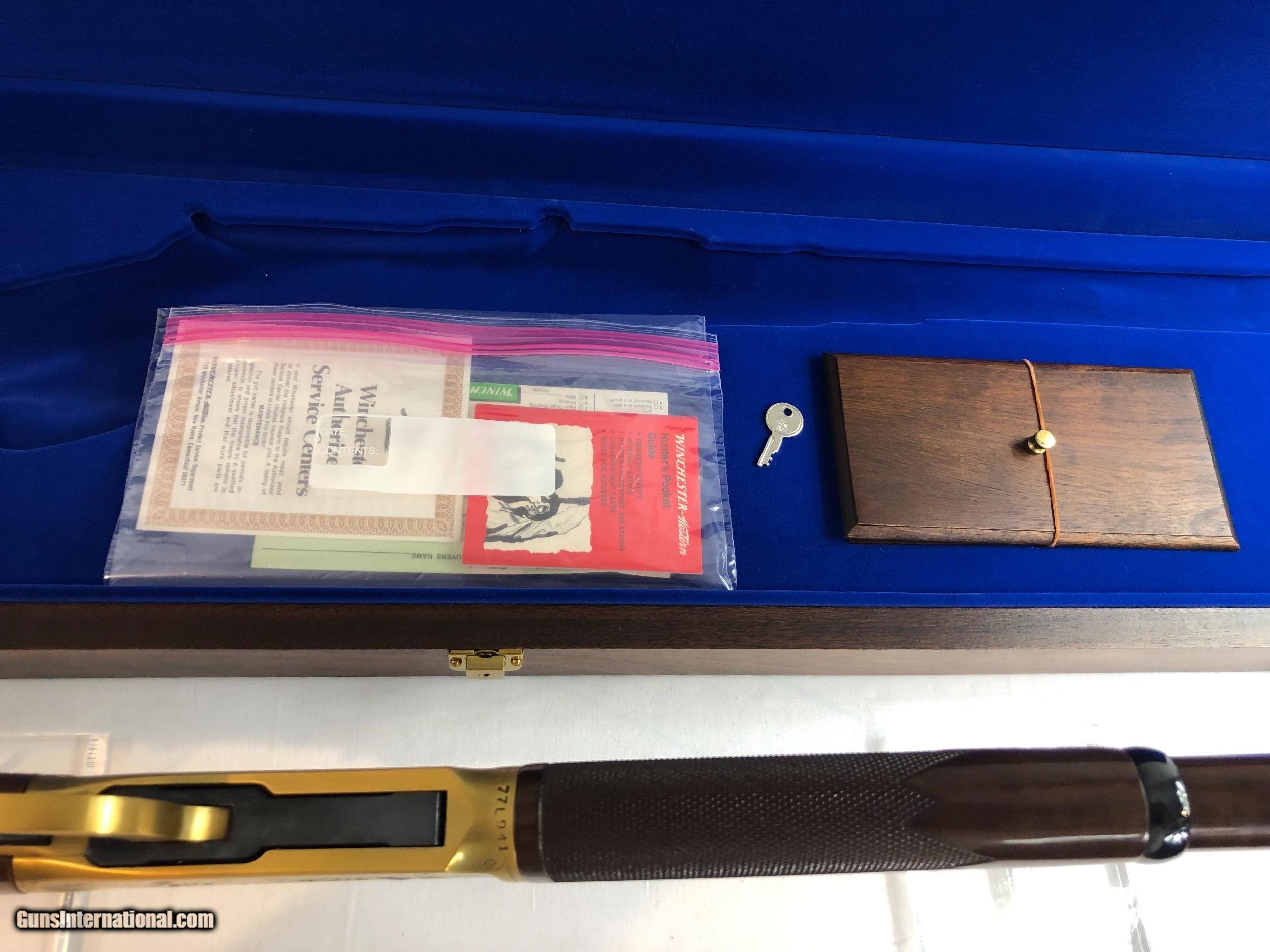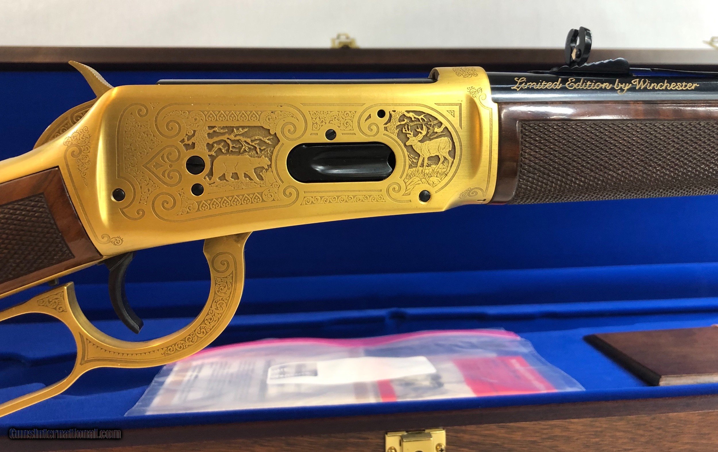 Description: Manufactured in 1977 this carbine is beautifully engraved on both sides of the receiver with deer, mountain lion, and bear scenes. The stock and forearm are walnut with a high gloss finish. This gun is NIB and has not been fired. It is in mint condition. It comes with the original box, paperwork and an additional walnut presentation case with red velvet lining. This item requires (2) packages for shipping due to walnut presentation case must ship seperatley. Ground shipping is included to the lower 48 states. This gun is sold as a collectors item only and we make no guarantees to its quality or functionality. This firearm should be checked by a qualified gunsmith before firing. Seller bears no responsibility for the functionality of this firearm. Please know and abide by your local laws in regards to purchasing firearms. This firearm must ship to buyers approved FFL holder. SOLD Manufacturer: Winchester Model: 94 Serial Number: 77L941 Caliber Info: 30-30 Condition: Excellent |