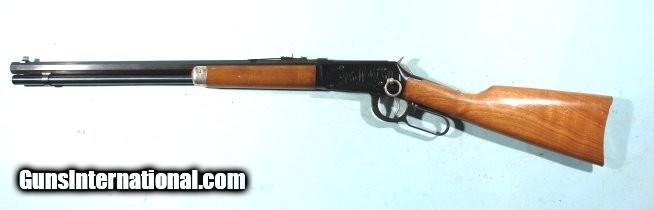 Description: WINCHESTER MODEL 94 BUFFALO BILL COMMEMORATIVE .30-30 SADDLE RING CARBINE CIRCA 1968. 20” octagon original factory barrel. Called a “Carbine” but in reality a short rifle. Saddle ring on frame which is engraved “BUFFALO BILL”. Blued finish with nickel plated saddle ring, butt plate, trigger, hammer and forend cap. Stock with “BUFFALO BILL” commemorative medallion. Near new and looks unfired. Stock with a few minor storage dings. Working order and mint bore. SOLD Rifle Caliber: .30-30 Winchester |