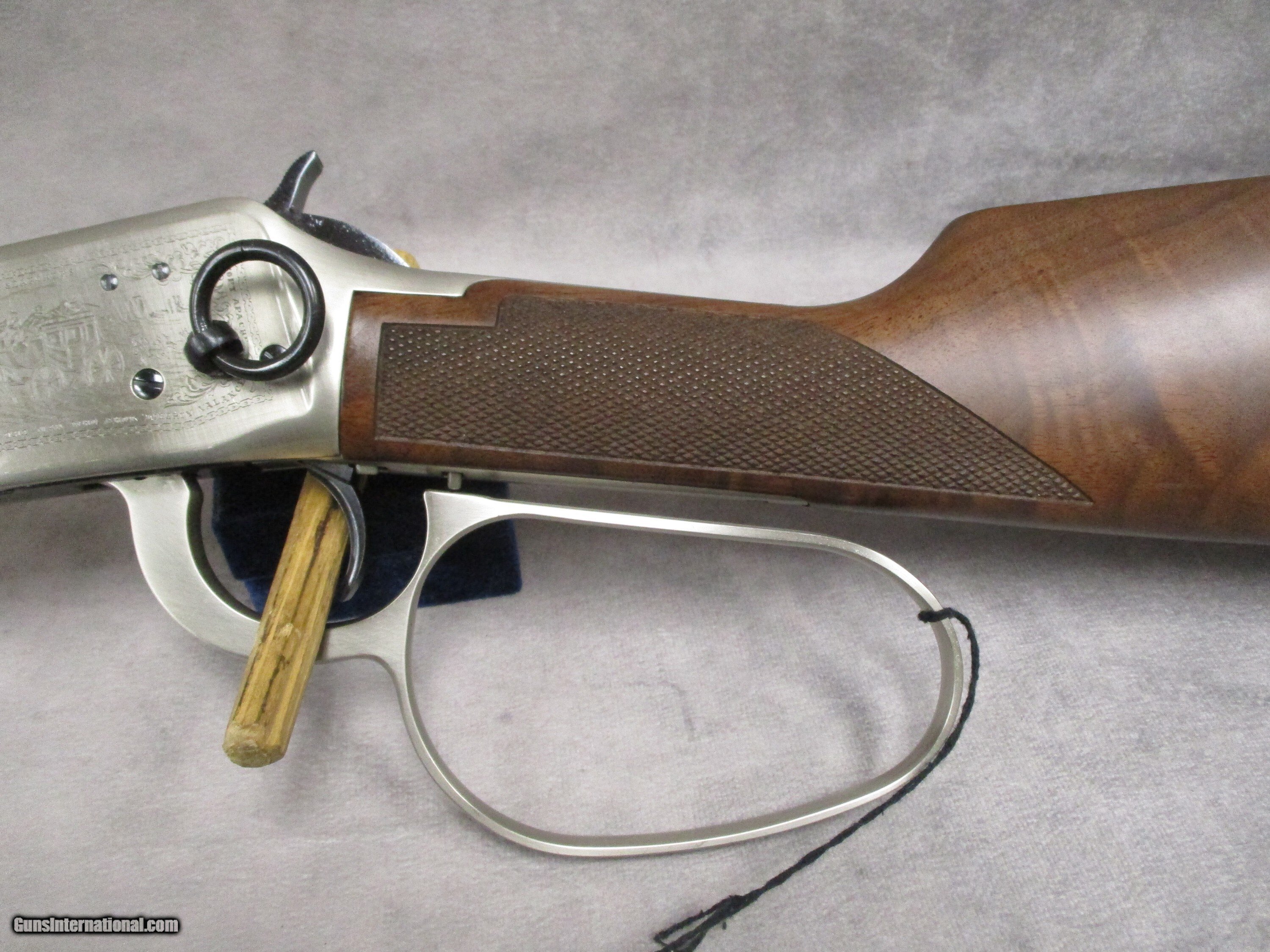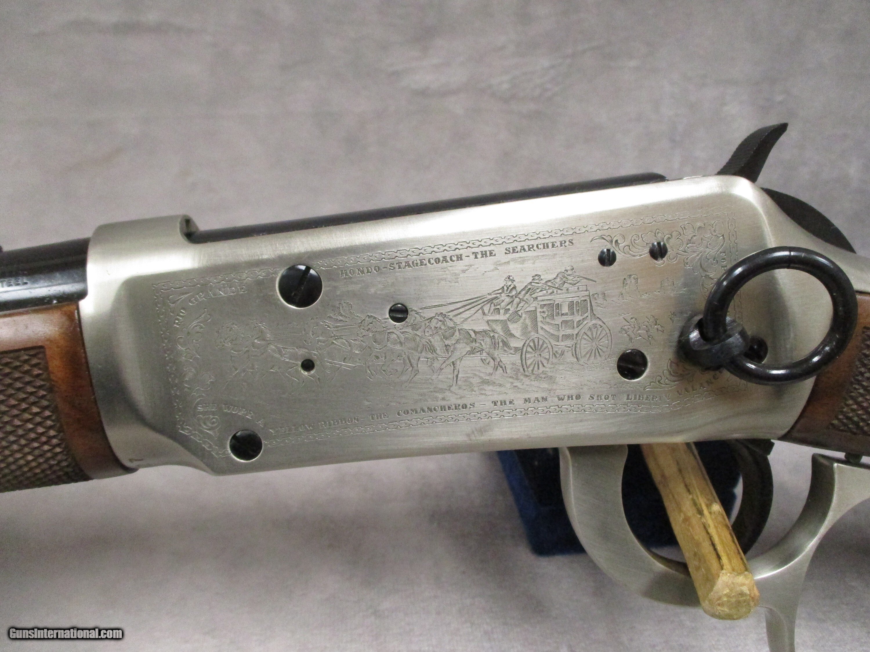 Needless to say, the Commemorative carbine shown here, has not been fired (outside of federally mandated factory testing) and the lever has not been operated much if at all. It sports the aforementioned wide lever loop, an 18.5-inch round barrel, superb wood furniture, and an engraved receiver. The righthand side of the receiver features a scene with two men on horseback (one close and one distant) herding cattle. Around the scene are the engraved titles of western films in which John Wayne starred (moving clockwise): The Cowboys (1972), The Undefeated (1969), Red River (1948), Rio Lobo (1970), True Grit (1969, for which Wayne won the Academy Award for Best Actor), Chisum (1970), Rio Bravo (1959), How the West Was Won (1962), McLintock! (1963), The Sons of Katie Elder (1965, engraved as “Sons of Katie Elder” for reasons of spacing), The War Wagon (1967, engraved as “War Wagon”, again for spacing), and El Dorado (1966). The lefthand side of the receiver is engraved with the scene of a stagecoach and horses being pursued out west, with the driver concentrating on his task while two other men engage their pursuers with long guns. Like the other scene, more of the titles of Wayne’s western films are engraved (again moving clockwise): Rio Grande (1950), Hondo (1953), Stagecoach (1939), The Searchers (1956), Fort Apache (1948), The Man Who Shot Liberty Valance (1962), The Comancheros (1961), and She Wore a Yellow Ribbon (1949). John Wayne’s signature is engraved on the receiver’s upper tang. The name “John Wayne Commemorative” is engraved on the righthand side of the barrel. Finally, a John Wayne medallion is inletted into the stock on the righthand side. This rifle is obviously pre-owned but is in excellent condition. There are a couple of tiny spots on the right hand side of the barrel that appear like frost, but no brown spots indicating rust. Otherwise, the bluing is in superb shape. The box’s paper sheath is not in the best shape, which is not surprising. The leather thong which attaches to the sling saddle ring is present. This carbine would make a fantastic addition to any Winchester collection.