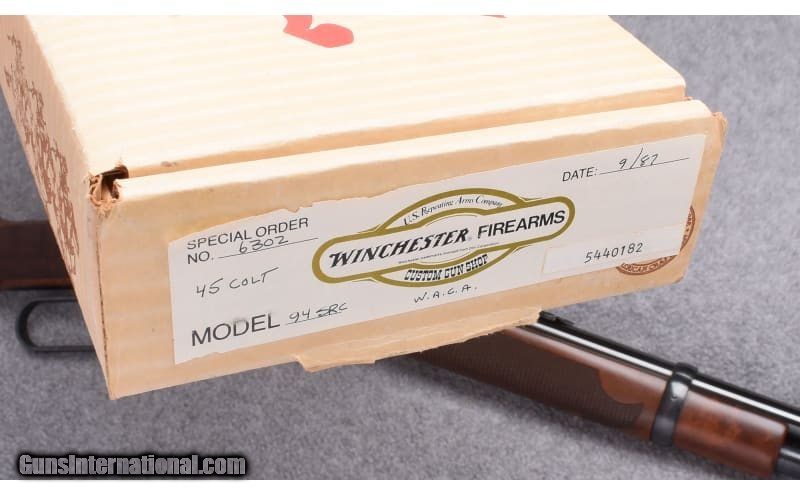 Description: Winchester Model 94 angle eject, saddle ring carbine . Collector edition offered by the Winchester Arms Collector Association. Very clean New Haven production rifle show few handling marks, small areas of oxidation above the forearm on the left. Pre-owned, includes factory box. .45 Long Colt SOLD Metal Condition: Blued Wood Condition: Checkered Walnut Bore Condition: Excellent Barrels: 16 inch Fore End: Checkered Walnut Butt Pad: Blued Steel Carbine Style Weight: 5 lbs 12 oz Sights: "Buckhorn Rear Sight, Post Front Item Location: Buda, TX |