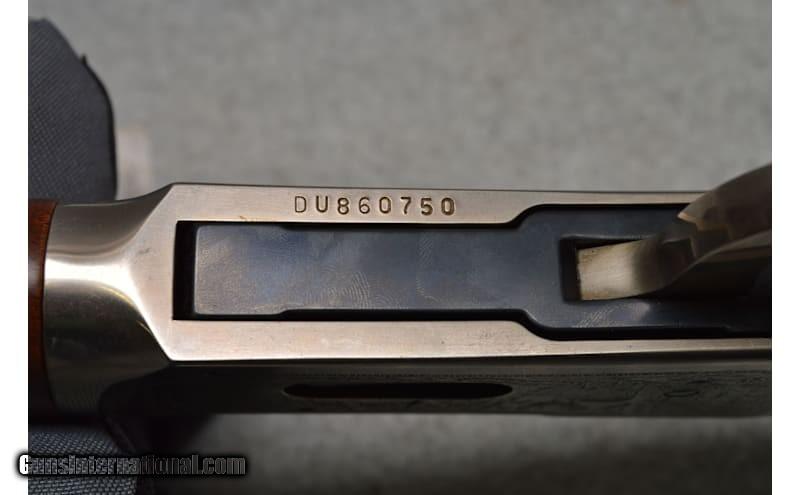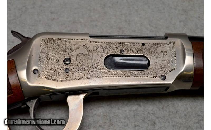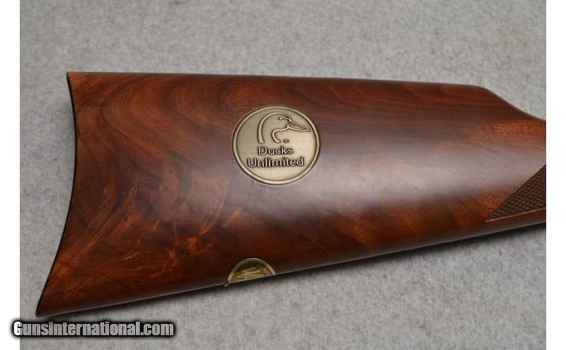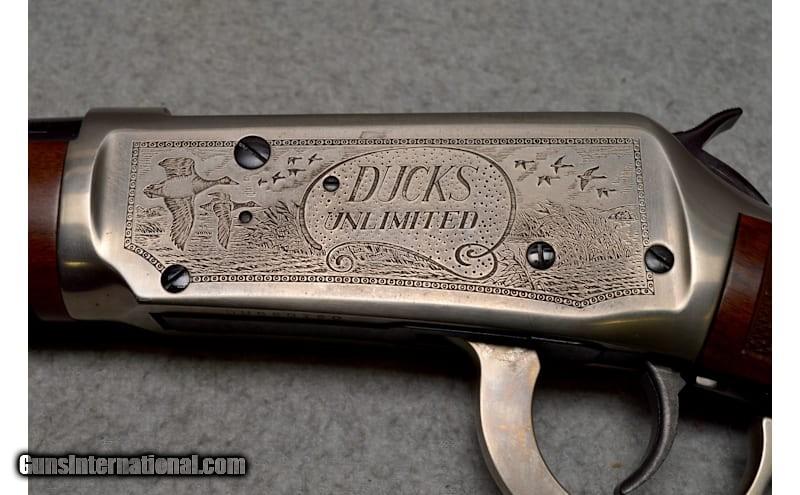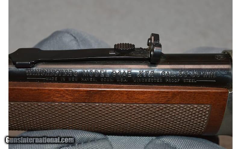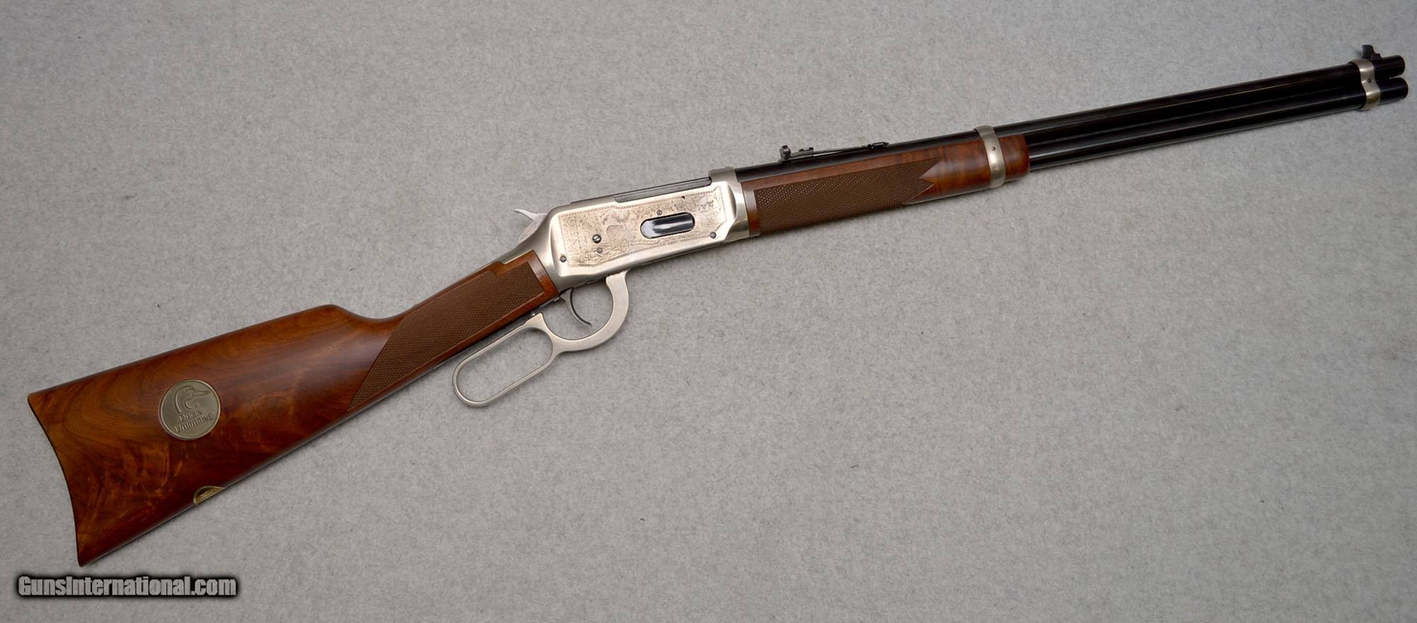 Winchester 94AE Lever Action Rifle Ducks Unlimited .30/30 in excellent condition. 30-30 Winchester, 20" barrel w/ open sights. Full length magazine. Antique silver finished action w/ DU Canada motifs on left side, right side has game scene w/ white tail deer. Carbine forearm & straight grip stock of satin finish fancy walnut w/ steel crescent buttplate & spade pattern cut checkering. Right side of stock has DU Canada medallion. CONDITION: over 99% metal finish. .30-30 Winchester