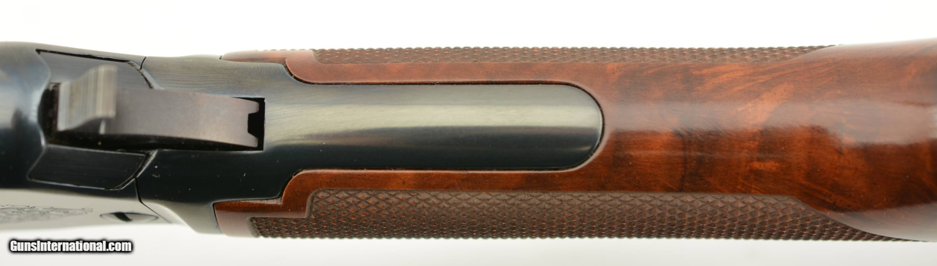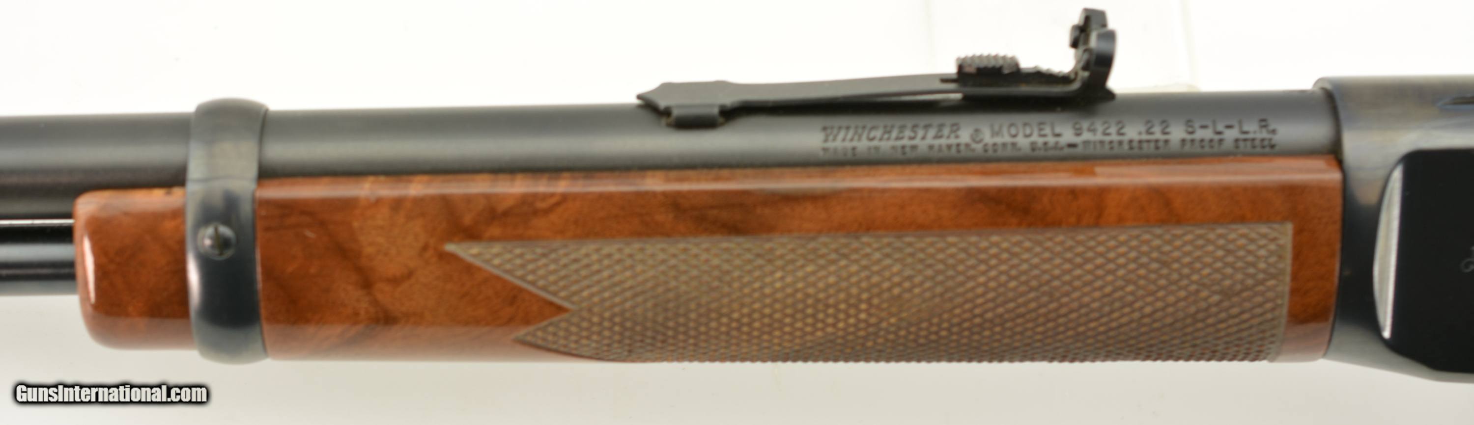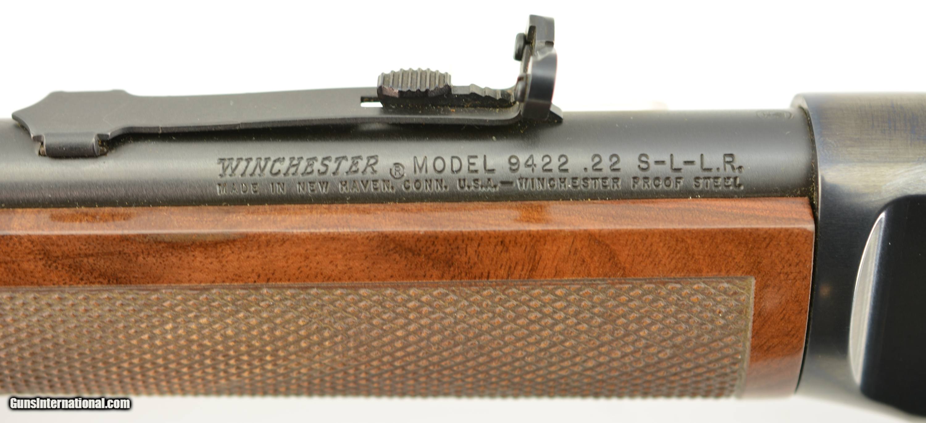 Description: Serial #F676480, .22 S,L,LR, 20 ½ inch barrel with a bright, excellent bore. This is the High-Grade Winchester Model 9422 manufactured from 1995-96 only featuring an engraved receiver with raccoon on the left side of the receiver and coonhound on the right with checkered deluxe, full figured feathered crotch walnut stock and forearm. The lever action rifle is in excellent plus condition retaining virtually all, 98-99% of the original blue finish on the metal surfaces with only faint handling marks. The high gloss finished stock and forearm are likewise excellent with some tiny storage and handling blemishes. A beautiful engraved 9422 High-Grade that remains in very high condition. FFL SOLD Manufacturer: Winchester Model: 9422 Serial Number: F676480 Caliber Info: .22 LR Gauge Info: .22 LR |