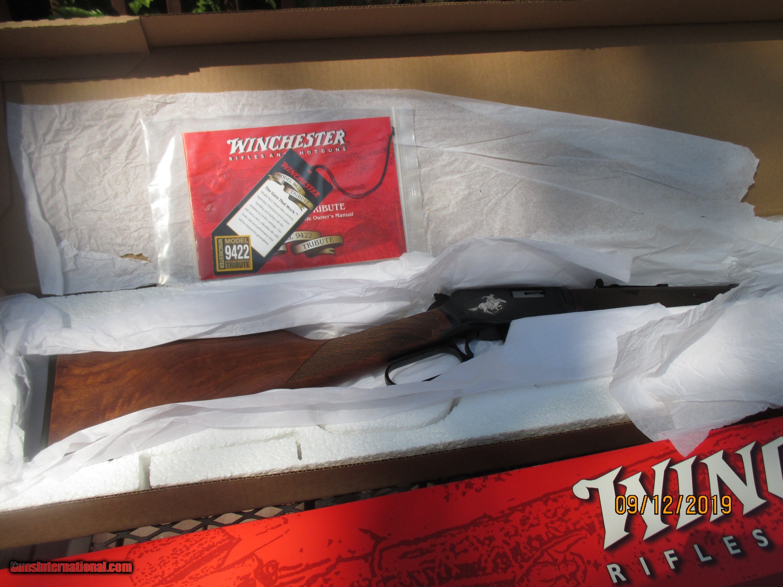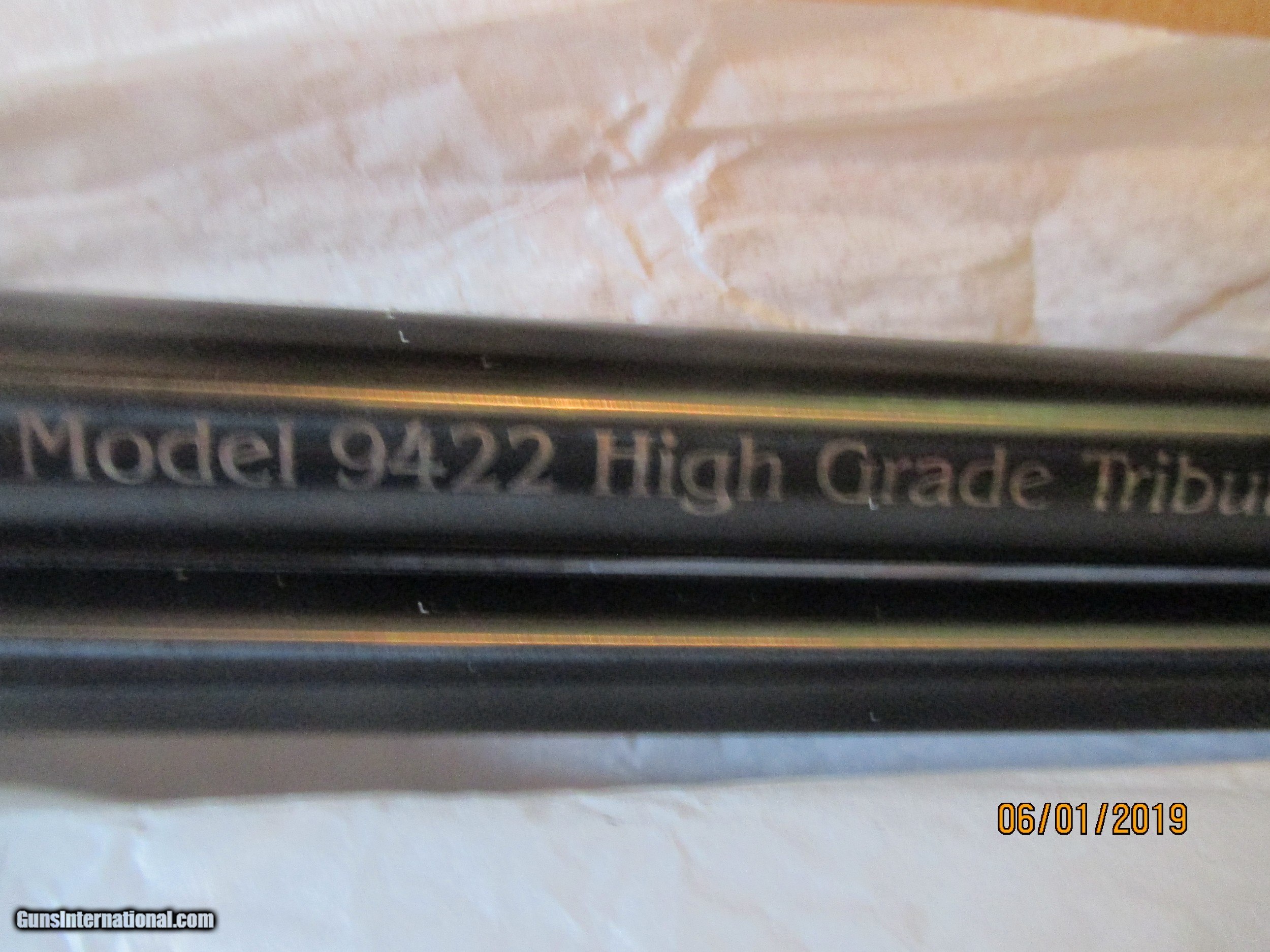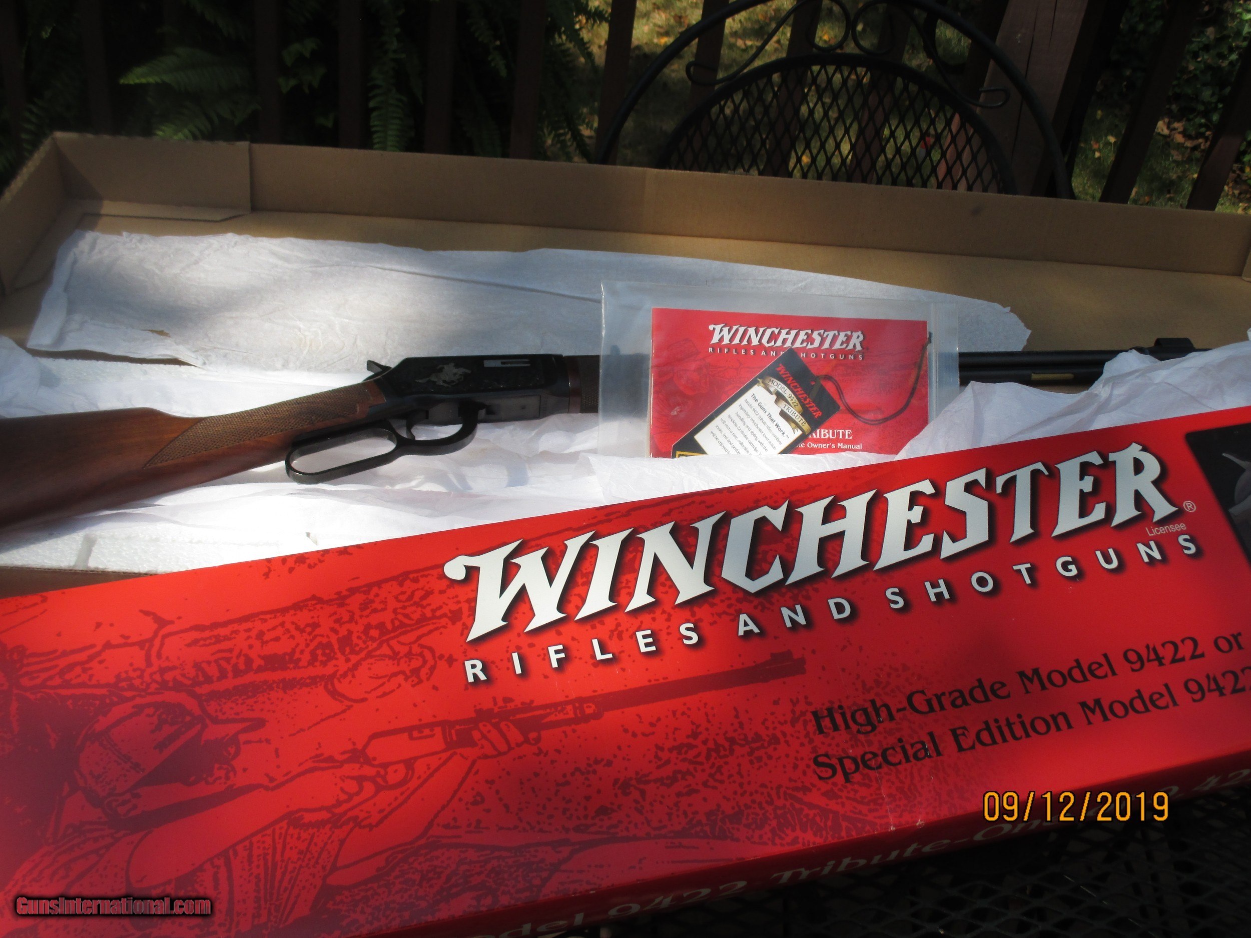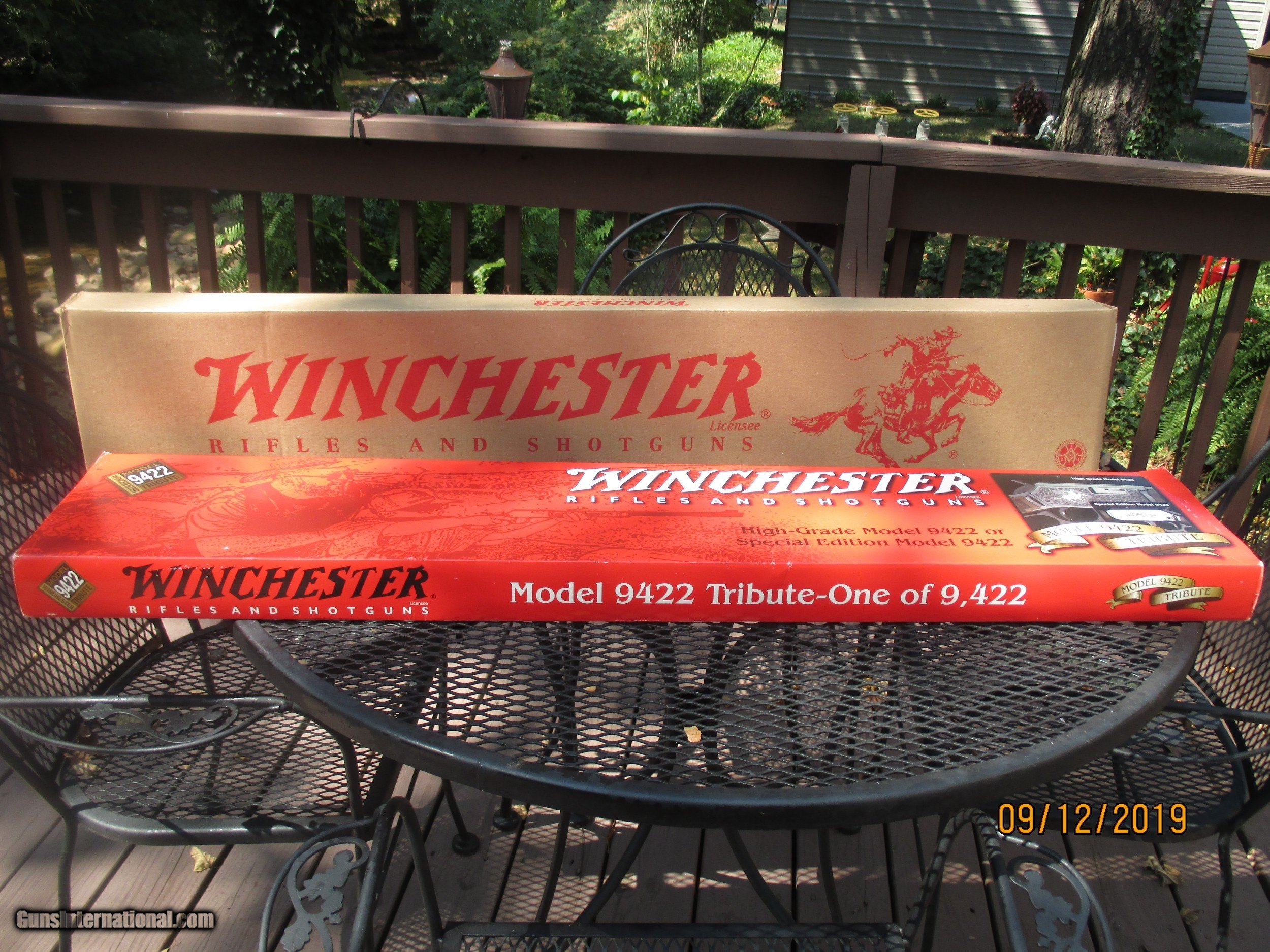 Description: Offered is another eye appealing Winchester lever action from New Haven, CT... This 15 year old special edition 9422 was made in very limited quantity of 9,422 units between 2205-2006...It is in NIB, Un-fired condition and comes with original paperwork and box... Beautiful deep bluing % checkered satin wood... Engraved silver inlays of Winchester's iconic horse& rider on one side and banner of "model 9422 Tribute" on the other. Would make a very nice rifle for your collection or a great christmas gift to that special person.$1875. SOLD Manufacturer: Winchester Model: 9422 Caliber Info: 22 Condition: new Metal Condition: excellent Wood Condition: excellent Bore Condition: excelletn Barrels: excellent Action: leaver |