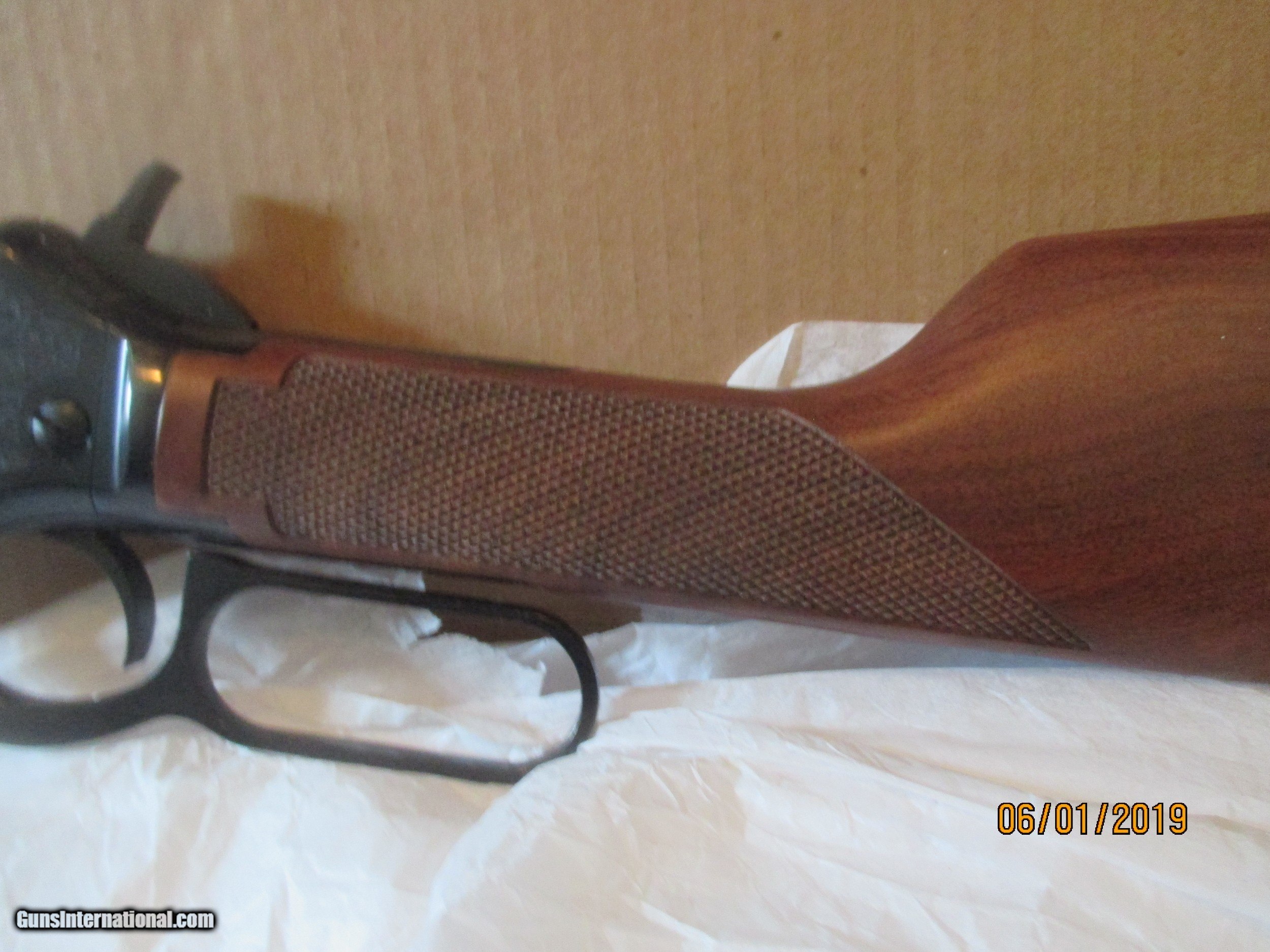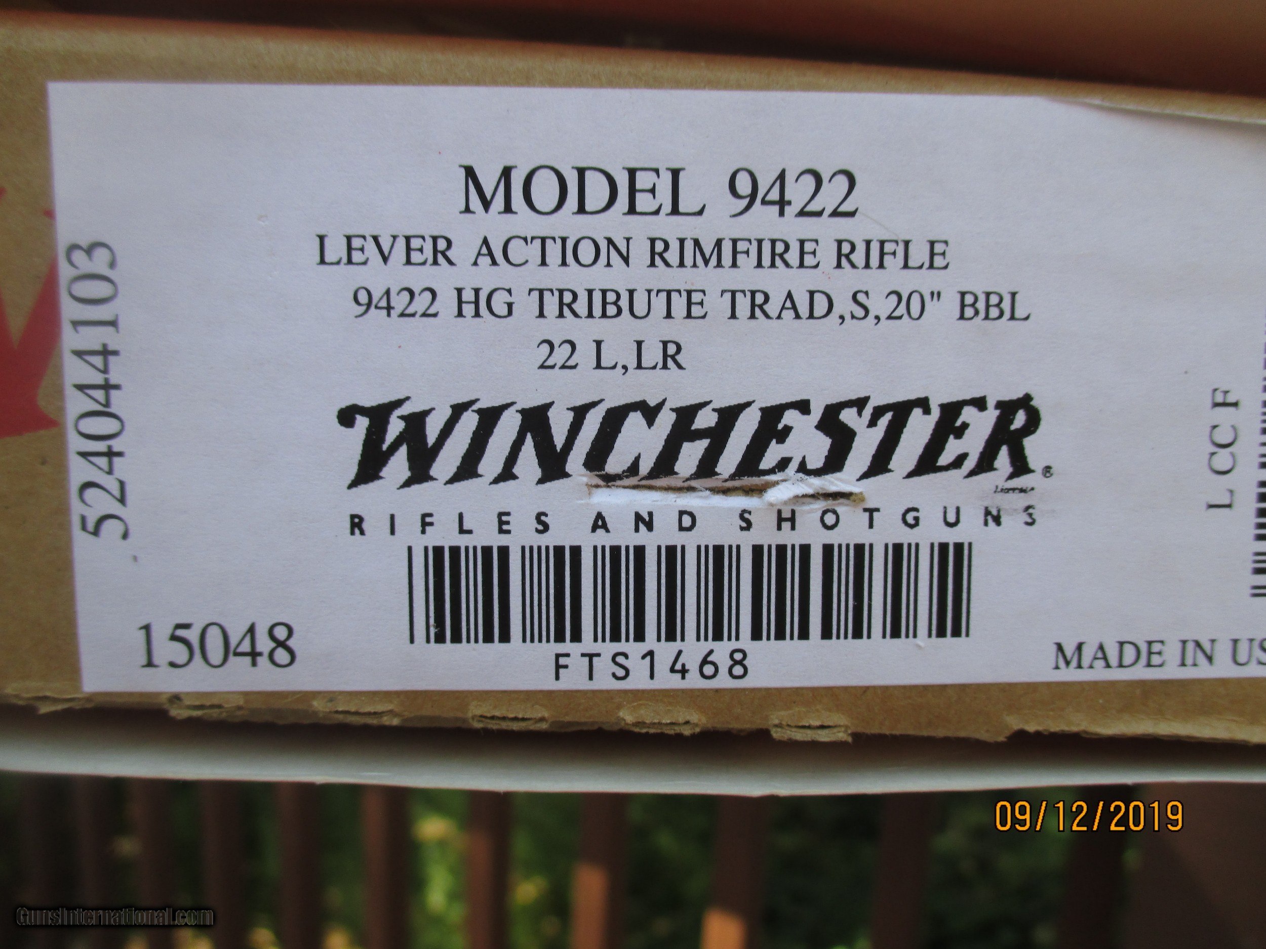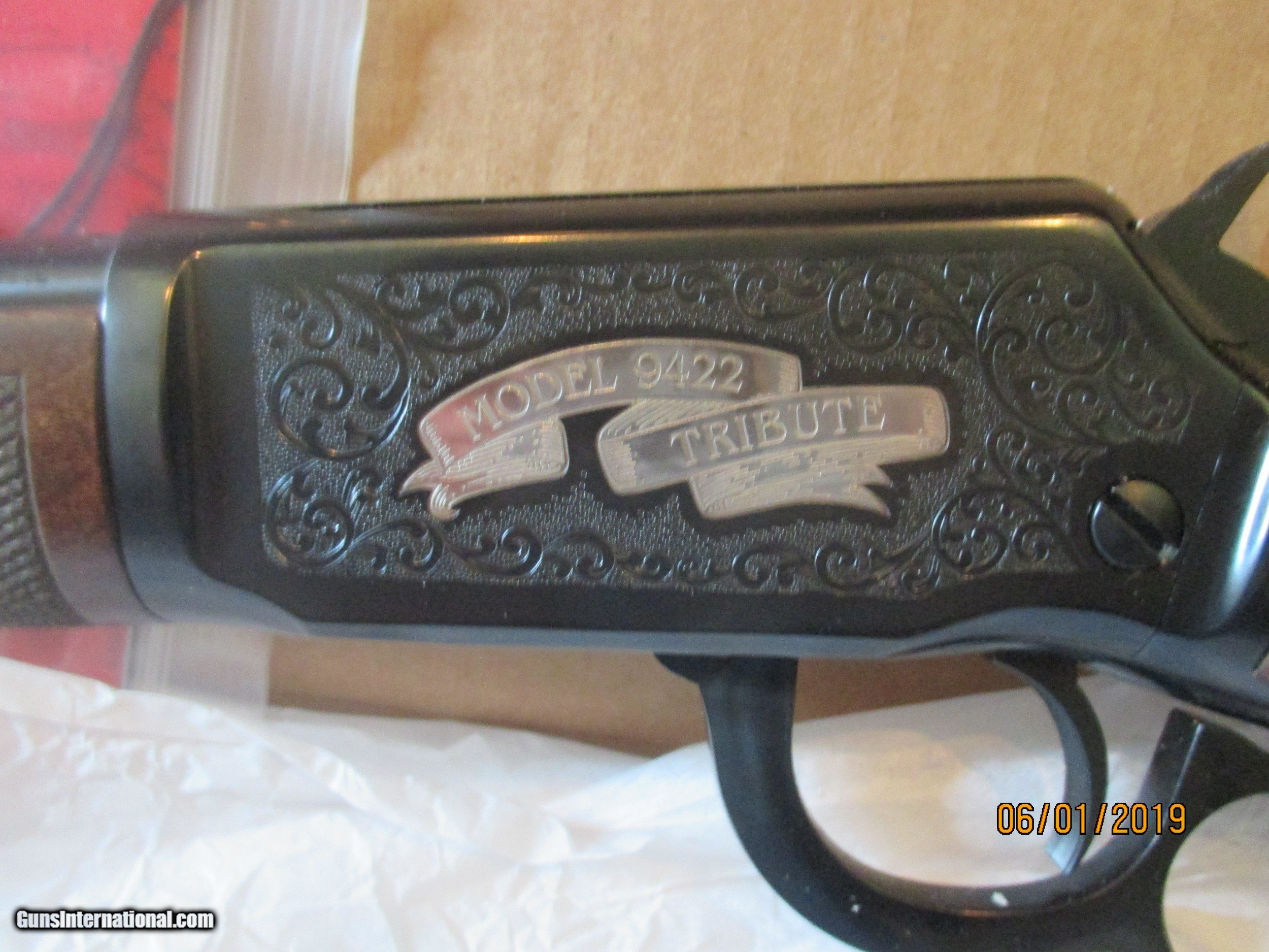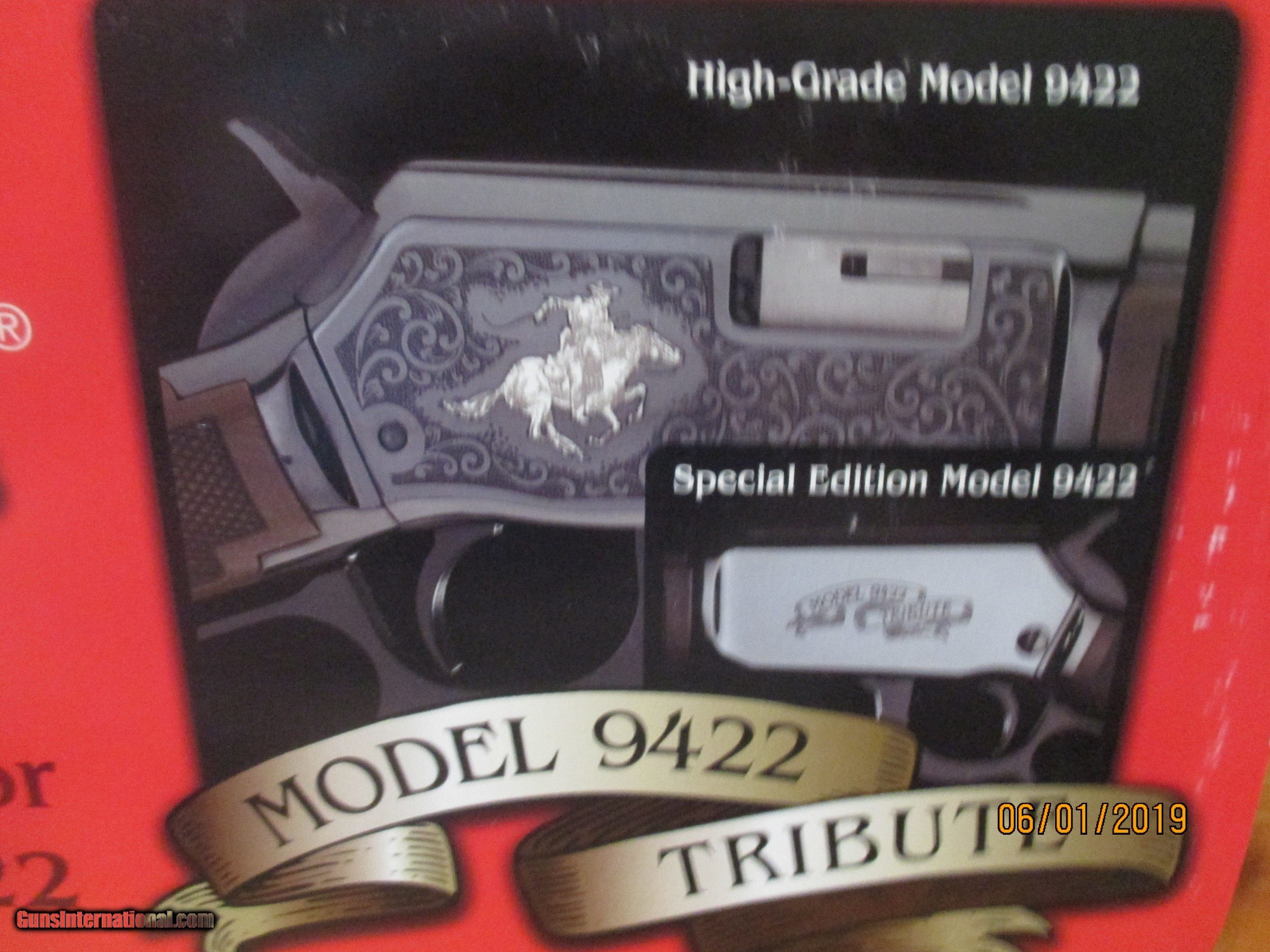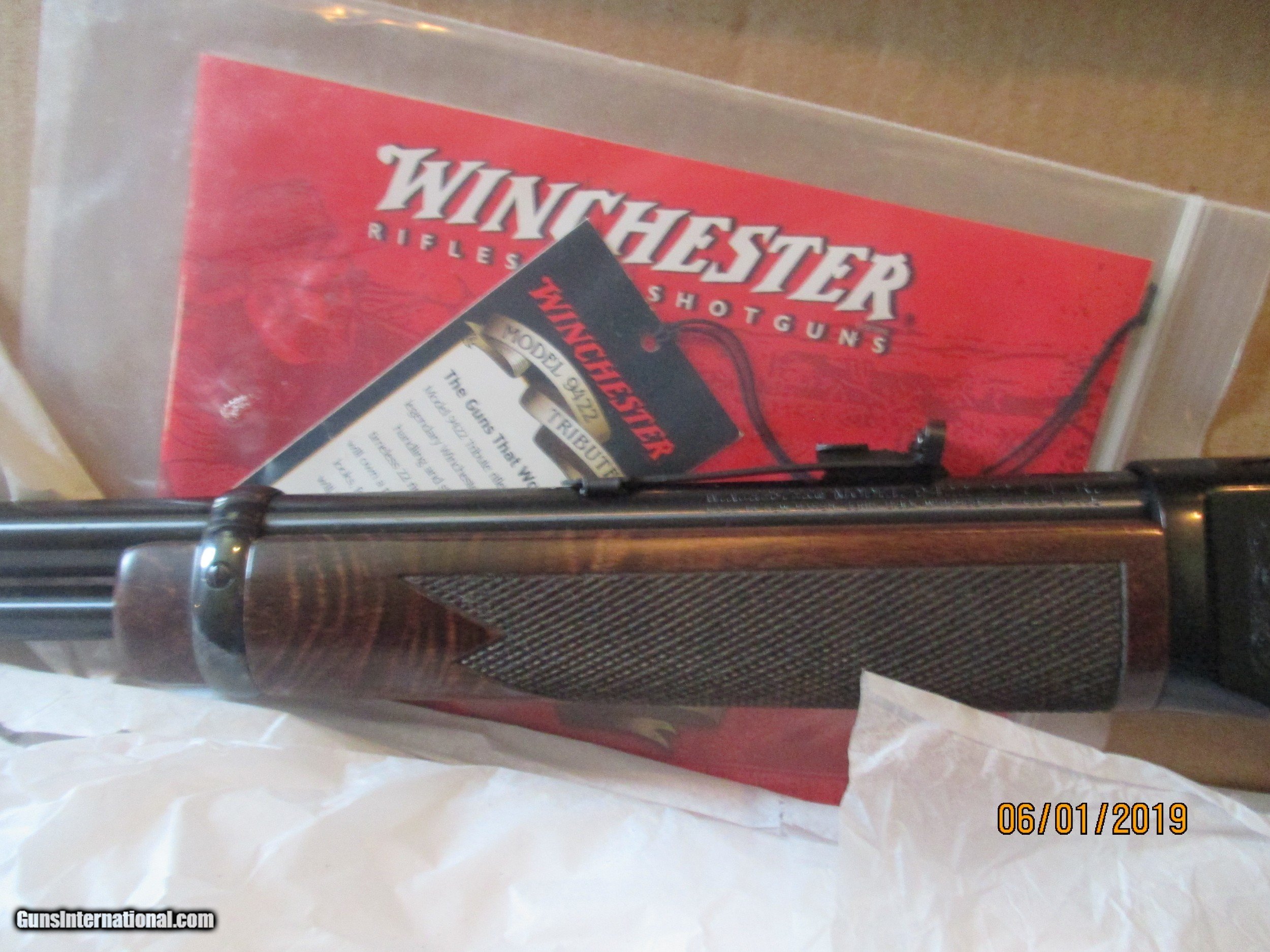 Description: Offered is another eye appealing Winchester lever action from New Haven, CT... This 15 year old special edition 9422 was made in very limited quantity of 9,422 units between 2205-2006...It is in NIB, Un-fired condition and comes with original paperwork and box... Beautiful deep bluing % checkered satin wood... Engraved silver inlays of Winchester's iconic horse& rider on one side and banner of "model 9422 Tribute" on the other. Would make a very nice rifle for your collection or a great christmas gift to that special person.$1875. SOLD Manufacturer: Winchester Model: 9422 Caliber Info: 22 Condition: new Metal Condition: excellent Wood Condition: excellent Bore Condition: excelletn Barrels: excellent Action: leaver |
