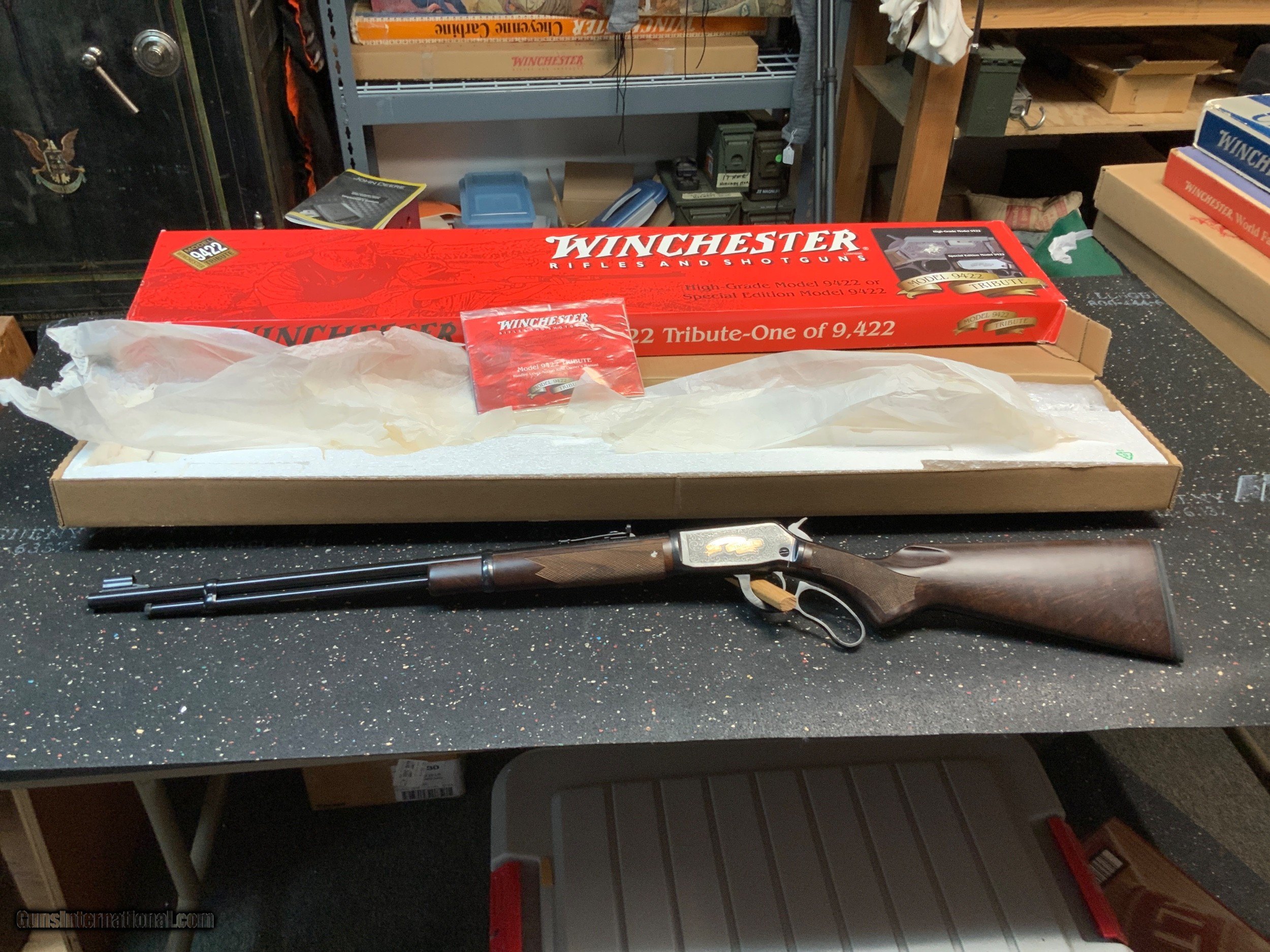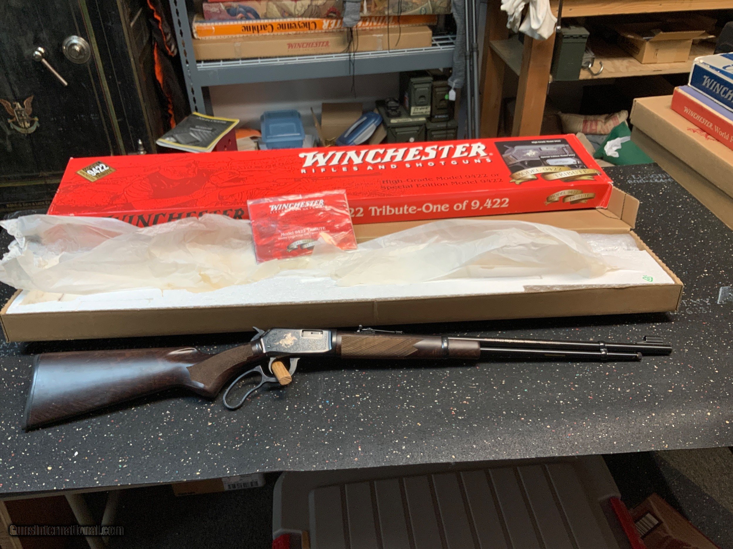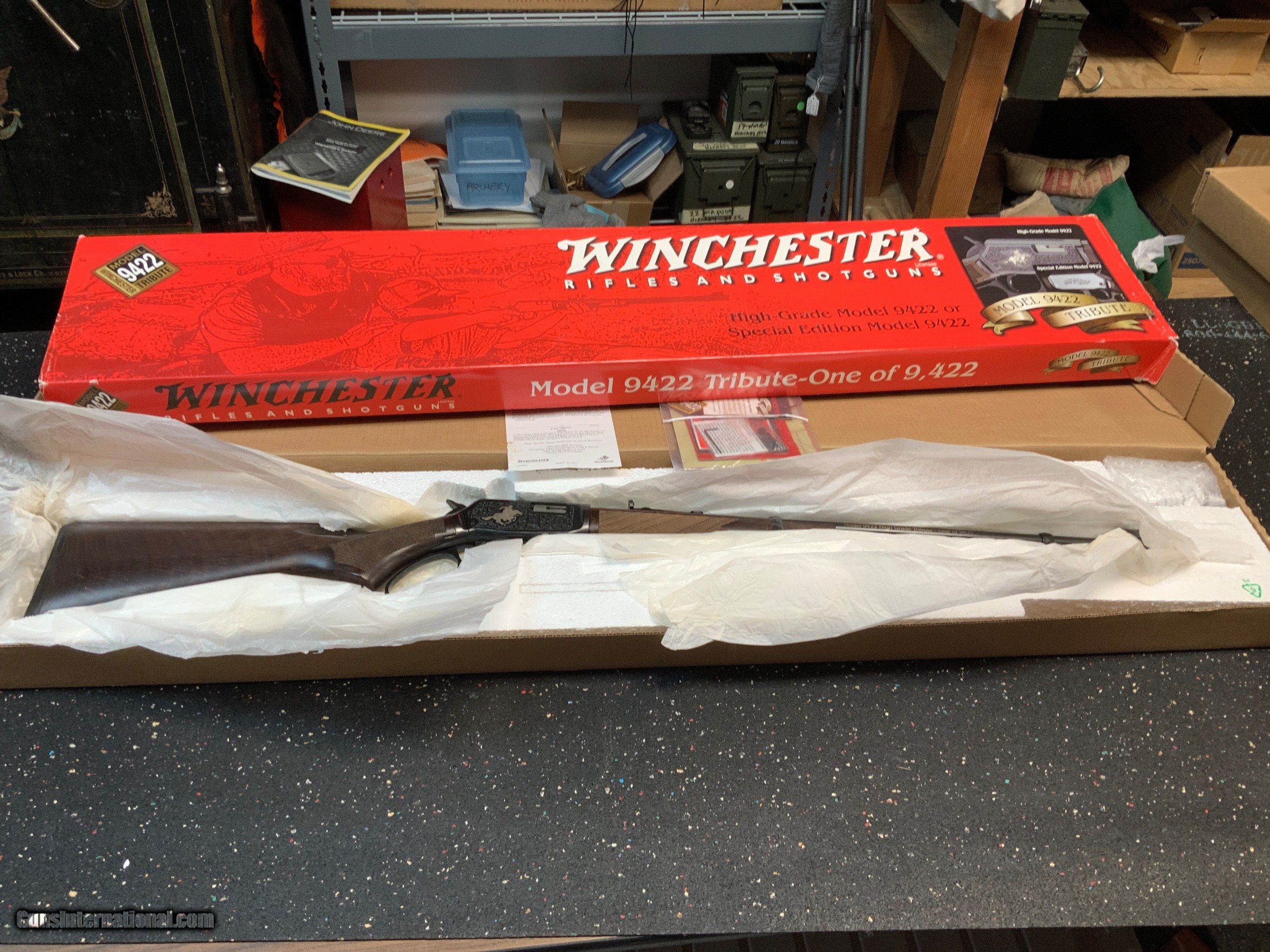 Description: Winchester model 9422 22 long rifle in the High grade Final Tribute Legacy version. Absolutely new in the box with paperwork and outer sleeve. This one supports beautiful dark starburst wood as a bonus. These guns are continuously going up in price and make great investments. Pictures tell the story. Please add $50 for shipping and insurance to your FFL. if your FFL will not except from a private party please add $20 for my FFL transfer fee. SOLD Manufacturer: Winchester Model: 9422 HG Legacy Barrel Length: 22 1/2” Caliber Info: 22 L, L RIFLE Condition: Excellent Metal Condition: Excellent Wood Condition: Excellent Bore Condition: Excellent Action: Lever Finish: Hi- Grade |