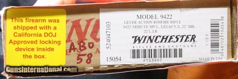 Description: .22rf, s/l/lr, #FTS3997, 22 1/2 inch barrel, blue finish, Winchester Rider engraved on receiver, walnut checkered pistol grip stock, checkered walnut forearm, original sights, original box, Made in USA Condition: NIB SOLD |