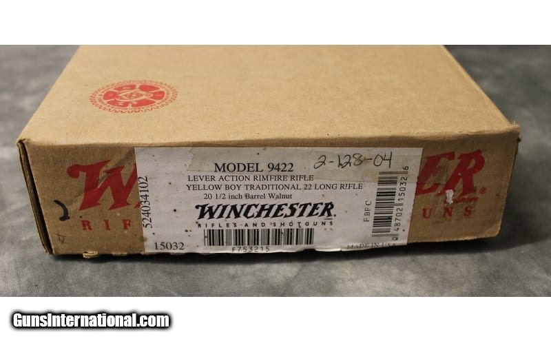 Description: Winchester 9422 Yellow Boy with the original box and hang tag in ANIB condition. These where produced in 2003 with only 500 LR & 500 Magnums built, from everything I can find out. This one is stamped on the barrel .22 L-LR serial number is F753XXX and appears not to have been shot. .22 Long Rifle SOLD Metal Condition: ANIB Wood Condition: ANIB Bore Condition: ANIB Barrels: 20.5 Item Location: Auburn Hills, MI |