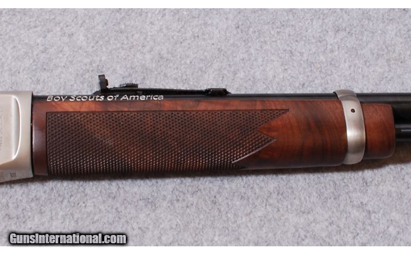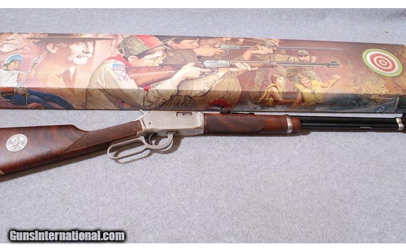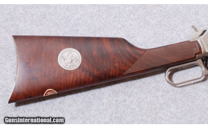 Description: This rifle was a special run to celebrate the 75th Anniversary of The Boy Scouts of America. It comes complete with the box, hang tags, and literature .22 Long Rifle SOLD Chambers: ".22 Short, Long, Long Rifle Metal Condition: As New Wood Condition: As New Bore Condition: Unfired Barrels: 20 Triggers: Factory Stock Dimensions: 13" Length of Pull Butt Pad: Steel Weight: 7 lbs Sights: "Buckhorn Rear, Bead Front Item Location: Rapid City, SD |