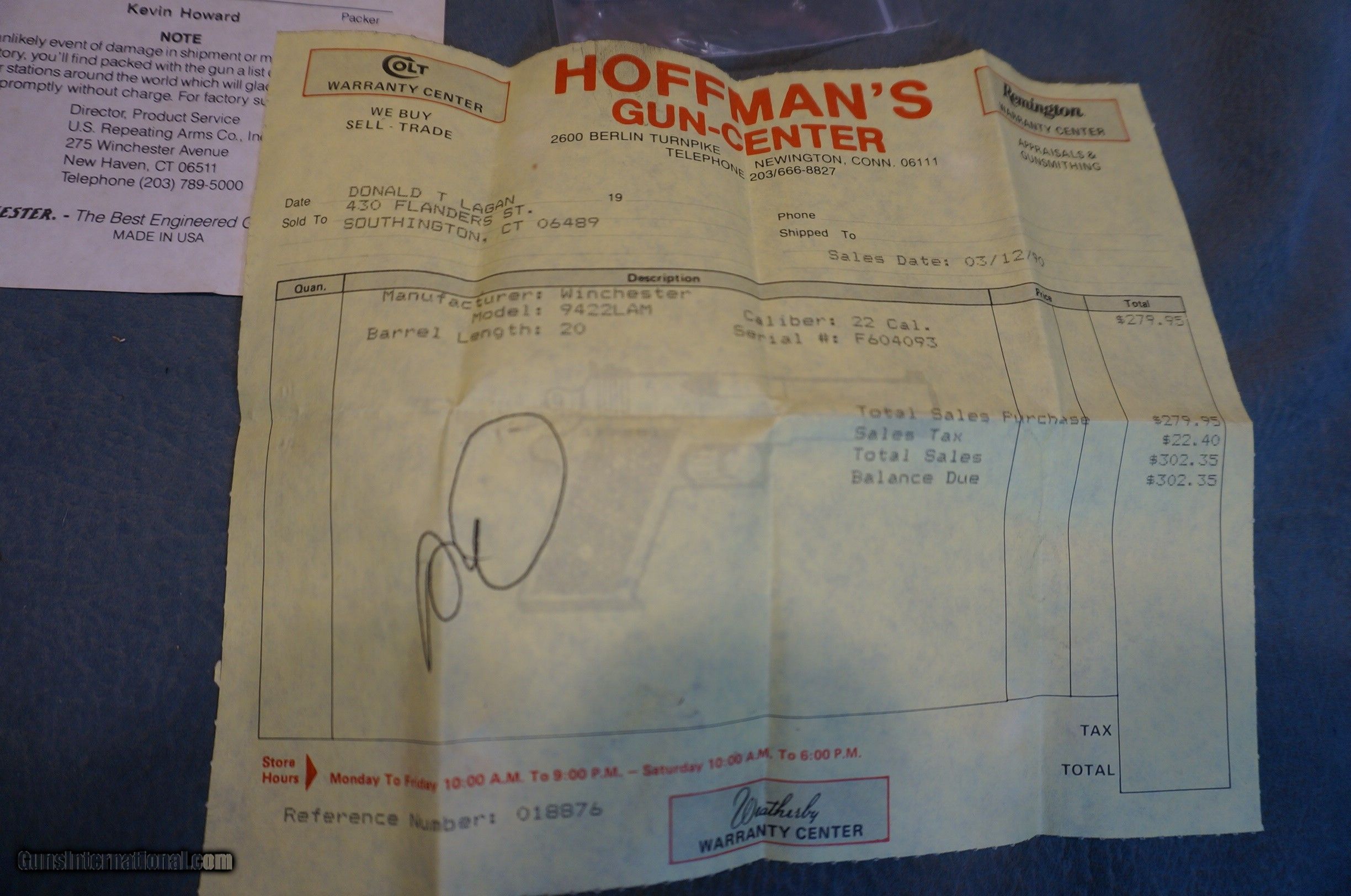 Description: Winchester Model 9422 22S-L-LR Win-Tuff,20 1/2" barrel,serial #F604093,brown laminate stock,excellent condition with the original box,hang tag,hammer extension and sales receipt from Hoffman's Gun Center Newington Conn from 1970. GUN COLLECTIONS WANTED FOR CASH! We buy, sell, consign and trade new and used firearms. This is our 44th year in business. We offer 90 day layaways with 20% down. No return on layaways. Firearms will need to be transferred through a FFL dealer. Prices reflect a cash discount. There will be 3% added to credit card sales. We trade for gold and silver. THANK YOU! SOLD |
