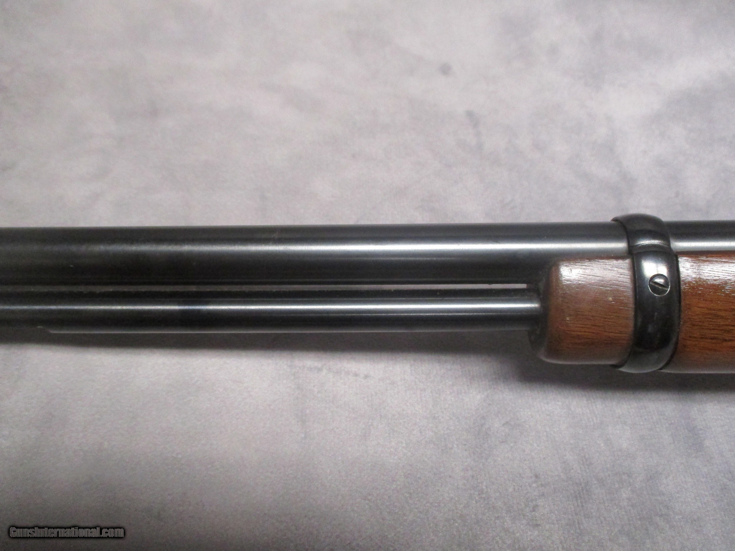 Description: Winchester has always been well-known for their .22 rifles whether it be a bolt action (Models 52, 69, 72, 75, etc. …), pump action (Models 1890, 1906, 61, 62), semi-automatic (Models 1903, 63, 77), or lever action (Models 250, 255, 9422). Introduced in 1972, the Model 9422 is a very beautiful rifle and well-known for its functionality and wide range of applications. As the first two digits in the model number indicate, the 9422 is based upon the Winchester Model 94, originally known as the Model 1894. The 9422 is a smaller version of the 94 chambered for the popular .22 Long Rifle. As a lever action, it will also chamber and fire the .22 Long and .22 Short with ease. The 9422 shown was produced in 1974 and is therefore an early production rifle. It shows signs of wear commonly found on well-used rifles but does retain the majority of its finish. The butt plate oddly has some “bug” holes in the surface. This is unusual as this type of wear is commonly found on older rifles whose butt plates were made of buffalo horn. Some insects would chew through the horn and leave small holes in the butt plates. Why that would be the case here for a plastic butt plate is not certain. The stock exhibits spots of finish loss and some small nicks in the wood. There are two spots of finish loss on the left hand side of the receiver, and a smaller one above the ejection port on the right hand side. There is a spot of rust on the front sight protector. The bore is in extremely good condition and the rifle should be very accurate. There is no box at this time. SOLD Rifle Caliber: .22 Long Rifle, .22 Short, .22 Long Manufacturer: Winchester Repeating Arms Co. Model: 9422 Serial Number: F122315 Bore: Rifled Condition: Good Barrel Type: Standard Action: Lever action Triggers: Single Stock: Walnut, straight grip Fore End: Walnut Butt Pad: Checkered plastic plate LOP: 13.625 inches (346.075mm) Finish: Blued Weight: 6.25 lbs. Sights: Adjustable, semi-buckhorn rear, ramp front sight w/hood, sight radius 17.0 inches (432mm) Manufacture Date: 1974 |
