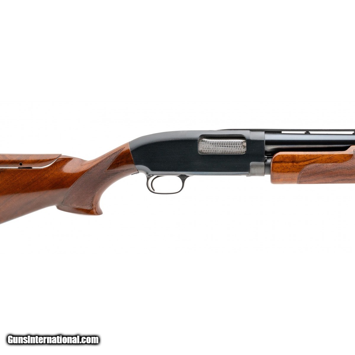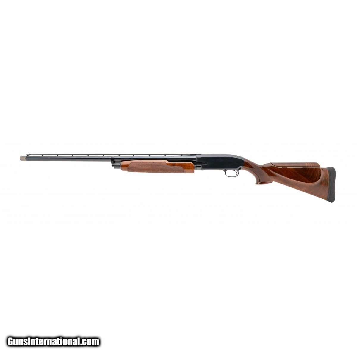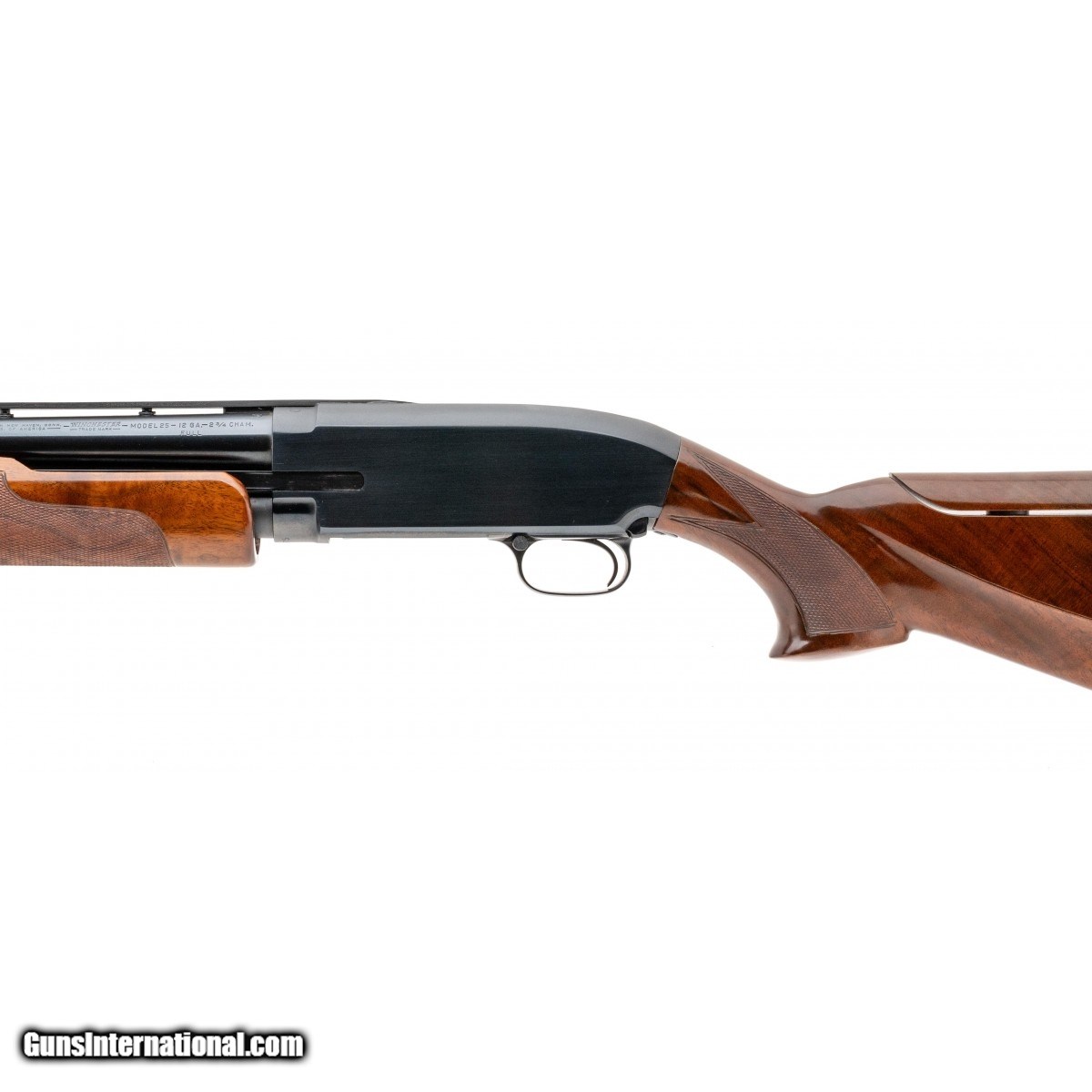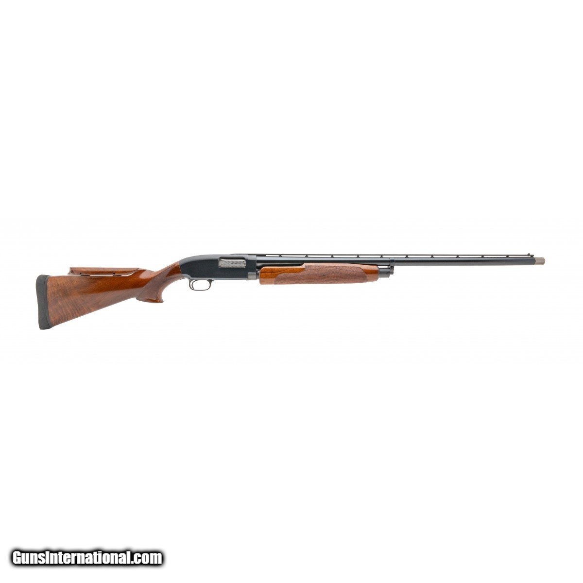 SN: 38475. Made in the 1950's, 12ga with a 28"" Full choke vent rib barrel. Bore is excellent. Pump action Trap gun with factory vent rib barrel and custom stock. The barrel has been ported and has Briley chokes installed. The metal is excellent with 99% original blue. The stock is custom made with a cheekpiece and adjustable comb. LOP is 14.25"". The forend is checkered and wide. The wood is excellent. Overall excellent condition, with extra choke tubes. Consignment.