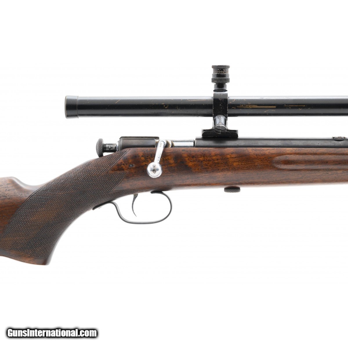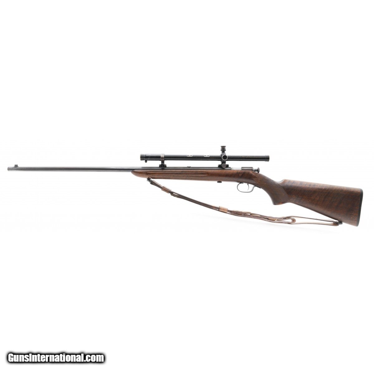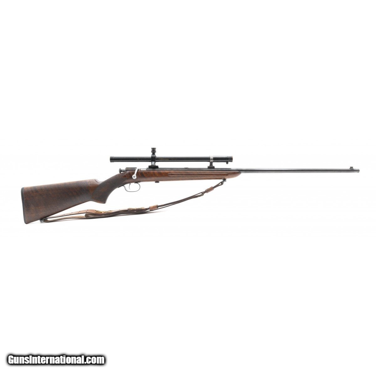 Description: " Attractive single shot bolt action rifle. Rifle has scope mount blocks with a 4X Wollensak scope. Optics are clear. Bore is excellent. Stock has been nicely checkered at wrist. Very good overall condition. SOLD |