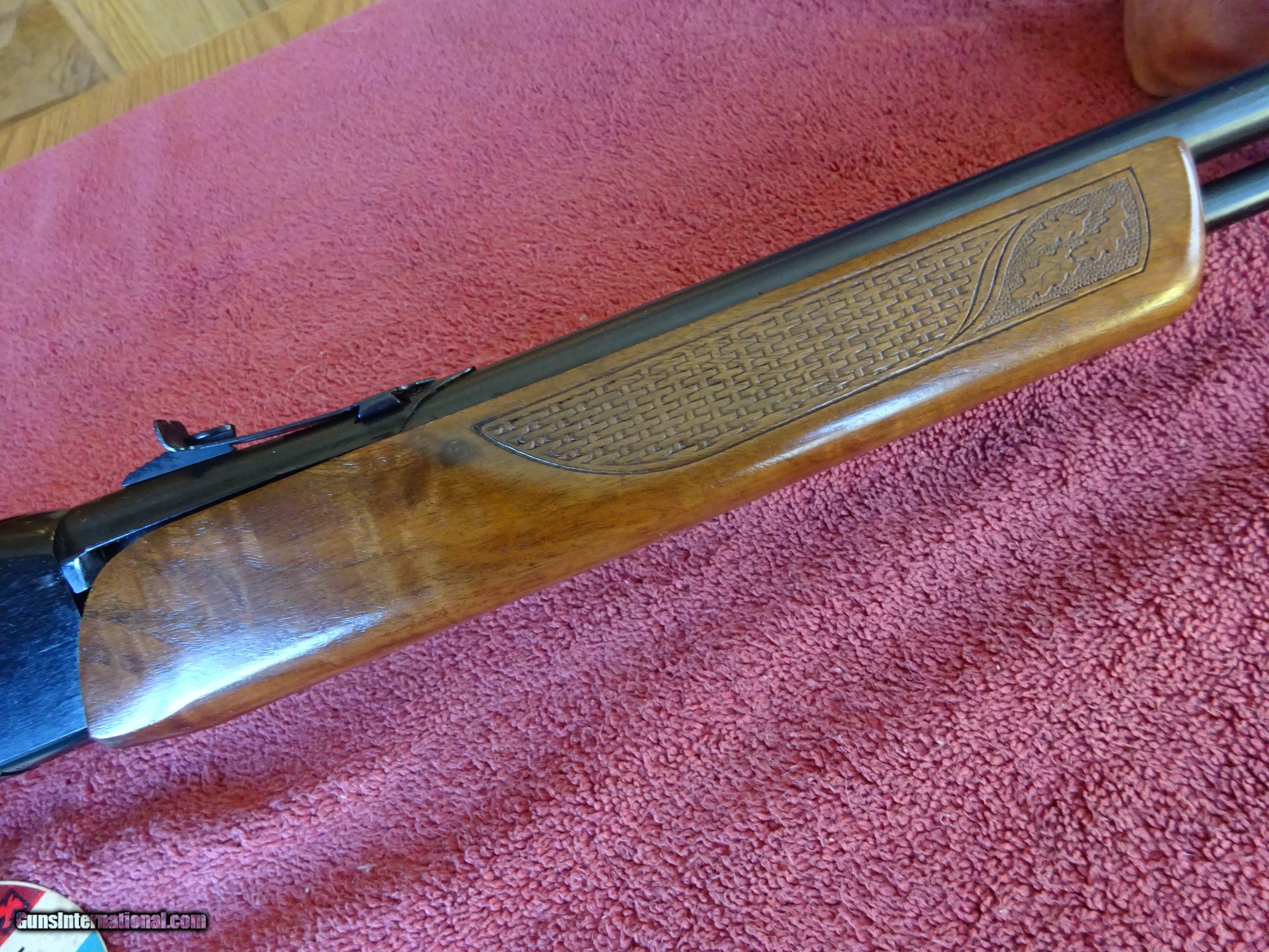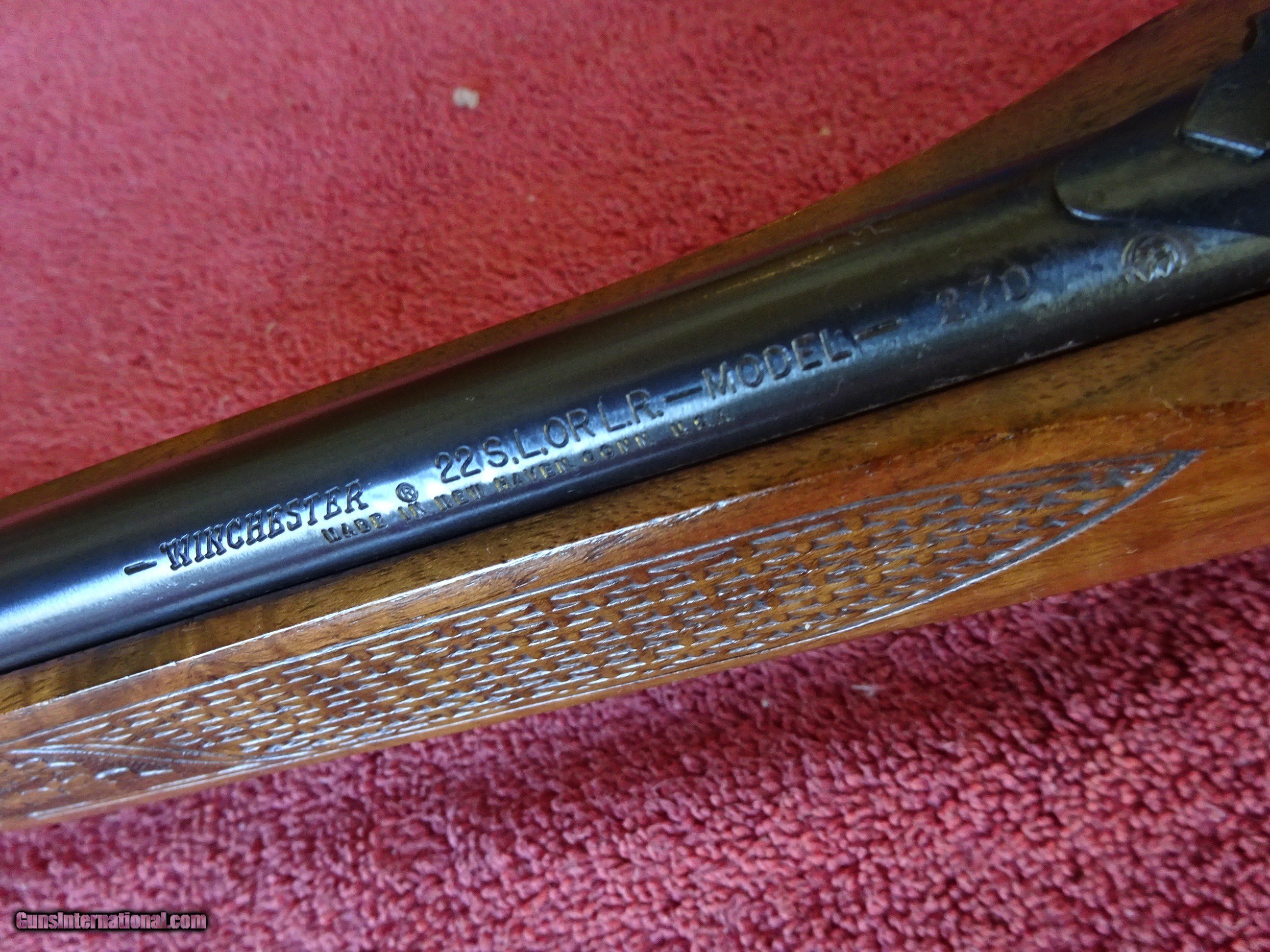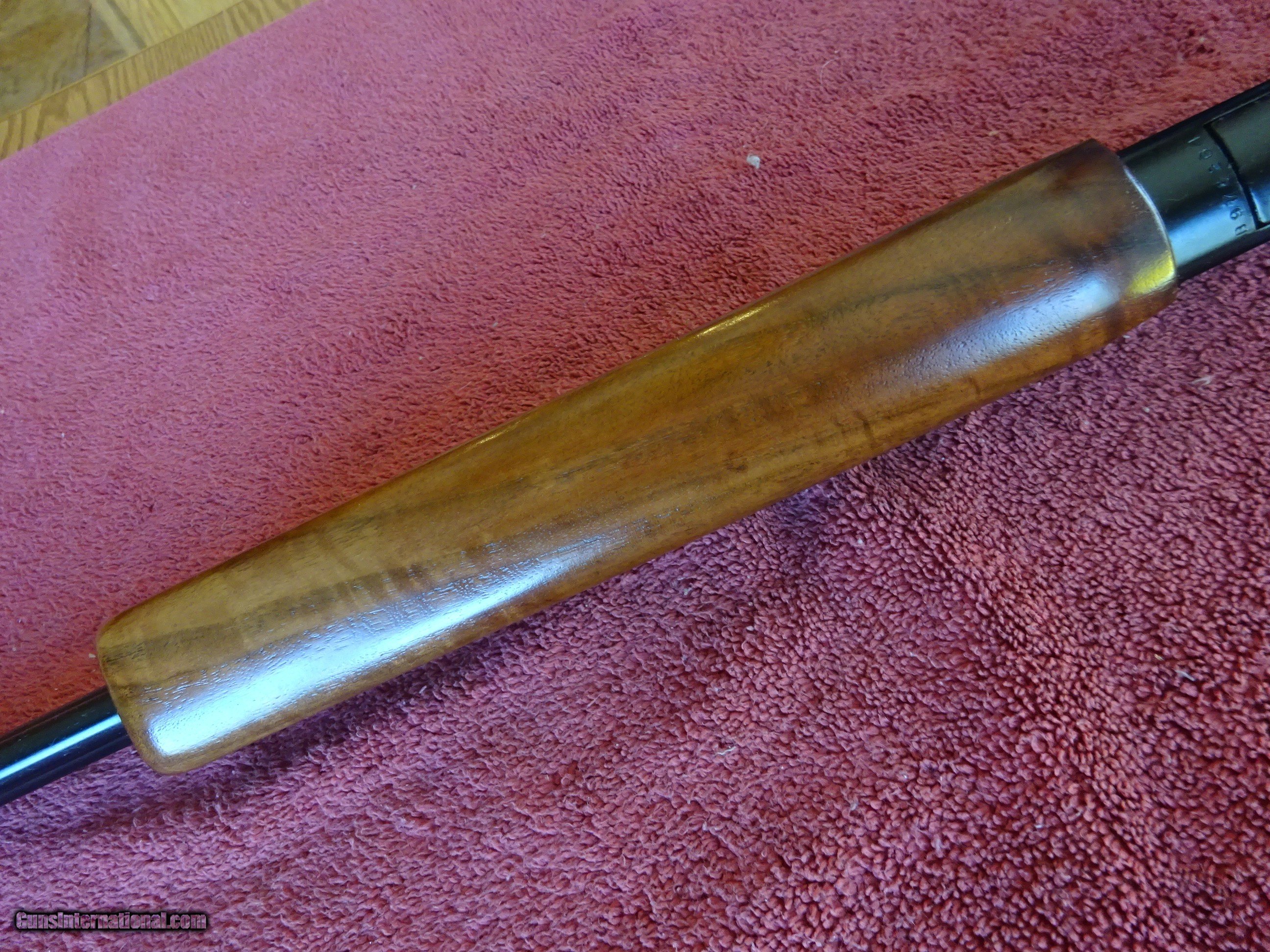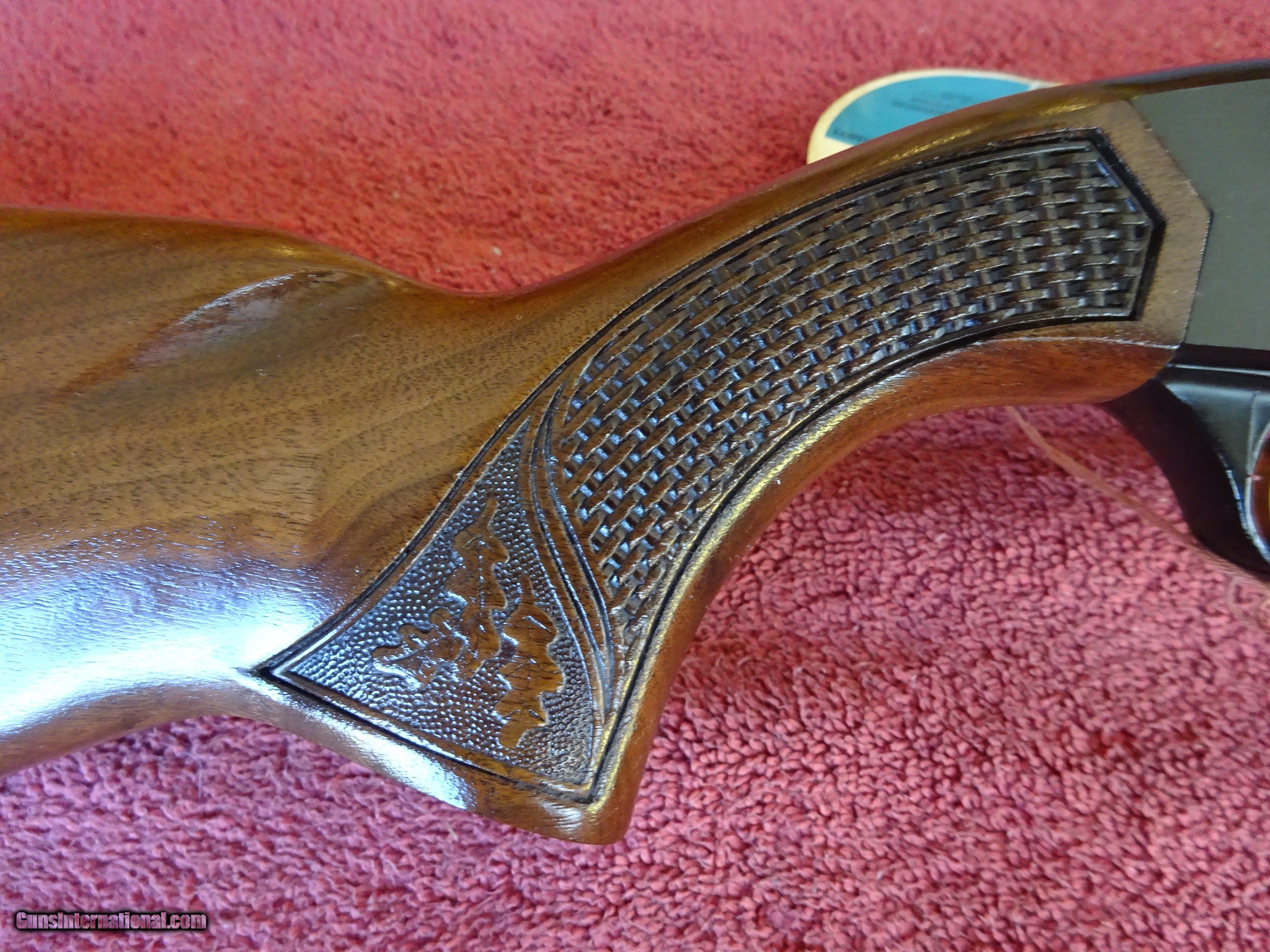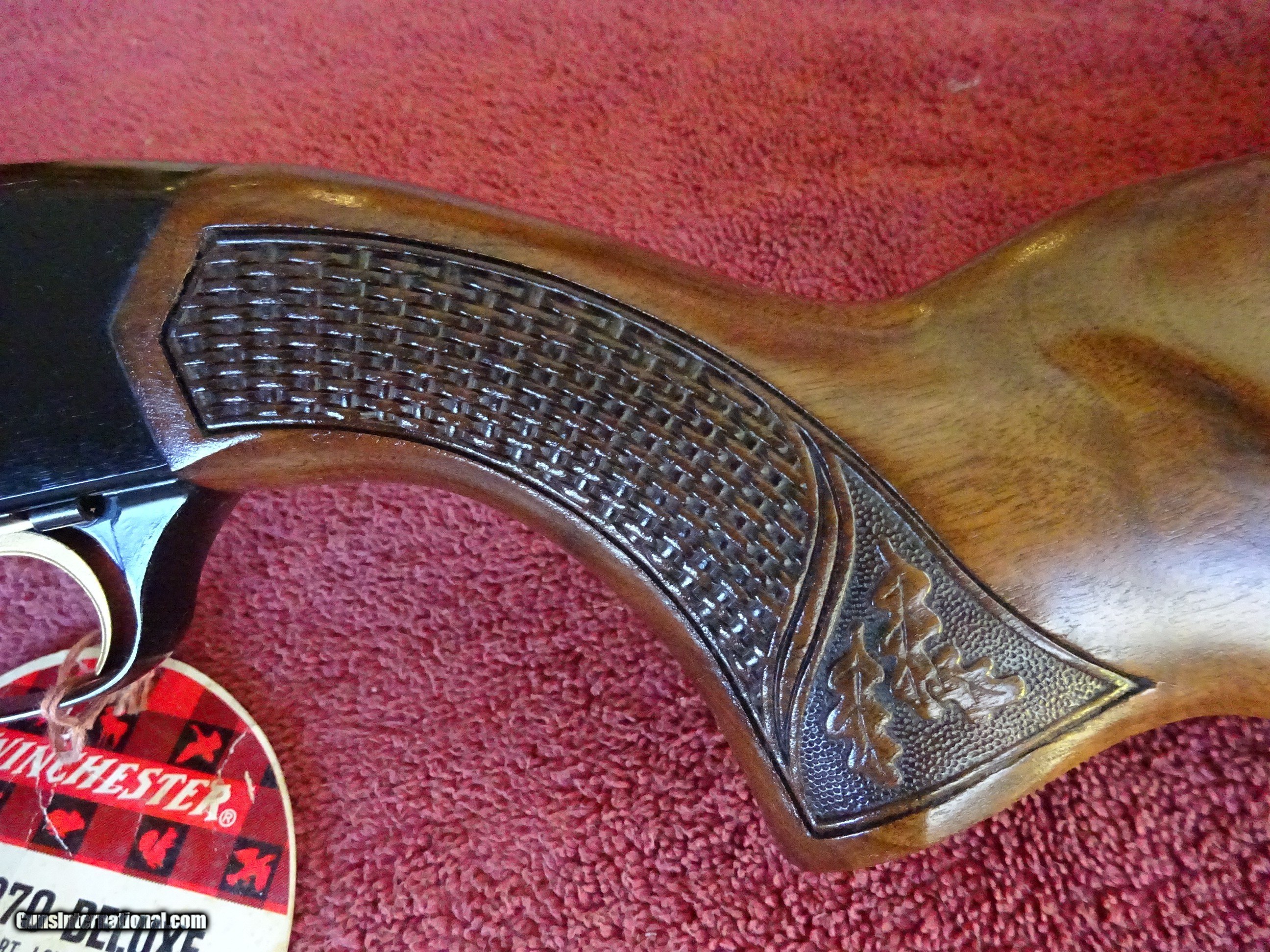 Description: WINCHESTER MODEL 270 DELUXE, SLIDE ACTION 22 SHORT, LONG & LONG RIFLE, 20 1/2" BARREL, 100% BLUE, MIRROR PERFECT BORE, RAMP FIXED FRONT SIGHT, STEP ADJUSTABLE REAR SIGHT. GOLD TRIGGER AND SAFETY, GROOVED RECEIVER. PISTOL GRIP MONTE CARLO STOCK, SEMI-BEAVERTAIL FOREARM, HIGHLY FIGURED AMERICAN WALNUT, INTRICATE BASKET WEAVE AND ACORN LEAF CHECKERING - BOTH ON THE GRIP AND FOREARM, OIL FINISH, WINCHESTER MARKED COMPOSITION BUTTPLATE. THE GUN IS IN 100% NEW ORIGINAL CONDITION, NO HANDLING MARKS ANYWHERE. INCLUDES ORIGINAL HANG TAG BUT NO BOX. MADE FROM 1965 TO 1973. THE DELUXE MODEL RARELY COMES UP FOR SALE. NICE GUN. $1275.00 + $70.00 Insured shipping to an FFL address. Layaway is available. See all Pats gun listings on this site! We also have hundreds of ORIGINAL gun company advertising & memorabilia pieces available for sale on our site SPORTINGCOLLECTIBLES. We have no reprints or reproductions. Email for more information. SOLD |