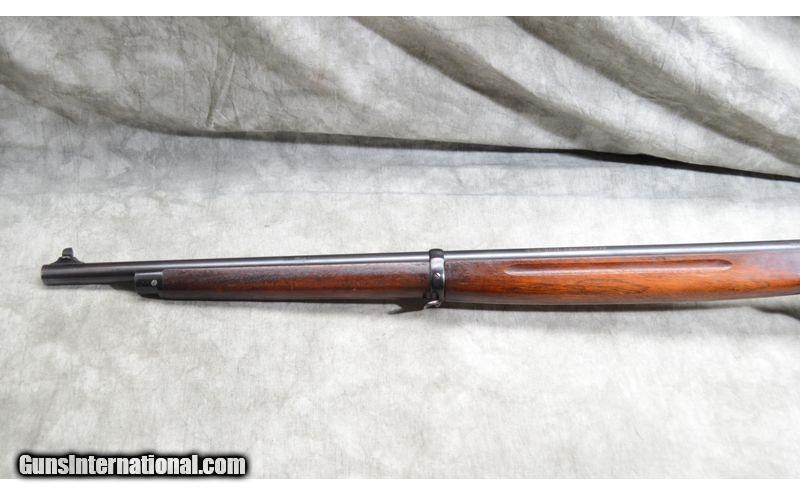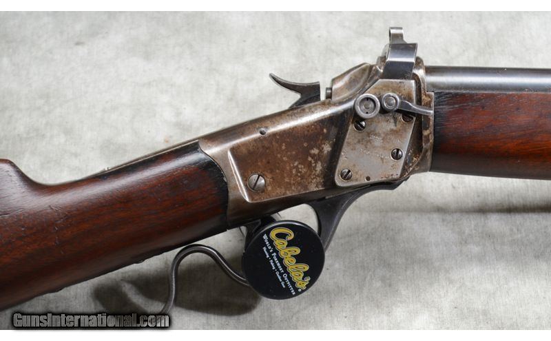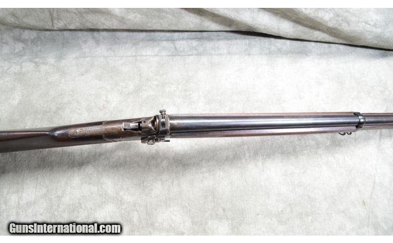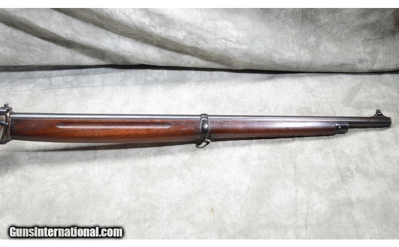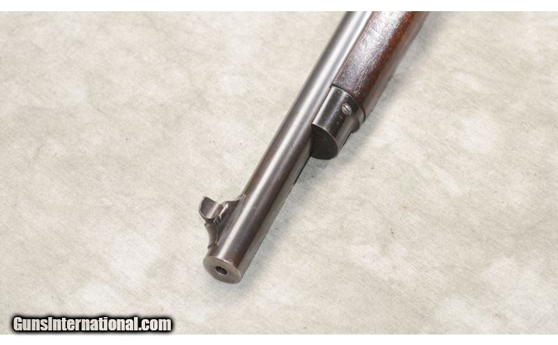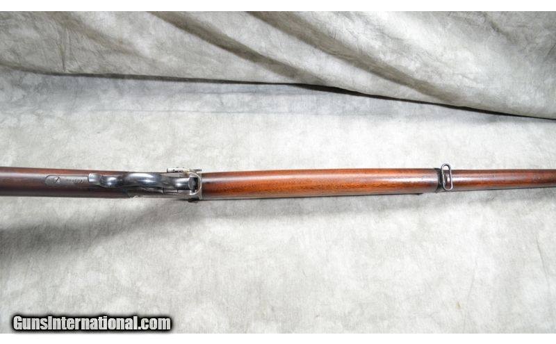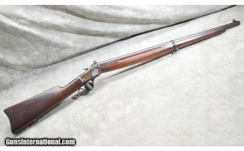 Description: This falling block rifle features musket-length stock, post and peep sights, curved steel butt plate and has US "Bomb" stamping. .22 Short SOLD Chambers: Single shot falling block. Metal Condition: "Very good. Stampings are sharp, and retains blue on the barrel and protected places. There is some shallow pitting on the receiver. Wood Condition: Very good. May have been refinished but hard to tell. The wood stands proud to most of the metal. Barrels: "28 Inch, blue, with sights. Triggers: Factory trigger. Stock Dimensions: 13 - 1/4 inch LOP. Fore End: Matching smooth walnut with finger groove. Butt Pad: Curved steel plate. Sights: Post and peep "iron" sights. Item Location: Rogers |