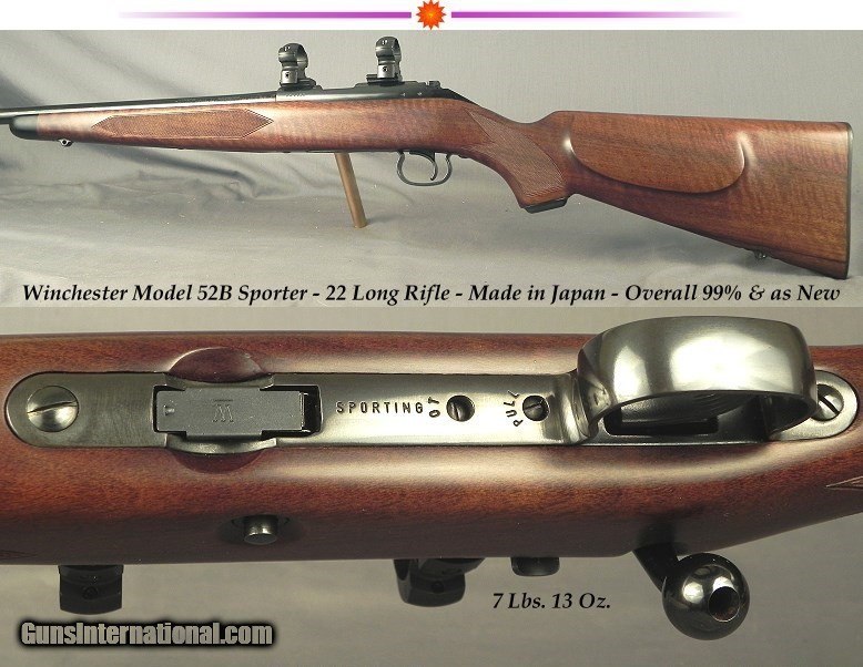 Description: #BS4452, Winchester Model 52B Sporter Made in Japan, 22 Long Rifle Made about 1995, 24" barrel without open sights, Scope bases with 1" rings, Micro Motion trigger with full adjustment, Standard sliding safety on the right side ahead of the bolt handle, Sporter stock with 13 1/2" LOP over a steel buttplate, Point pattern checkering, Ebony forend tip, Steel grip cap, Double screw sling swivel bases, Cheekpiece, 7 lbs. 13 oz., The factory original high gloss blue overall is 99.5%, The original wood finish at 99.5%, The checkering is 100%, The bore is new. SOLD |