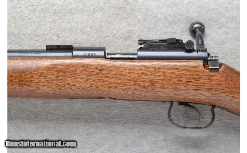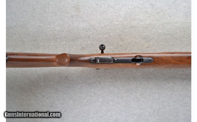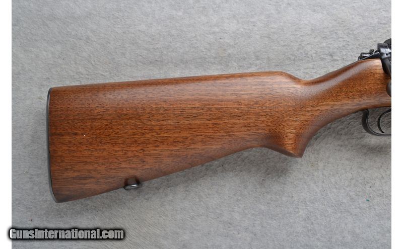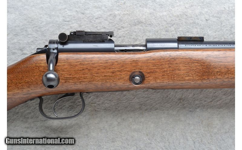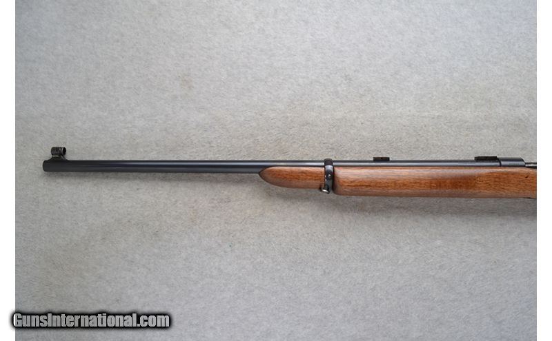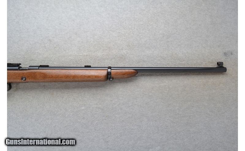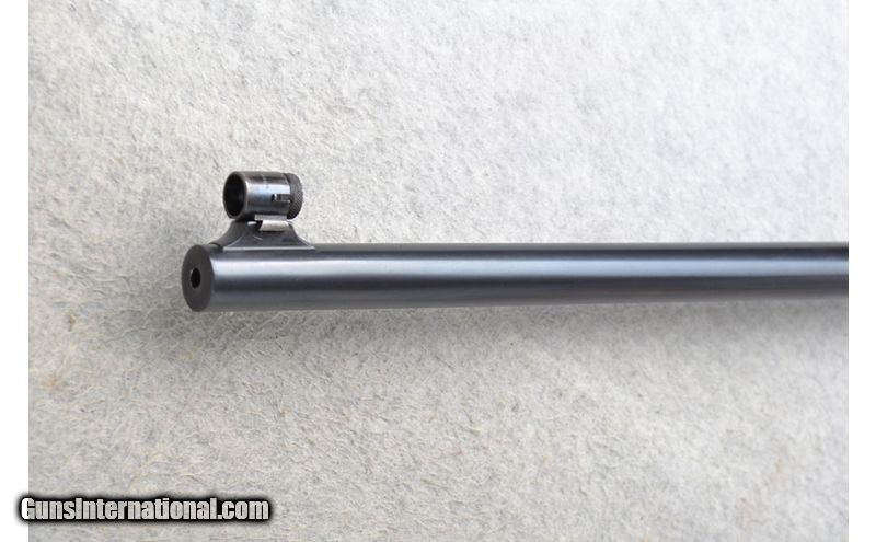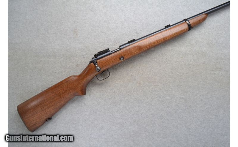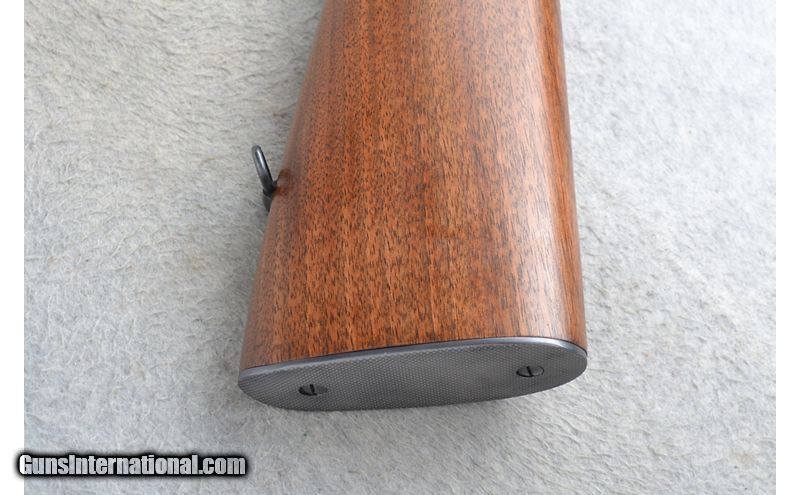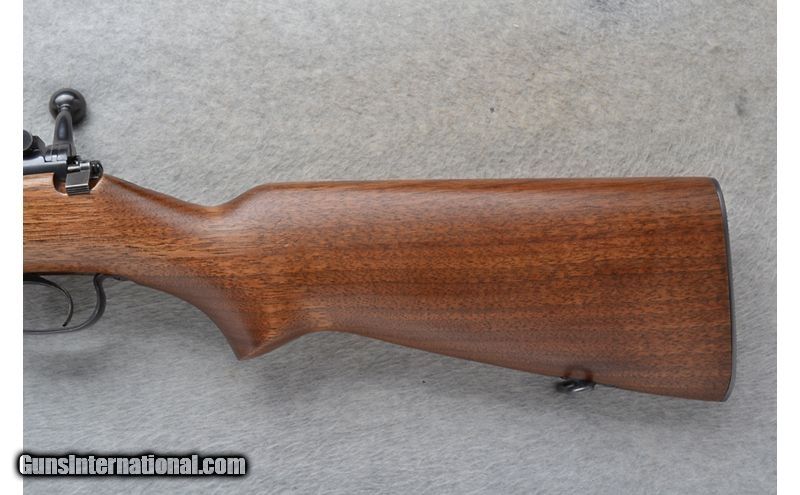 Description: This Winchester Model 52 is a right hand bolt action rifle in .22 Long Rifle Cal. It has a 28 inch barrel. A raised hooded front post sight. Two scope mount bases middle. A folding adjustable ladder rear sight. The butt stock is a smooth grip walnut pistol grip. The forearm is a smooth grip walnut with a barrel band. It has a grooved trigger. .22 Long Rifle SOLD Chambers: Right hand bolt action 5 round detachable magazine. Metal Condition: Excellent. Wood Condition: Excellent. Bore Condition: Excellent. Barrels: 28 inch. Triggers: Grooved. Stock Dimensions: LOP 13 1/8 inches. Fore End: Smooth grip walnut with a barrel band. Butt Pad: Checkered steel plate. Weight: 8 lb. 6 oz. Sights: Raised hooded post front. Two scope mount bases middle. Folding adjustable ladder rear. Item Location: Richfield, WI |