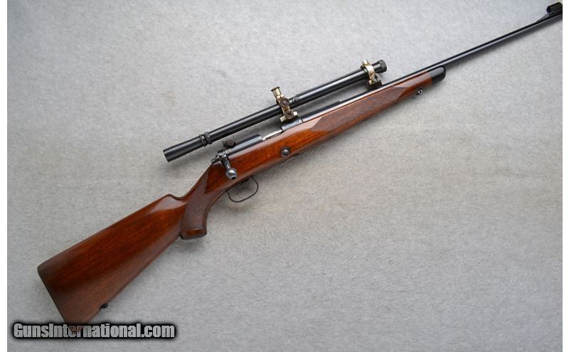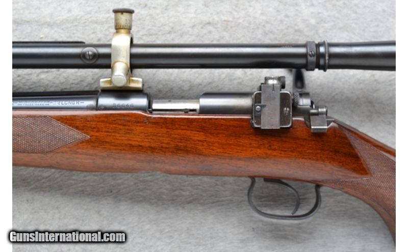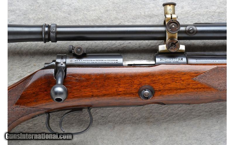 Description: This Winchester Model 52 Sporting is a right hand bolt action rifle in .22 Long Rifle Cal. It has a 24 inch barrel. A hooded front blade sight and an adjustable aperture rear sight. It is outfitted with a J.W. Fecker 4510 Scope. The butt stock is a checkered grip walnut pistol grip with a raised cheekpiece and black Winchester cap. The forearm is a checkered grip walnut with a black tip. The trigger is grooved. Serial Number 36646 (1936). .22 Long Rifle SOLD Chambers: 5 round detachable magazine. Metal Condition: Very good. Wood Condition: Good. Light handling marks. Bore Condition: Excellent. Barrels: 24 inch. Triggers: Grooved. Stock Dimensions: LOP 13 1/2 inches. Fore End: Checkered grip walnut with a black tip. Butt Pad: Checkered steel plate. Weight: 7 lb. 13 oz. Sights: Hooded front blade. Adjustable aperture rear. J.W. Fecker 4510 cope. Item Location: Richfield, WI |