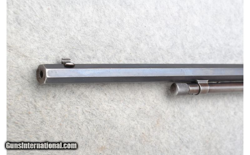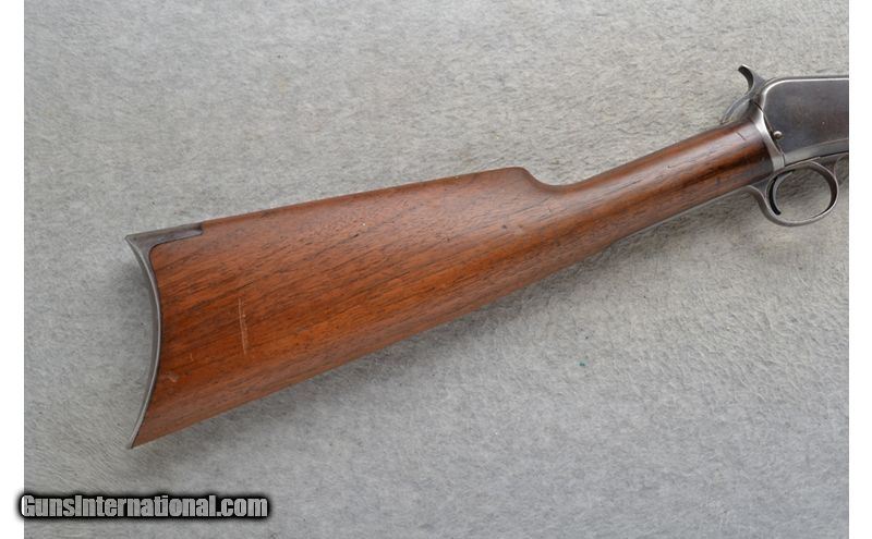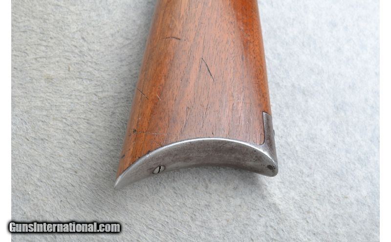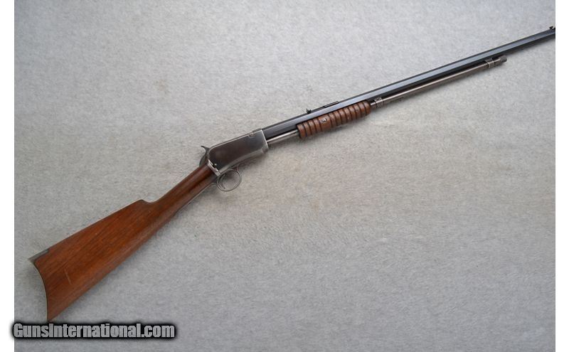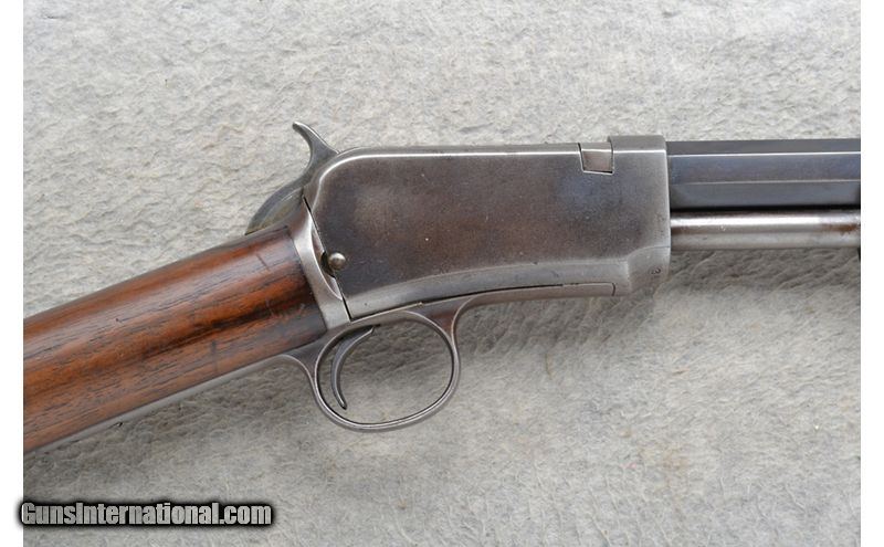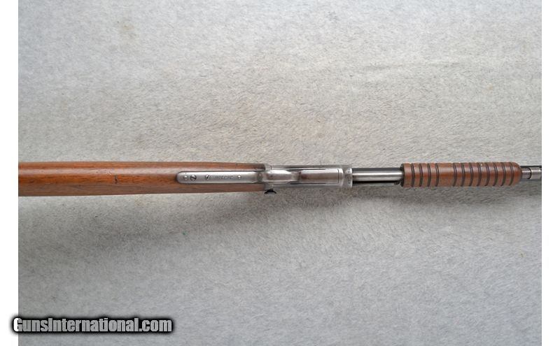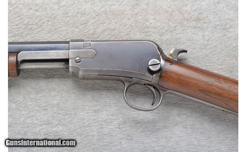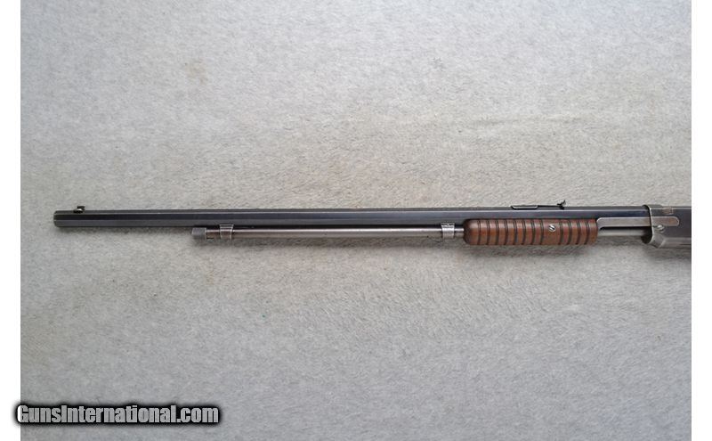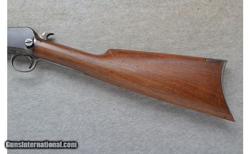 Description: This Winchester Model 90 is a right hand pump action rifle in .22 Short Cal. It has a 24 inch barrel. A short blade front sight and a notch middle sight. The butt stock is a smooth grip walnut straight grip. The forearm is a ribbed grip walnut. Serial Number 363186 (1908). .22 Short SOLD Curio/Relic: Yes Chambers: Pump Action 10 shot tube magazine. Metal Condition: "Fair. Has blue wear, handling marks and minor freckling. Wood Condition: Fair with handling marks. Bore Condition: Good. Barrels: 24 inch octagon barrel. Stock Dimensions: LOP 12 3/4 inches. Fore End: Ribbed grip walnut. Butt Pad: Smooth steel crescent. Weight: 5 lb. 12 oz. Sights: Short blade front. Notch middle. Item Location: Richfield, WI |