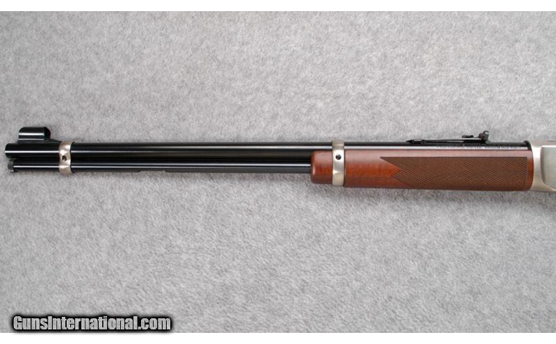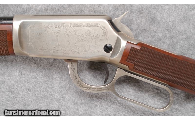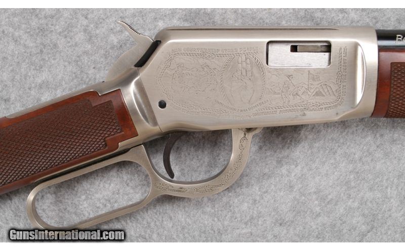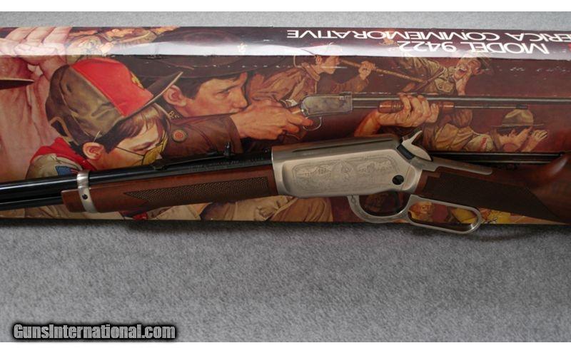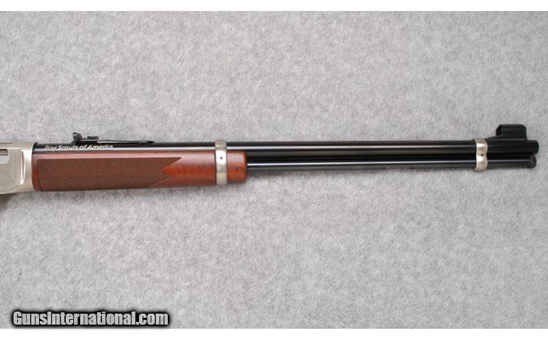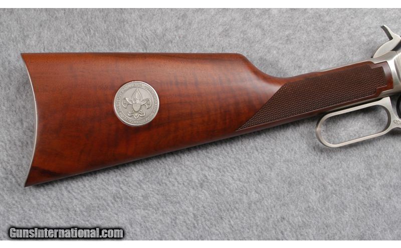Description: This Boy Scouts of America Commemorative (1910-1985) Carbine Rifle features a 20" Blued Barrel, Stainless Steel engraved Receiver plate, Walnut Checkered Wood Stock with BSA Logo medallion. Gun comes in its original box; sleeve does show wear. .22 Long Rifle SOLD Chambers: Lever action repeater. Metal Condition: Very good, like new. Wood Condition: Very good, like new. Barrels: 20"", blued. Triggers: Single, blued. Stock Dimensions: 13" LOP. Fore End: Matching checkered walnut with barrel band. Butt Pad: Factory crescent metal plate. Sights: Factory iron sights. Item Location: Dundee, MI |