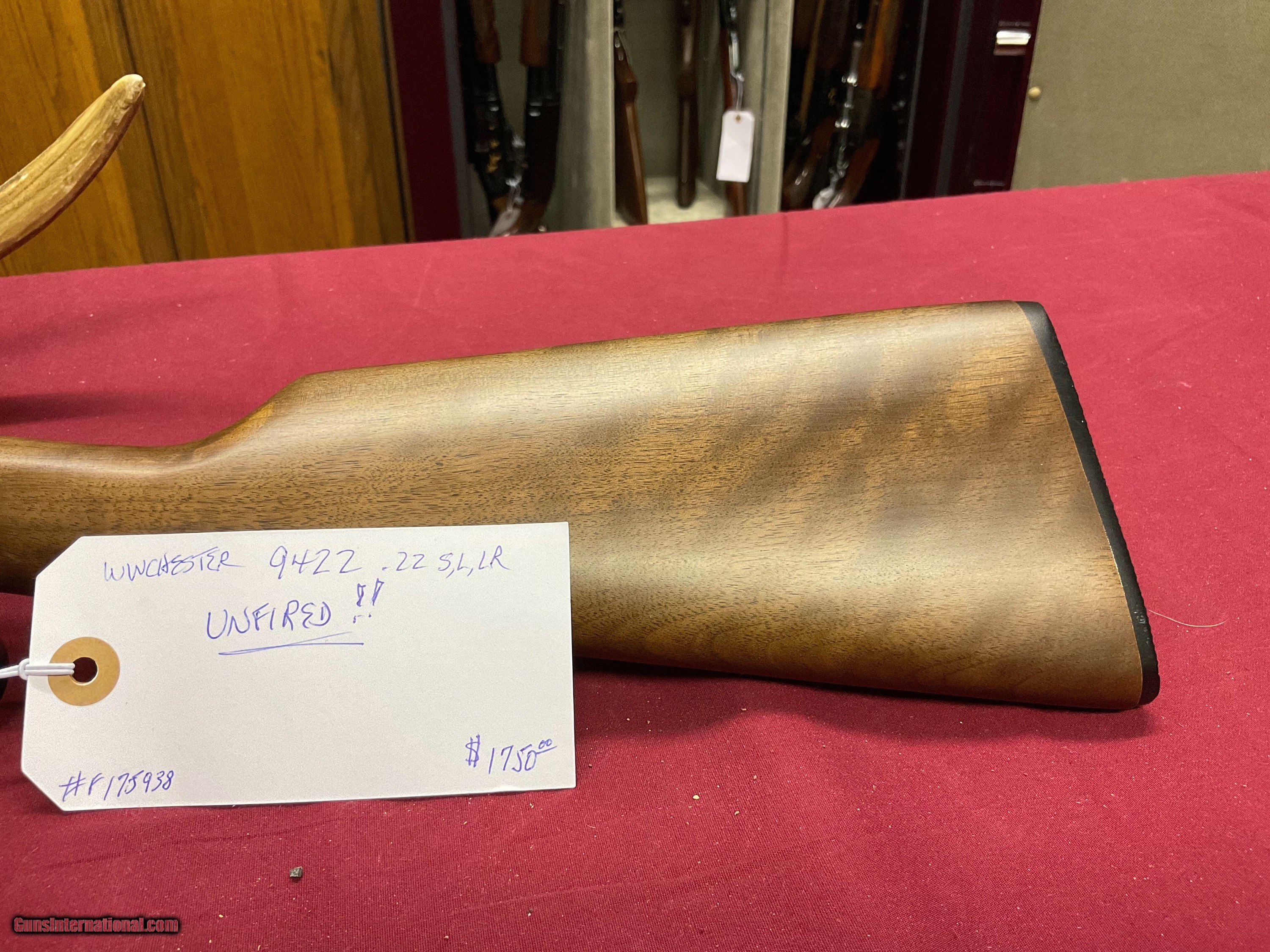 Description: Finest .22 cal lever action rifle EVER !! UNFIRED, NEVER LOADED, Grooved for scope. Great wood. Christmas is just around the corner. SOLD Rifle Caliber: .22 Long Rifle Manufacturer: Winchester Model: 9422 Serial Number: 175938 Barrel Length: 19 Condition: As new Metal Condition: As new Wood Condition: As new Bore Condition: As new Action: Lever |