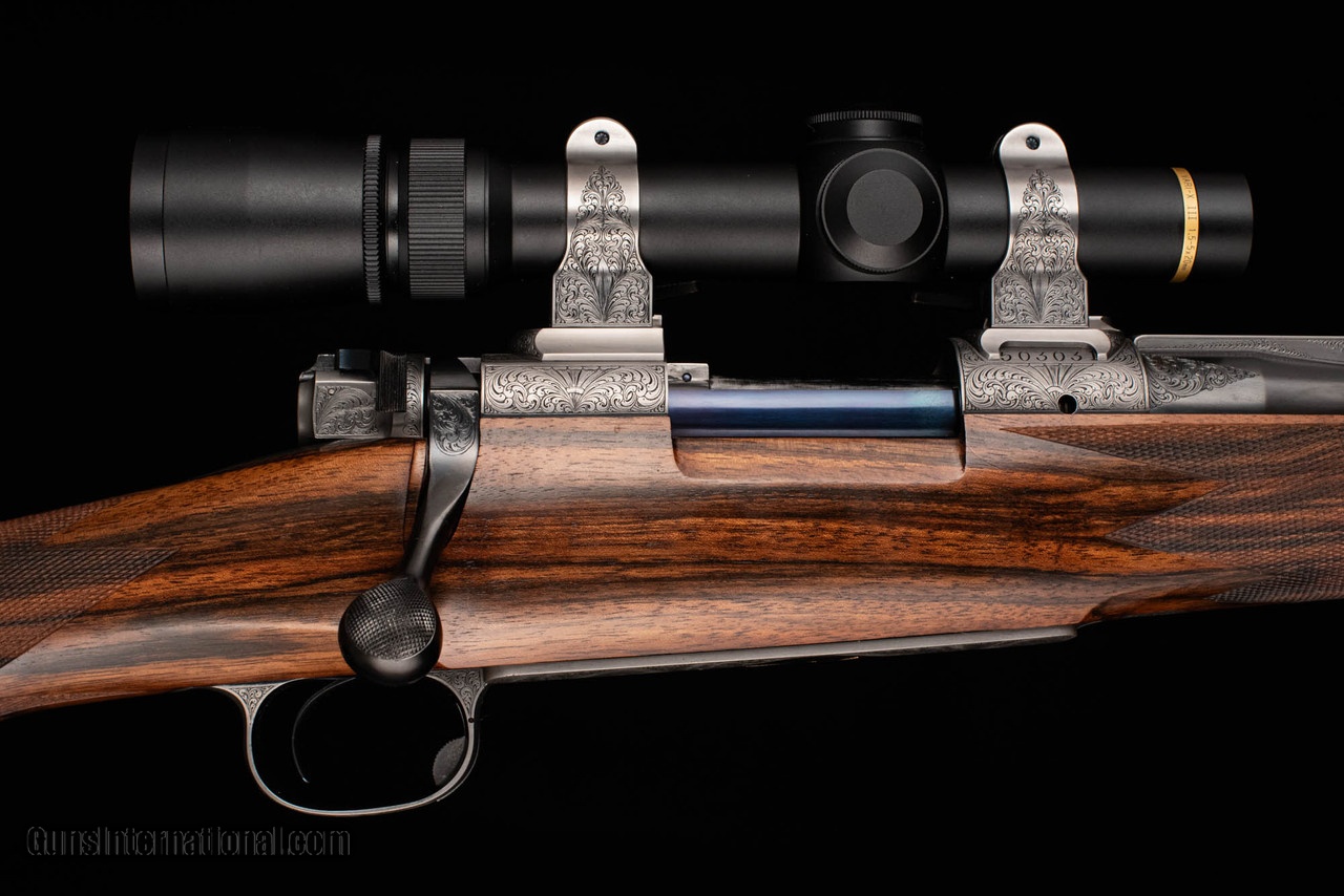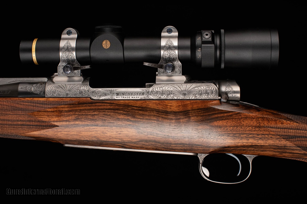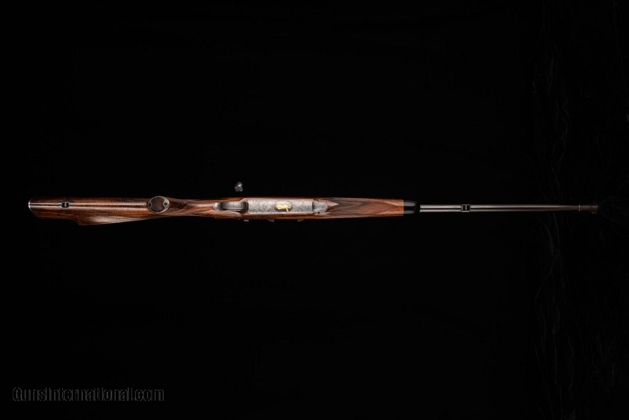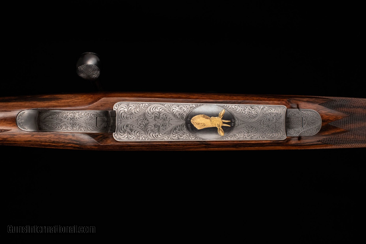 Description: Gordy and Sons is proud to offer what may be one of the finest .22 bolt action rifles ever assembled. This Custom gun started life as a pre '64 Model 70 Winchester, and was worked on by 4 legends of the U.S. custom gun world. Heppler, Heilmann, and Mazur all had their parts in the fit and finish of this exquisite piece. Richard Boucher did a wonderful job engraving the gun tastefully that is capped off with a gold Duiker inlaid into the bottom of the receiver. The skeletonized butt plate and grip cap top off a beautifully done stock. The rifle has leaf sights and a Leupold Vari-X 3, 1.5-5x scope on guick-detach mounts. Overall, it is just a gorgeous example of what an American Guild Gun can be. SOLD Manufacturer: Winchester Caliber Info: 22 Cal. R.F. Barrels: 22 Action: Bolt-Action Triggers: Single Gauge Info: 22 Cal. R.F. LOP: 14 1/4 Weight: 8.14 |