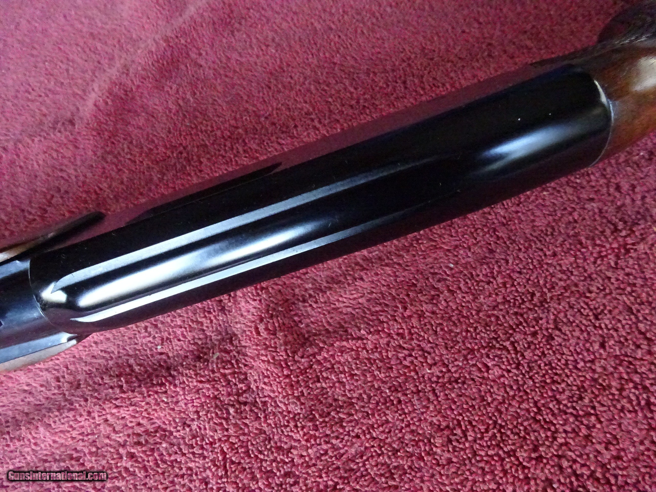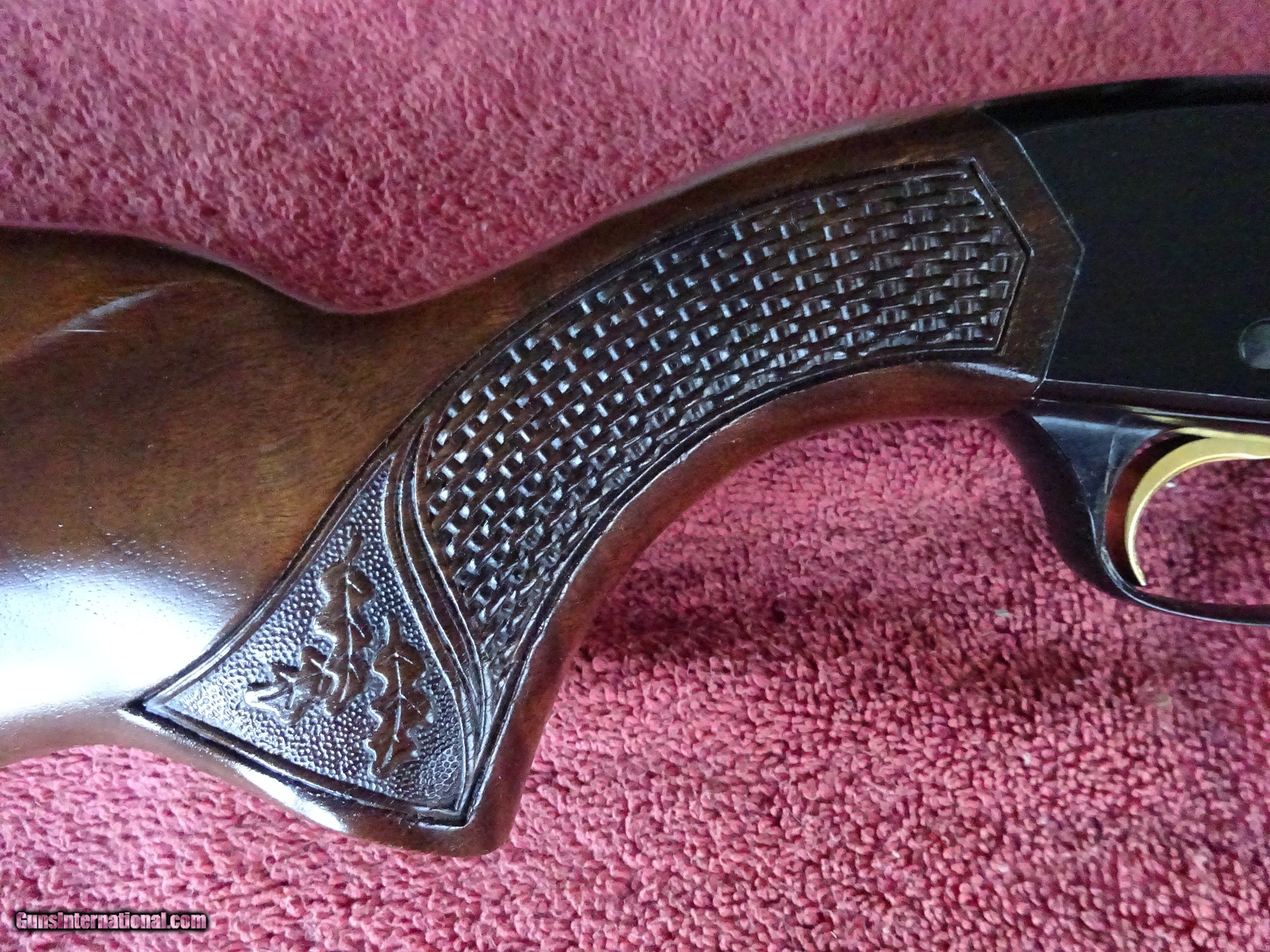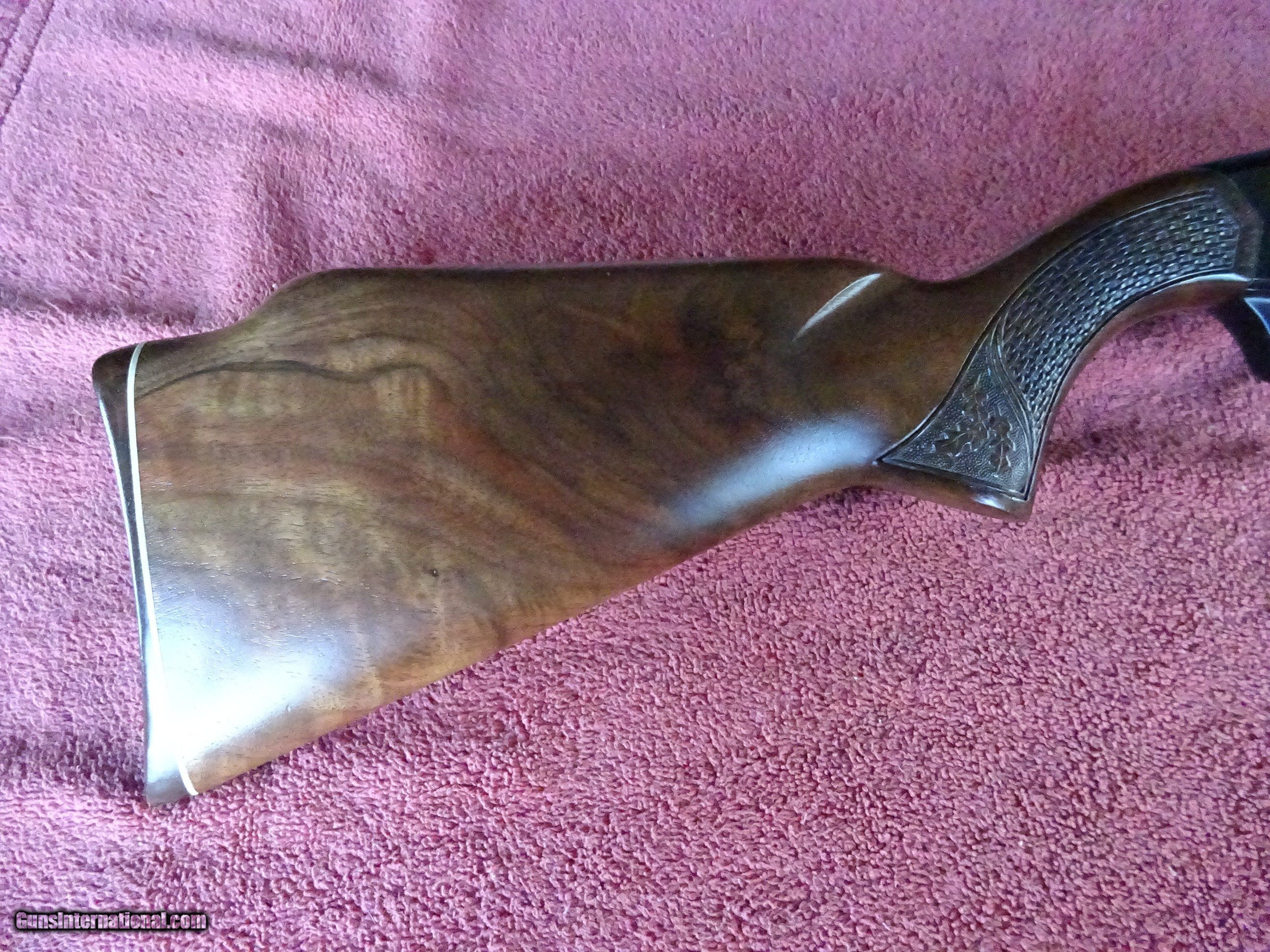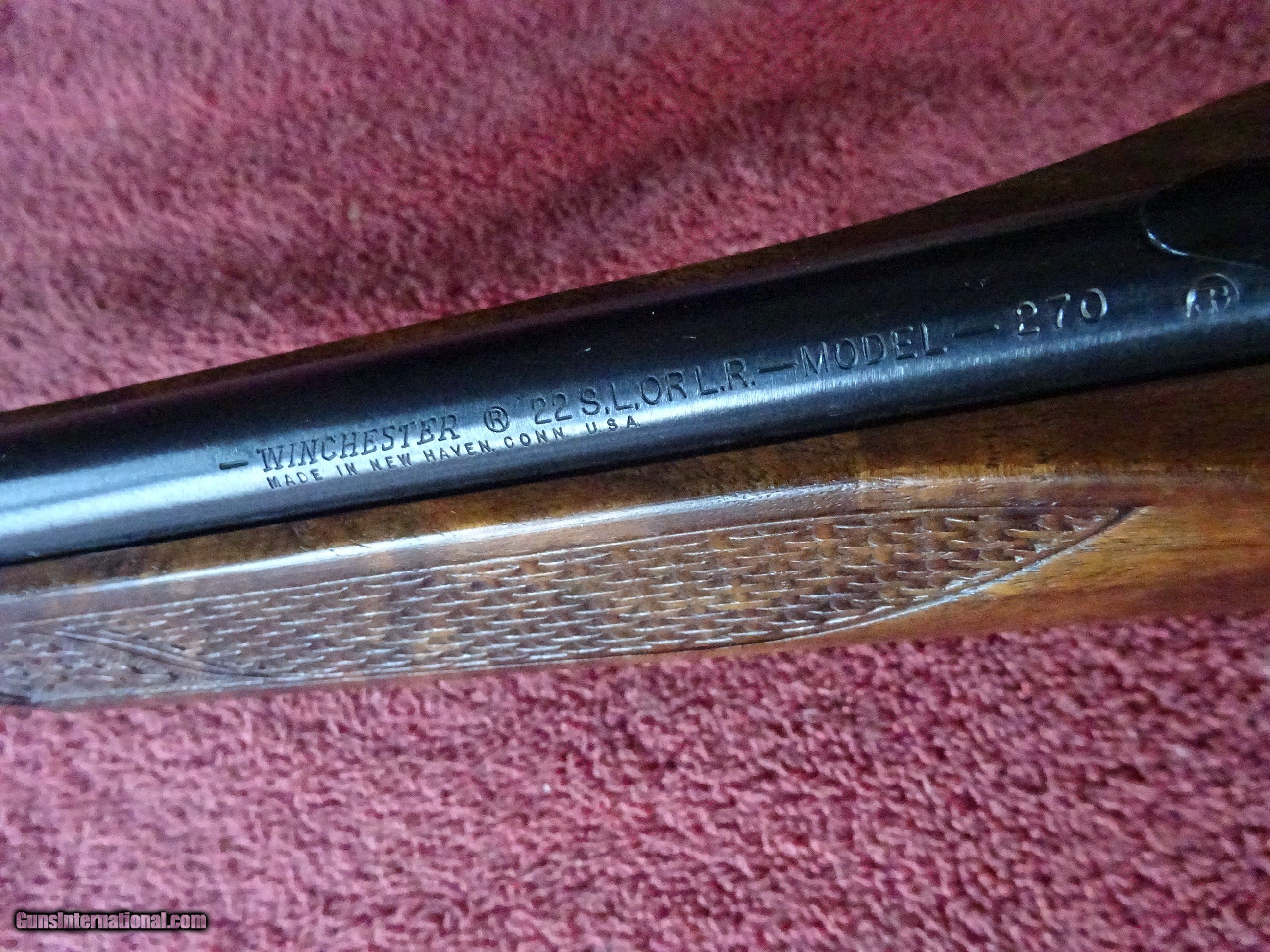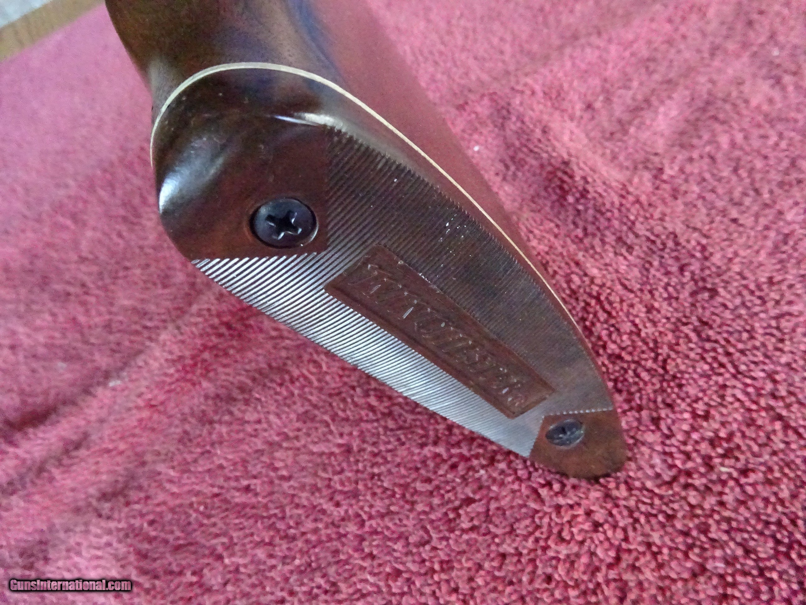 Description: WINCHESTER MODEL 270 DELUXE, 22 S L. OR L.R, SLIDE ACTION. 20 1/2" BARREL, FIXED FRONT SIGHT, STEP ADJUSTABLE REAR SIGHT. GROOVED RECEIVER, GOLD TRIGGER AND SAFETY, TUBULAR MAGAZINE. PISTOL GRIP MONTE CARLO STOCK, HIGH-GRADE AMERICAN WALNUT WITH GORGEOUS FIGURE AND COLOR. VERY UNUSUAL RIBBON OR BAND CHECKERING PATTERN WITH OAK LEAF ACCENTS ON BOTH GRIP AND FOREARM. BROWN PLASTIC WINCHESTER MARKED BUTTPLATE. NEW CONDITION, NO HANDLING MARKS OR WEAR ANYWHERE ON THE GUN. IMPOSSIBLE TO IMPROVE UPON. RARE GUN. $1275.00 + $70.00 Insured shipping to an FFL address. Layaway is available. See all Pats gun listings on this site! We also have hundreds of ORIGINAL gun company advertising & memorabilia pieces available for sale on our site SPORTINGCOLLECTIBLES. We have no reprints or reproductions. Email for more information. If you need to call, morning or evening is best, and please note the Seller's Inventory number. SOLD |