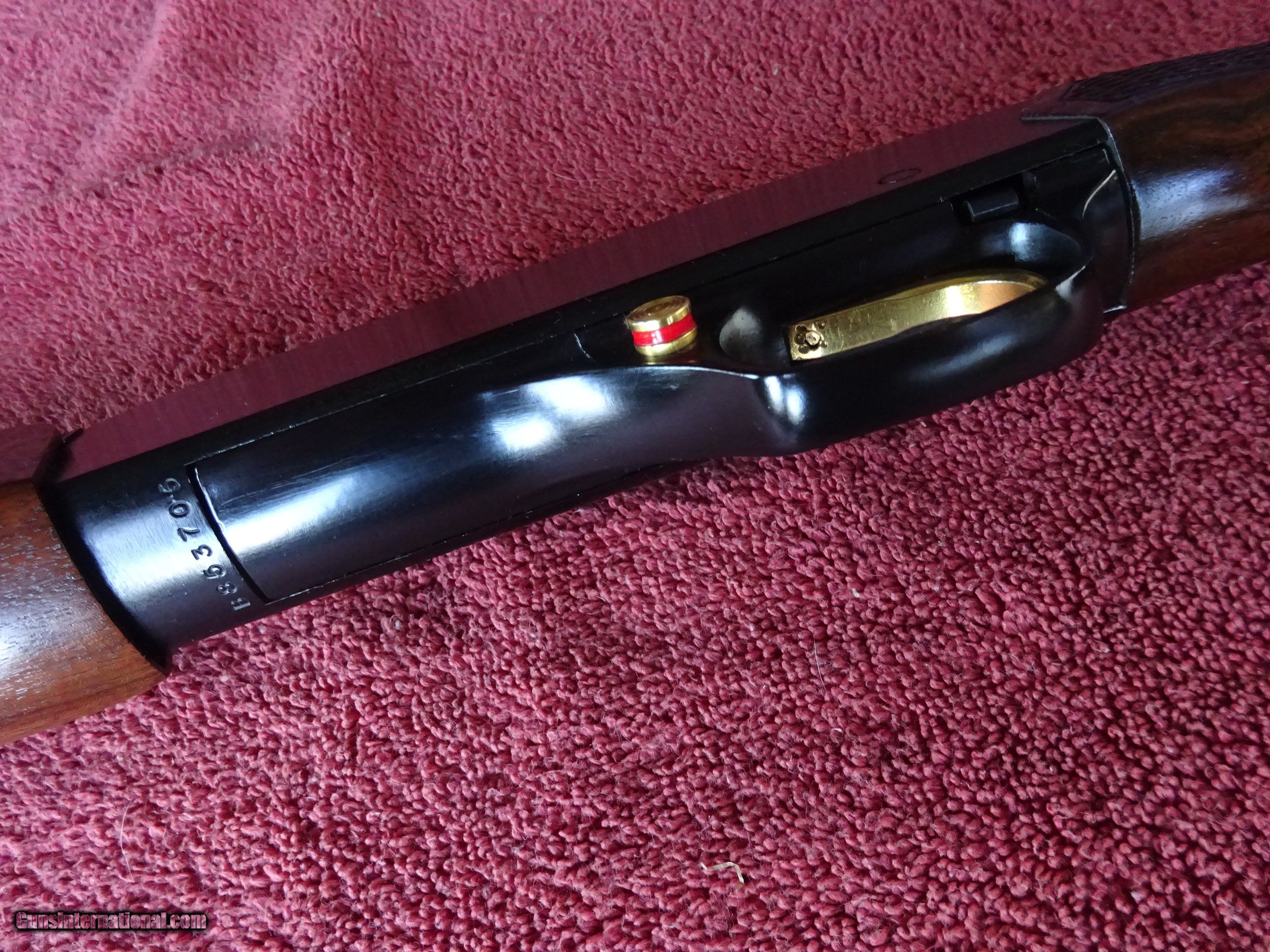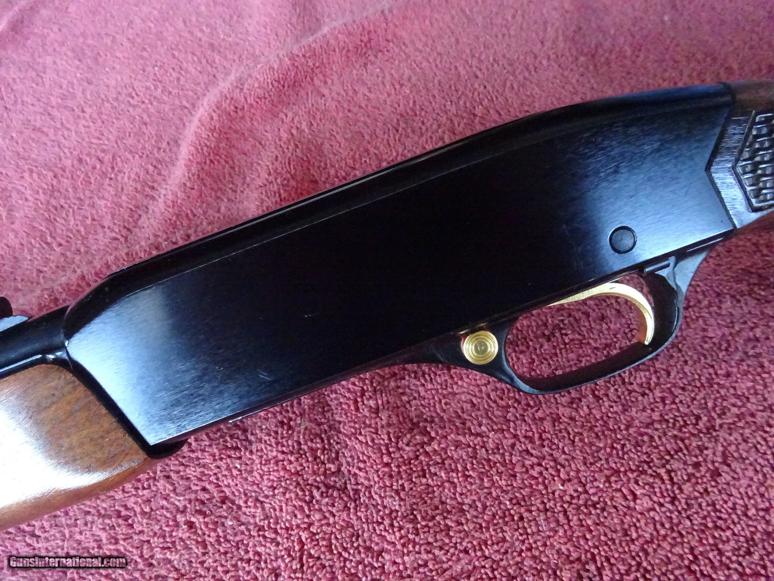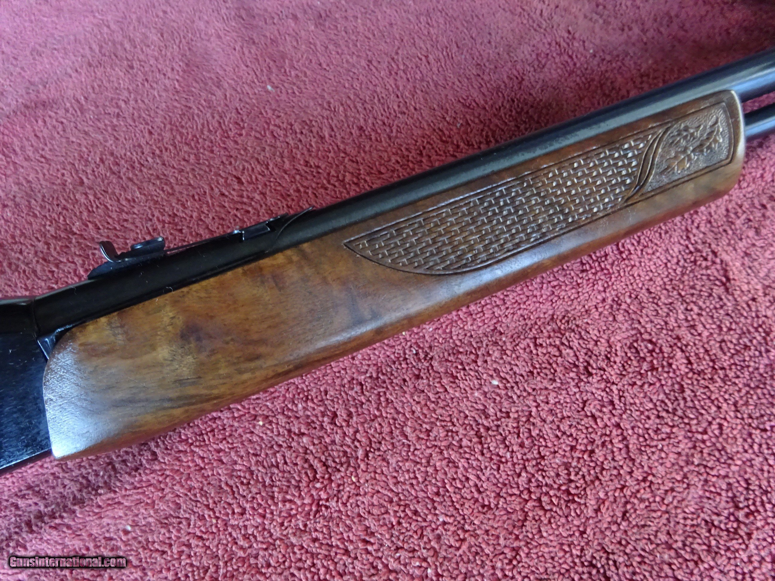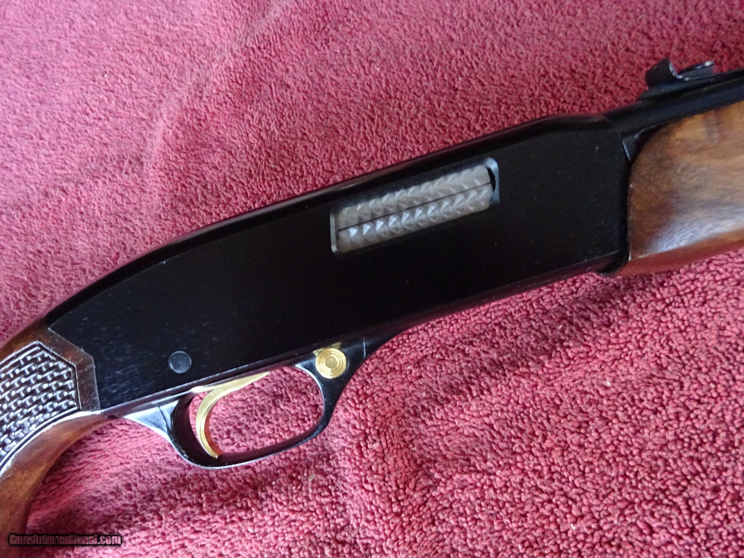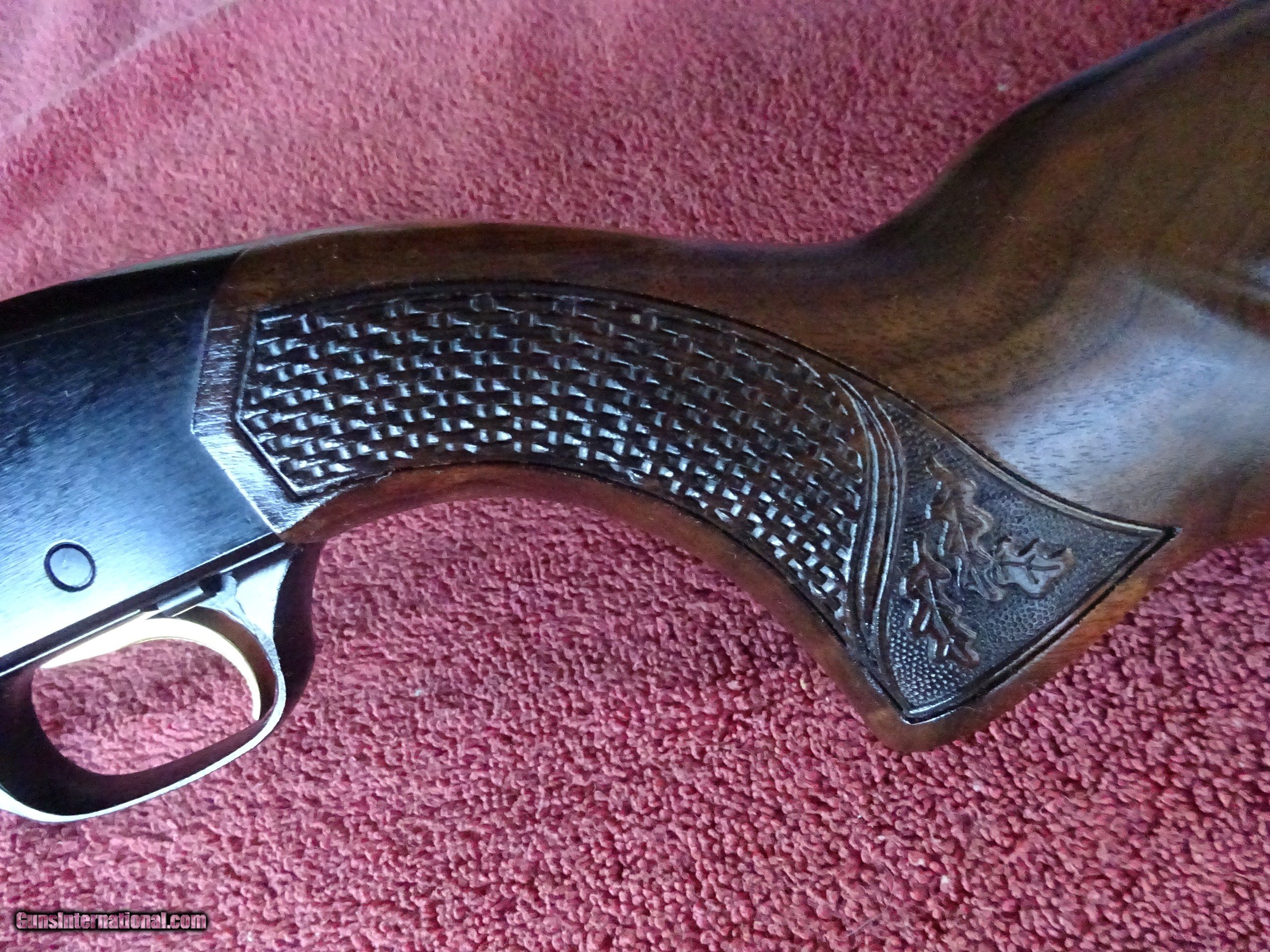 Description: WINCHESTER MODEL 270 DELUXE, 22 S L. OR L.R, SLIDE ACTION. 20 1/2" BARREL, FIXED FRONT SIGHT, STEP ADJUSTABLE REAR SIGHT. GROOVED RECEIVER, GOLD TRIGGER AND SAFETY, TUBULAR MAGAZINE. PISTOL GRIP MONTE CARLO STOCK, HIGH-GRADE AMERICAN WALNUT WITH GORGEOUS FIGURE AND COLOR. VERY UNUSUAL RIBBON OR BAND CHECKERING PATTERN WITH OAK LEAF ACCENTS ON BOTH GRIP AND FOREARM. BROWN PLASTIC WINCHESTER MARKED BUTTPLATE. NEW CONDITION, NO HANDLING MARKS OR WEAR ANYWHERE ON THE GUN. IMPOSSIBLE TO IMPROVE UPON. RARE GUN. $1275.00 + $70.00 Insured shipping to an FFL address. Layaway is available. See all Pats gun listings on this site! We also have hundreds of ORIGINAL gun company advertising & memorabilia pieces available for sale on our site SPORTINGCOLLECTIBLES. We have no reprints or reproductions. Email for more information. If you need to call, morning or evening is best, and please note the Seller's Inventory number. SOLD |