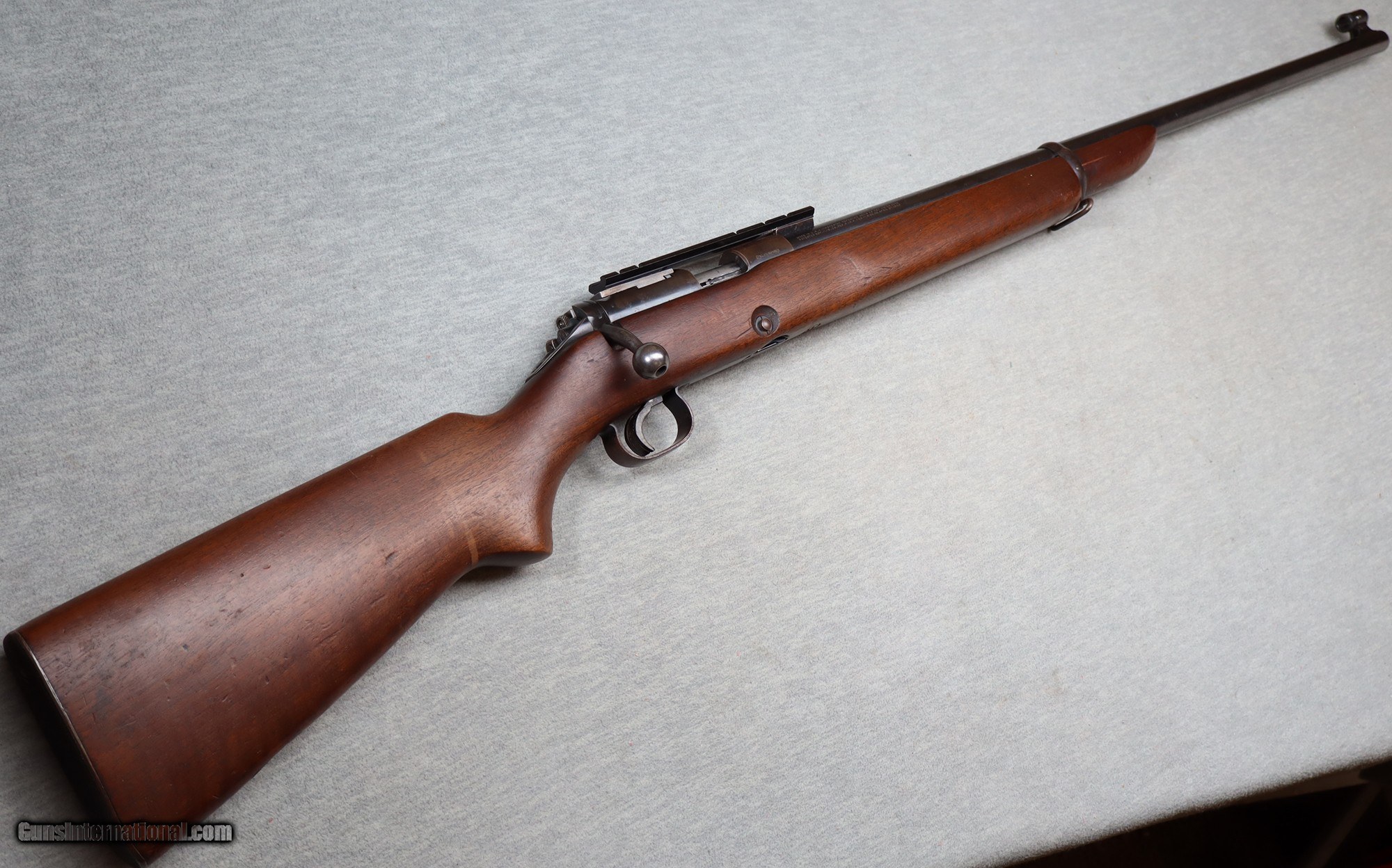 Description: Winchester Model 52 is a bolt-action .22-caliber target rifle introduced by the Winchester Repeating Arms Company in 1920. Familiarly known as the "King of the .22s," it was for decades regarded as the premier smallbore match rifle in the United States and acclaimed worldwide for its accuracy and craftsmanship. Though production ceased in 1980, its reputation endures with collectors, competitors, and firearms historians alike. This example comes with one magazine. The original rear sight was removed so a rail could be added. Rifle is in good condition and shows normal wear. Barrel shows some pitting. .22 Long Rifle Metal Condition: good Wood Condition: good Bore Condition: bright Barrels: 28" barrel Stock Dimensions: 13.5 Fore End: smooth wood Butt Pad: metal Weight: 8 lb - 6 oz Sights: front target sight only Item Location: La Vista, NE Price: $899.99 Contact Seller |