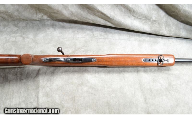 Description: This target rifle was manufactured in 1950 and give very good care with only minor defects. It is drilled and tapped for several sighting systems. .22 Long Rifle SOLD Curio/Relic: Yes Chambers: 5-round detachable magazine. Metal Condition: Very good. Bluing is nice and wear shows on the trigger guard and around the muzzle. Wood Condition: Very good. There are a few nicks and dents but is in really good shape. Bore Condition: Shiny and bright with good rifling. Barrels: 28 inch heavy profile. Triggers: Factory trigger. Stock Dimensions: 13-1/4 inch LOP. Fore End: Wide bench rest/sand bag type forearm. Butt Pad: Steel plate. Weight: 7 lb. - 8 oz. Sights: "No sights. Provisions for front sight, peep sight and telescope. Item Location: Rogers |