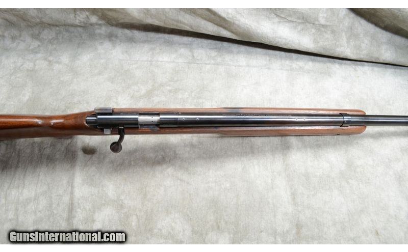 Description: This target rifle was manufactured in 1950 and give very good care with only minor defects. It is drilled and tapped for several sighting systems. .22 Long Rifle SOLD Curio/Relic: Yes Chambers: 5-round detachable magazine. Metal Condition: Very good. Bluing is nice and wear shows on the trigger guard and around the muzzle. Wood Condition: Very good. There are a few nicks and dents but is in really good shape. Bore Condition: Shiny and bright with good rifling. Barrels: 28 inch heavy profile. Triggers: Factory trigger. Stock Dimensions: 13-1/4 inch LOP. Fore End: Wide bench rest/sand bag type forearm. Butt Pad: Steel plate. Weight: 7 lb. - 8 oz. Sights: "No sights. Provisions for front sight, peep sight and telescope. Item Location: Bristol, TN |