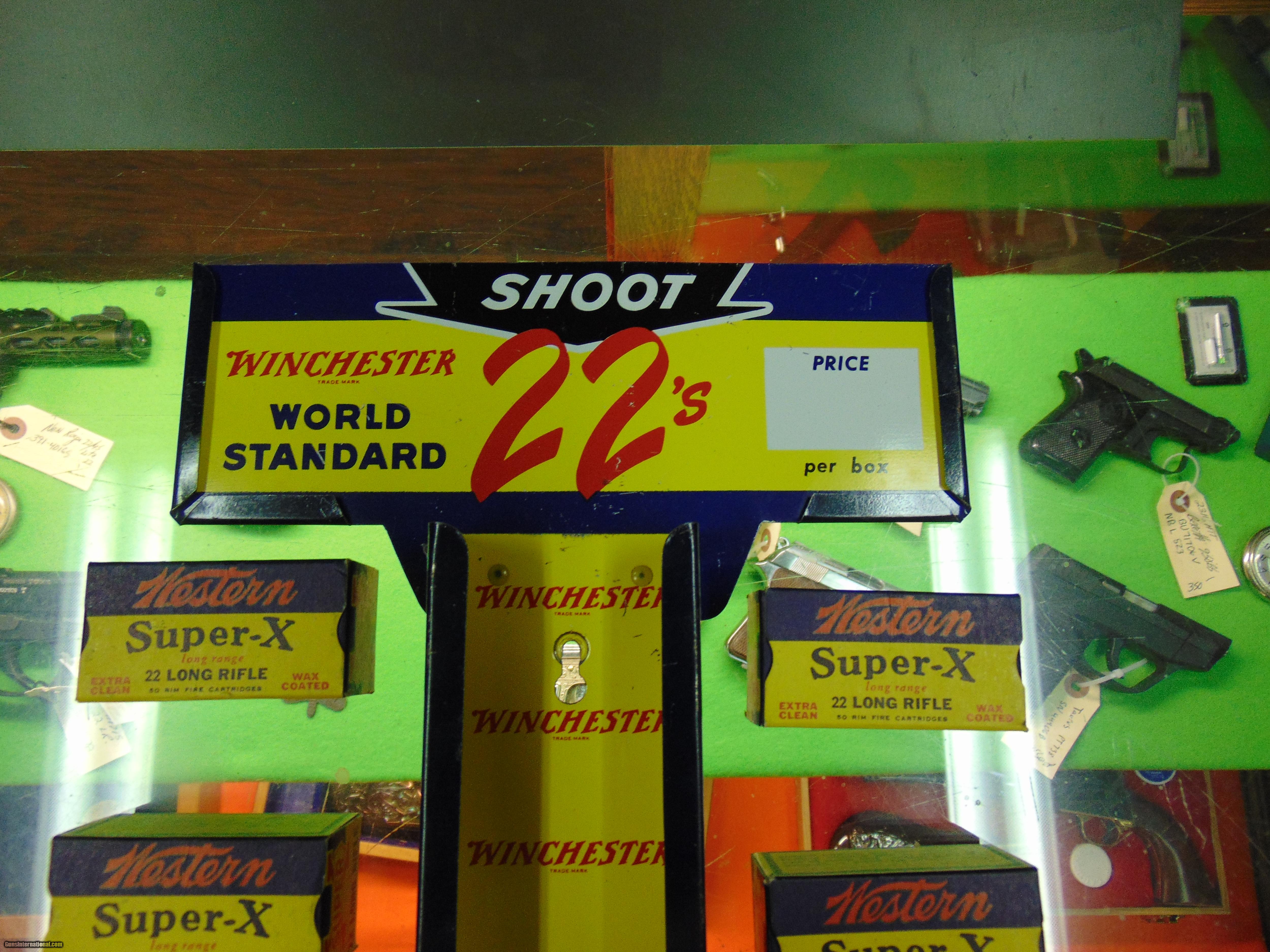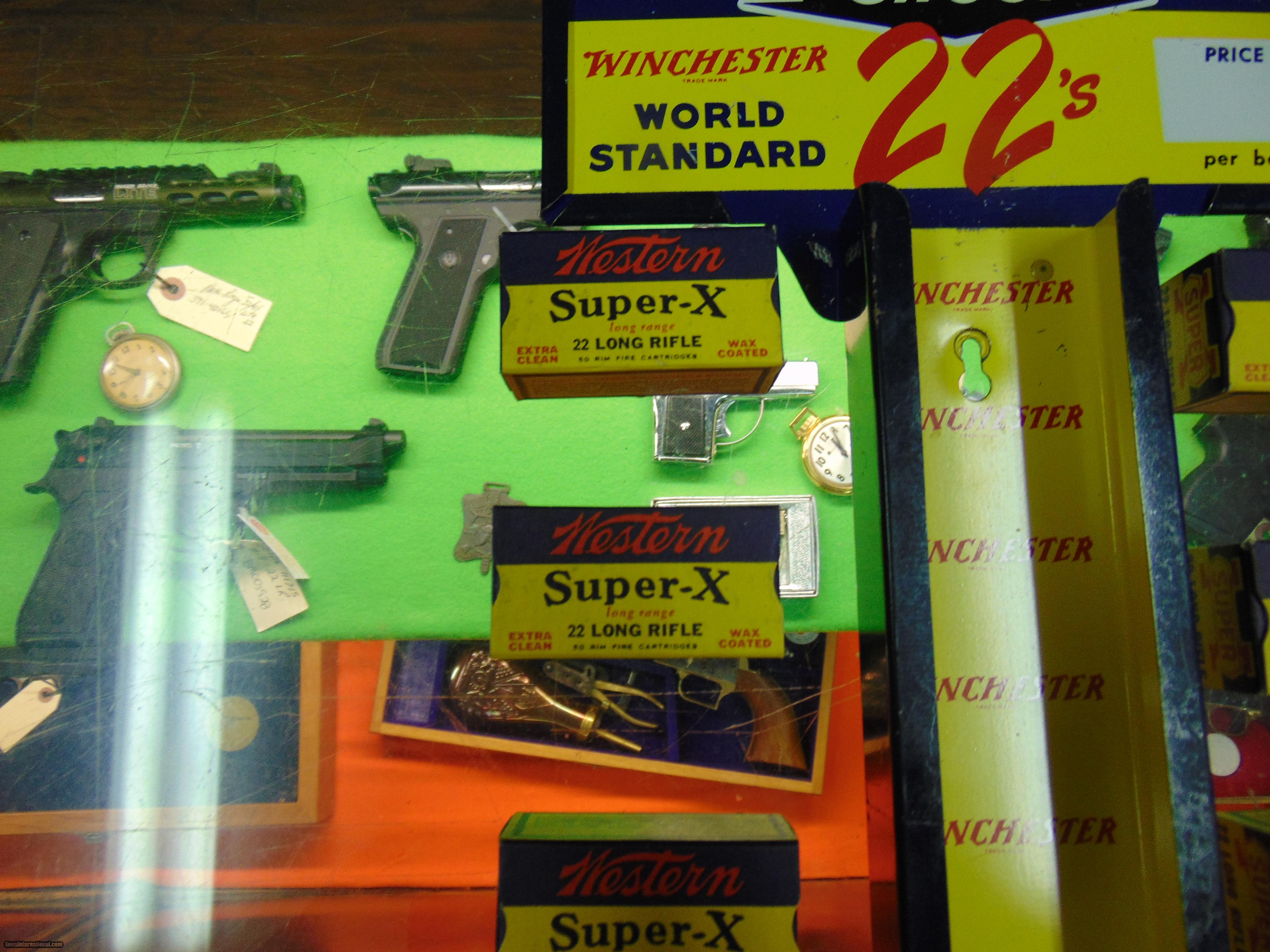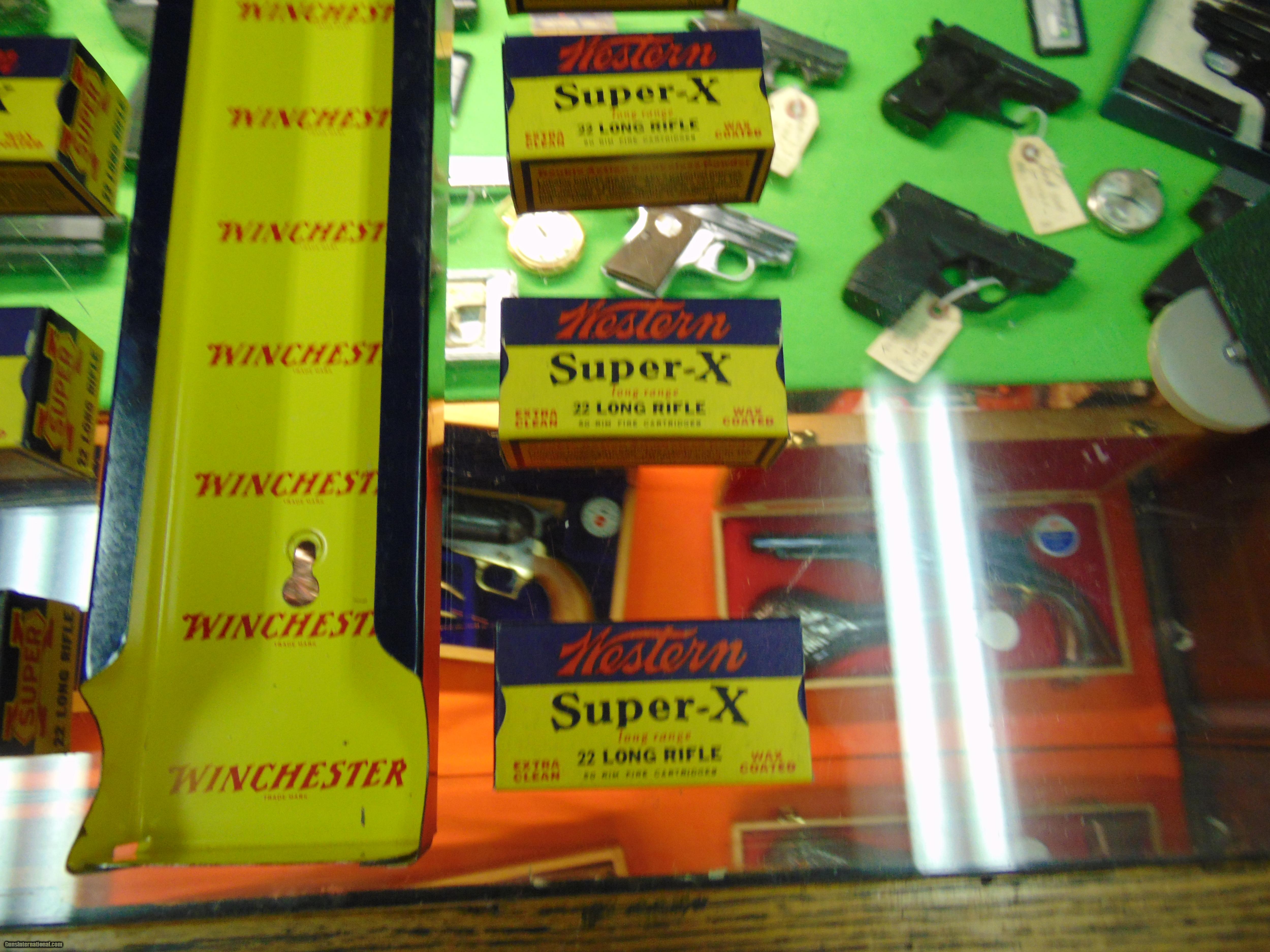 Description: A new old stock Winchester Western Super X wall display. The only mark is in the screw hole where we hung it on our wall. Everything else is pristine. The ten boxes of Winchester Super X are all from the same code DCY42. They were also a NOS brick, we have the box but it is MIA at the moment. I am currently searching for it. This is a cool Winchester original Winchester Display. For More Information call 412-554-7891. We charge a 3% credit card fee SOLD |