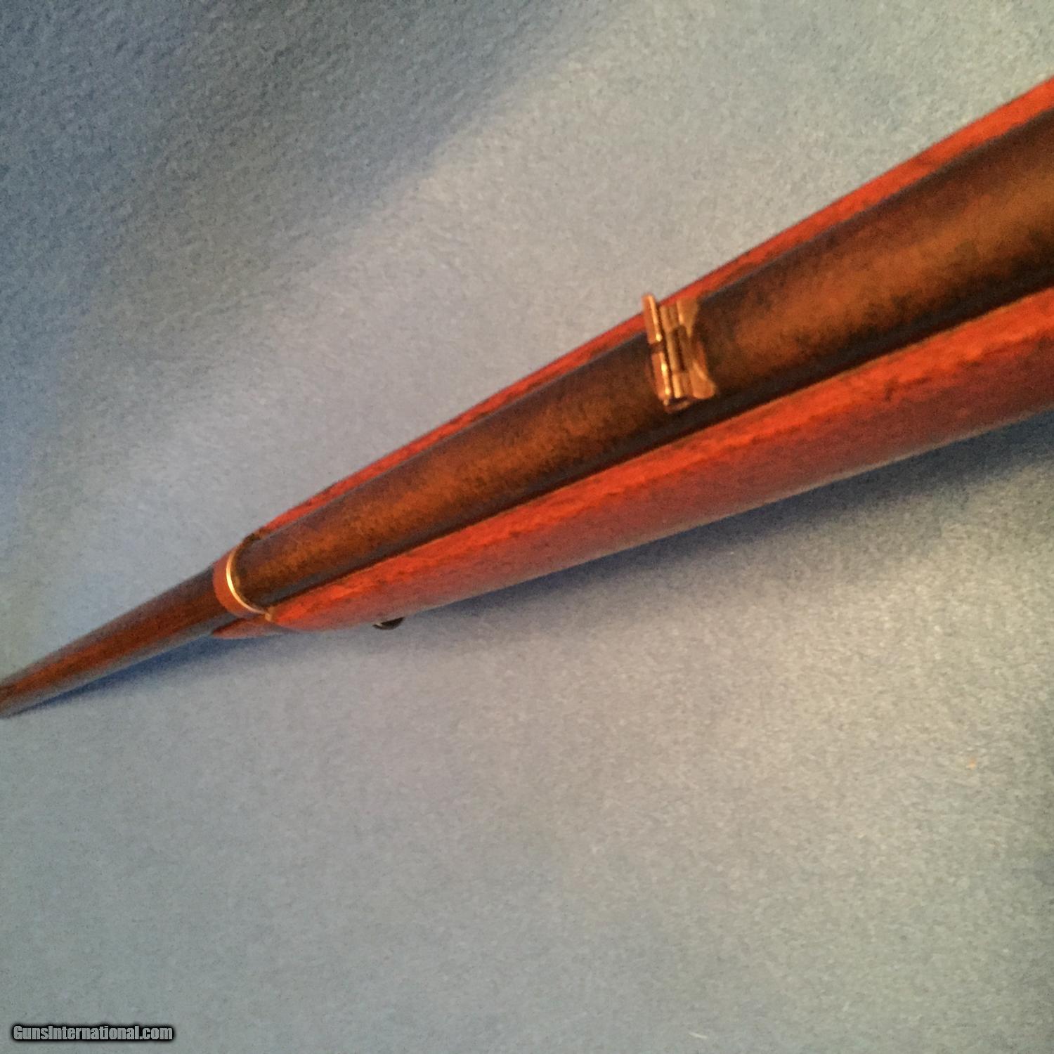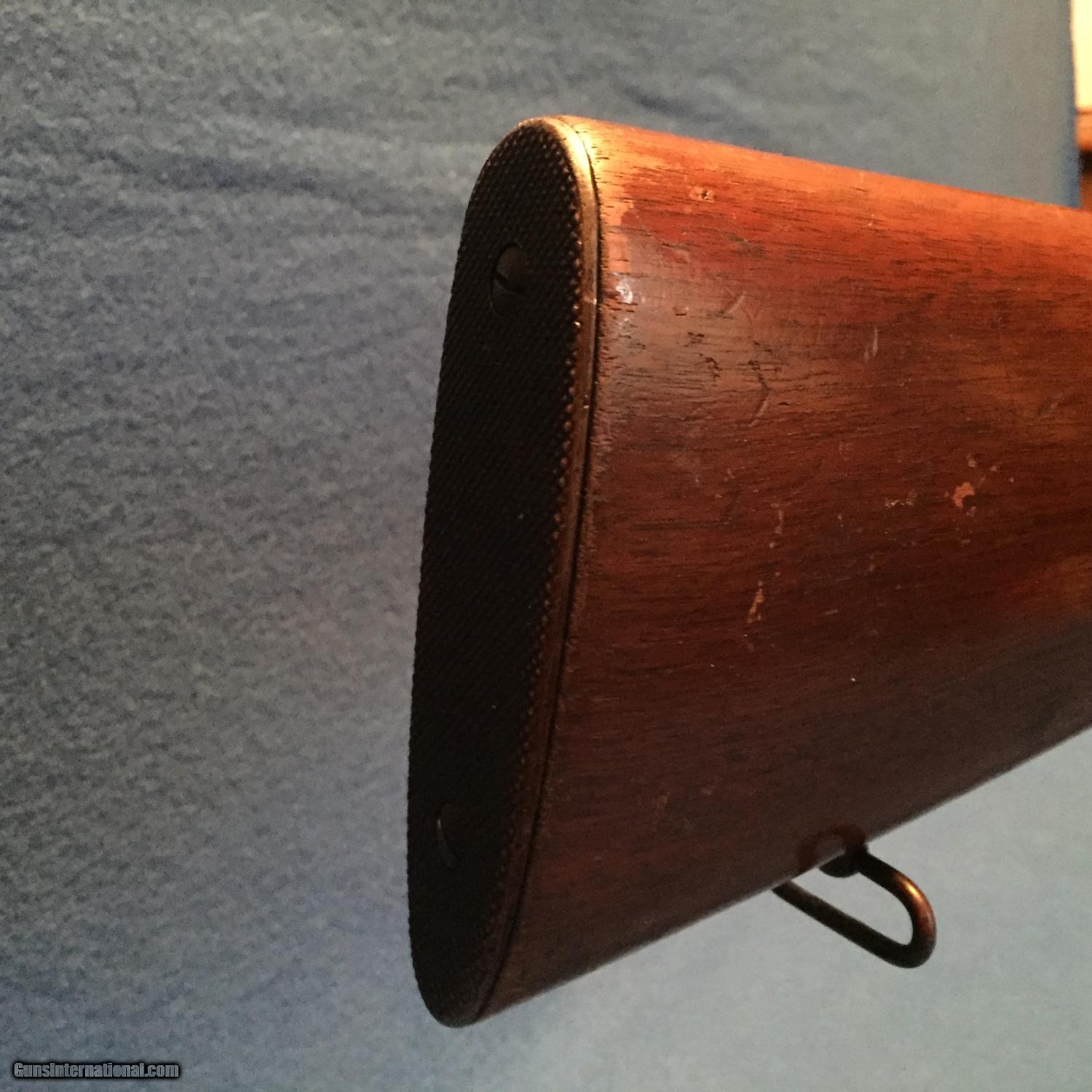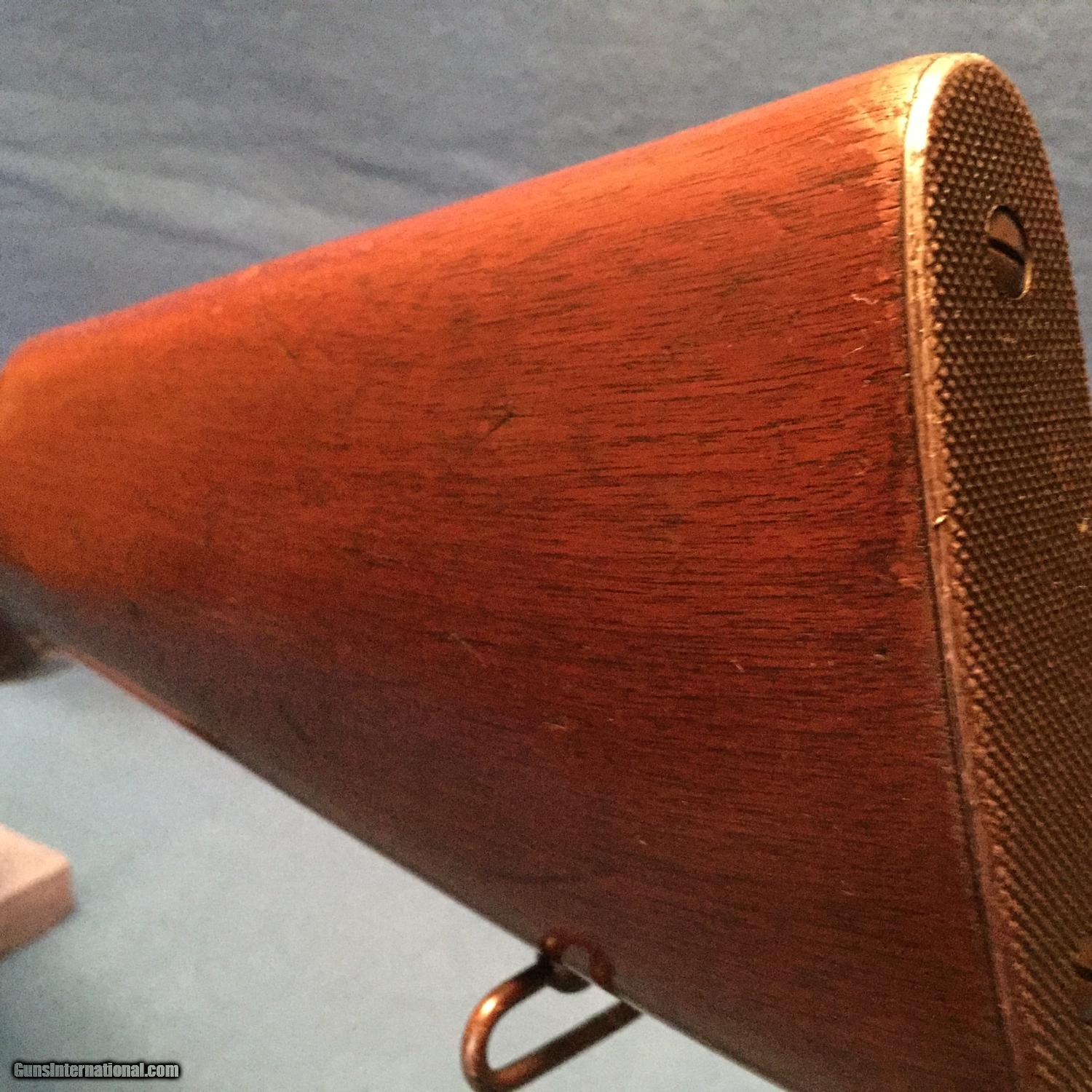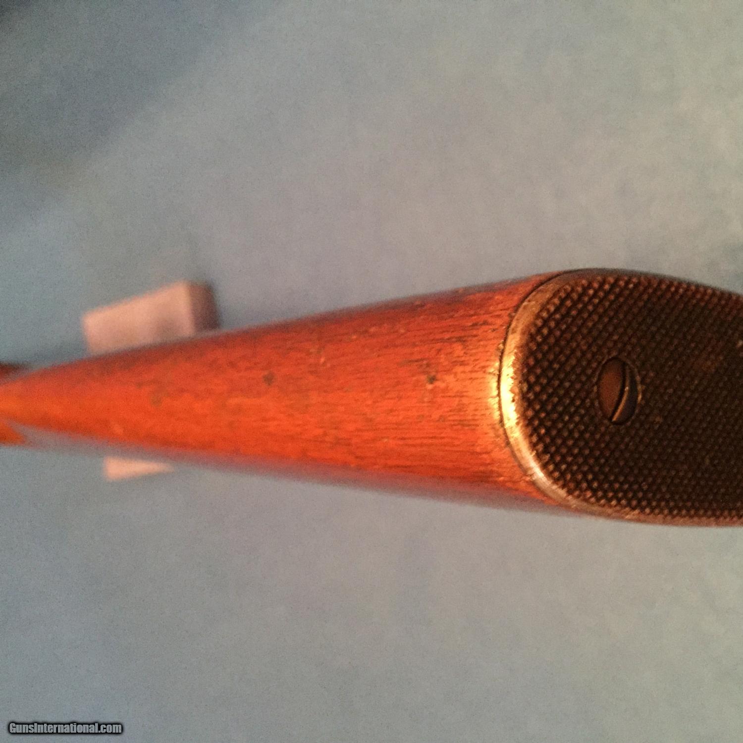 Description: Winchester Mod 57 target - scarce gun, with fair bluing, but thinning. Wood has usual handling marks and dings and varnish flaking mainly at the caring point. Sights are correct Lyman 42W rear peep and folding mid sight with Lyman globe front sight. Original 5 shot clip. SOLD Curio/Relic: Yes Manufacturer: WINCHESTER Model: 57 TARGET Serial Number: 17149 Caliber Info: 22 Bore Condition: VERY GOOD Manufacture Date: 1930 |