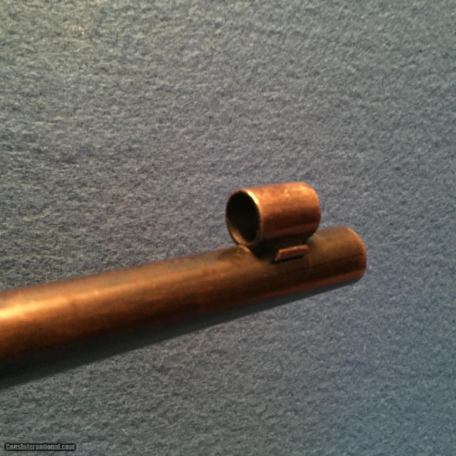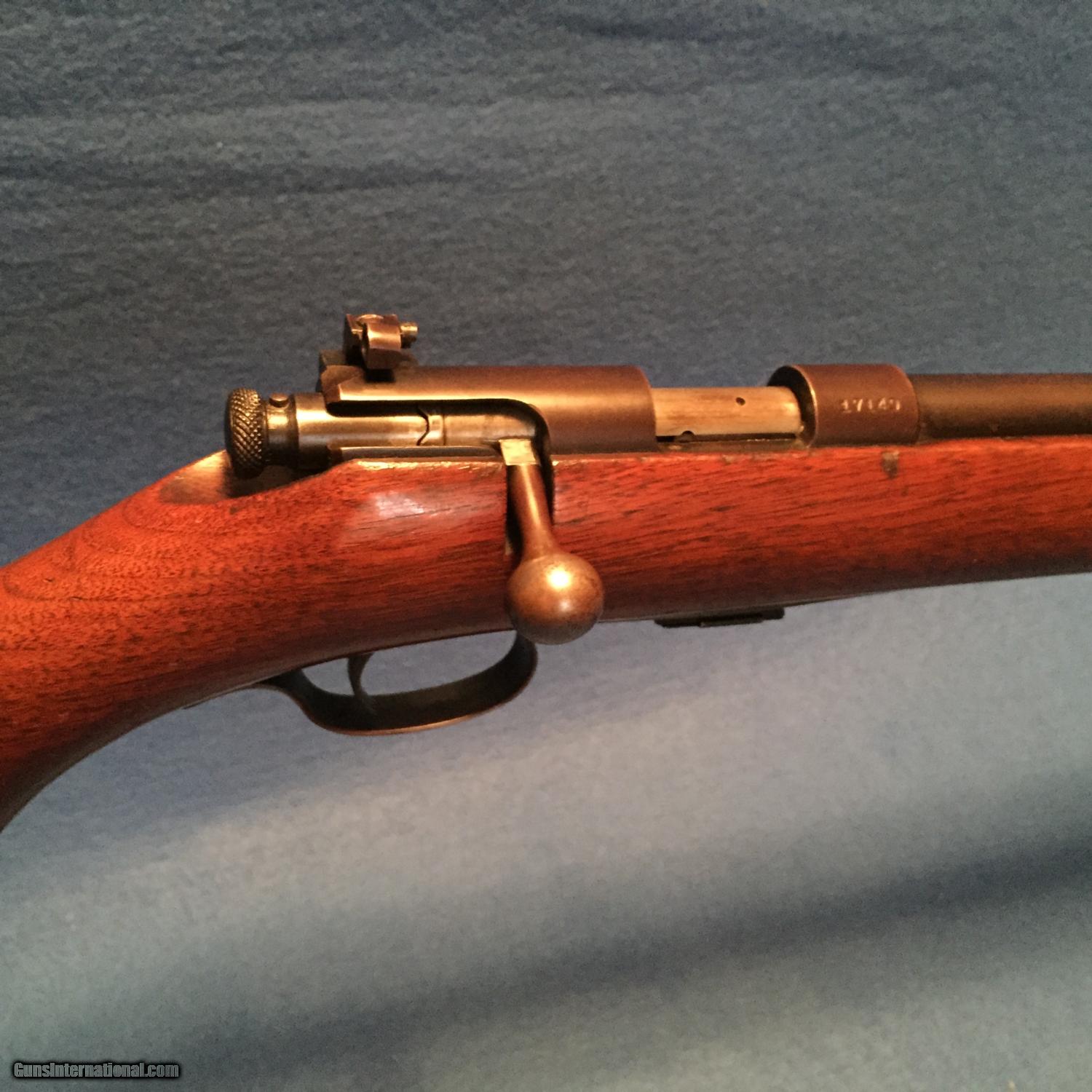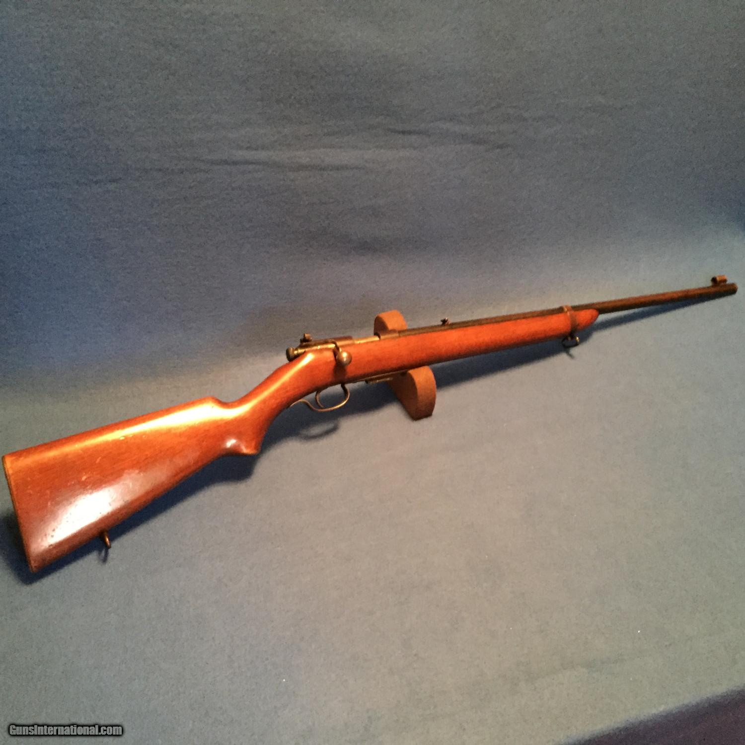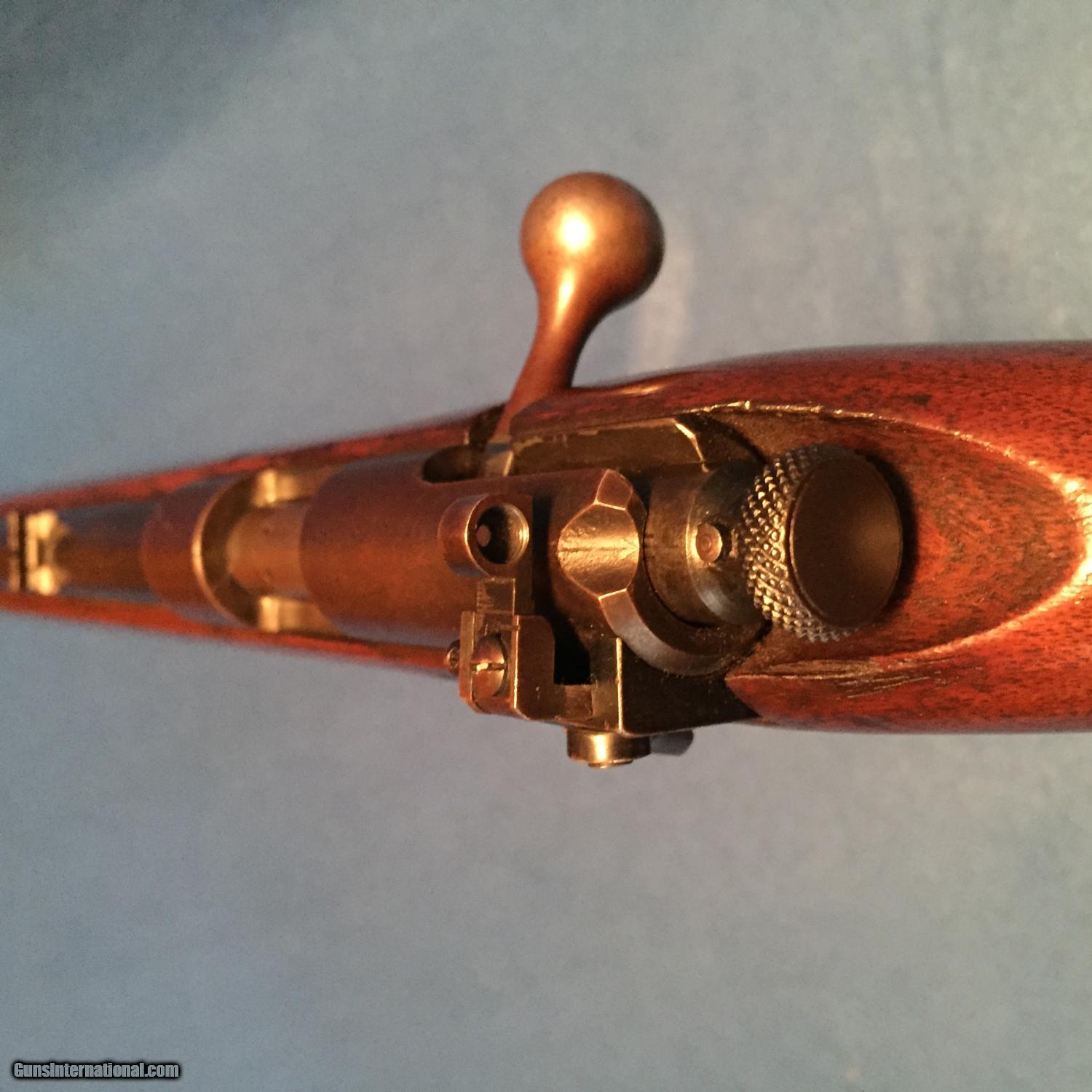 Description: Winchester Mod 57 target - scarce gun, with fair bluing, but thinning. Wood has usual handling marks and dings and varnish flaking mainly at the caring point. Sights are correct Lyman 42W rear peep and folding mid sight with Lyman globe front sight. Original 5 shot clip. SOLD Curio/Relic: Yes Manufacturer: WINCHESTER Model: 57 TARGET Serial Number: 17149 Caliber Info: 22 Bore Condition: VERY GOOD Manufacture Date: 1930 |