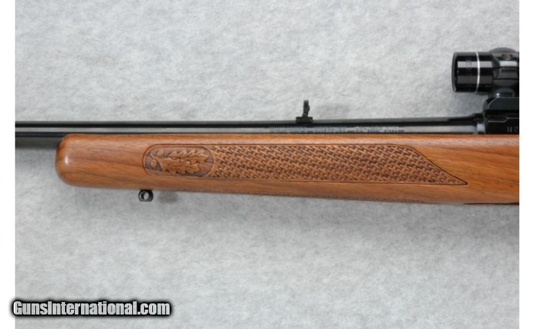 Description: SOLD Caliber Info: .308 Win. Chambers: Detachable magazine. Metal Condition: Excellent Wood Condition: Excellent with a few minor handling marks. Bore Condition: Very good. Barrels: 22 inches. Stock: Basket weave with oak leaf walnut pistol grip with a black steel cap. Stock Dimensions: 13 3/4 inches. Fore End: Basket weave with oak leaf walnut. Butt Pad: Checkered black plate. Weight: 8 lbs. 1 oz. with scope mounted. Sights: Tasco 1.75-5x20 Scope. Hooded front blade. Folding adjustable middle. Extras: One Extra Magazine Item Location: Richfield, WI |