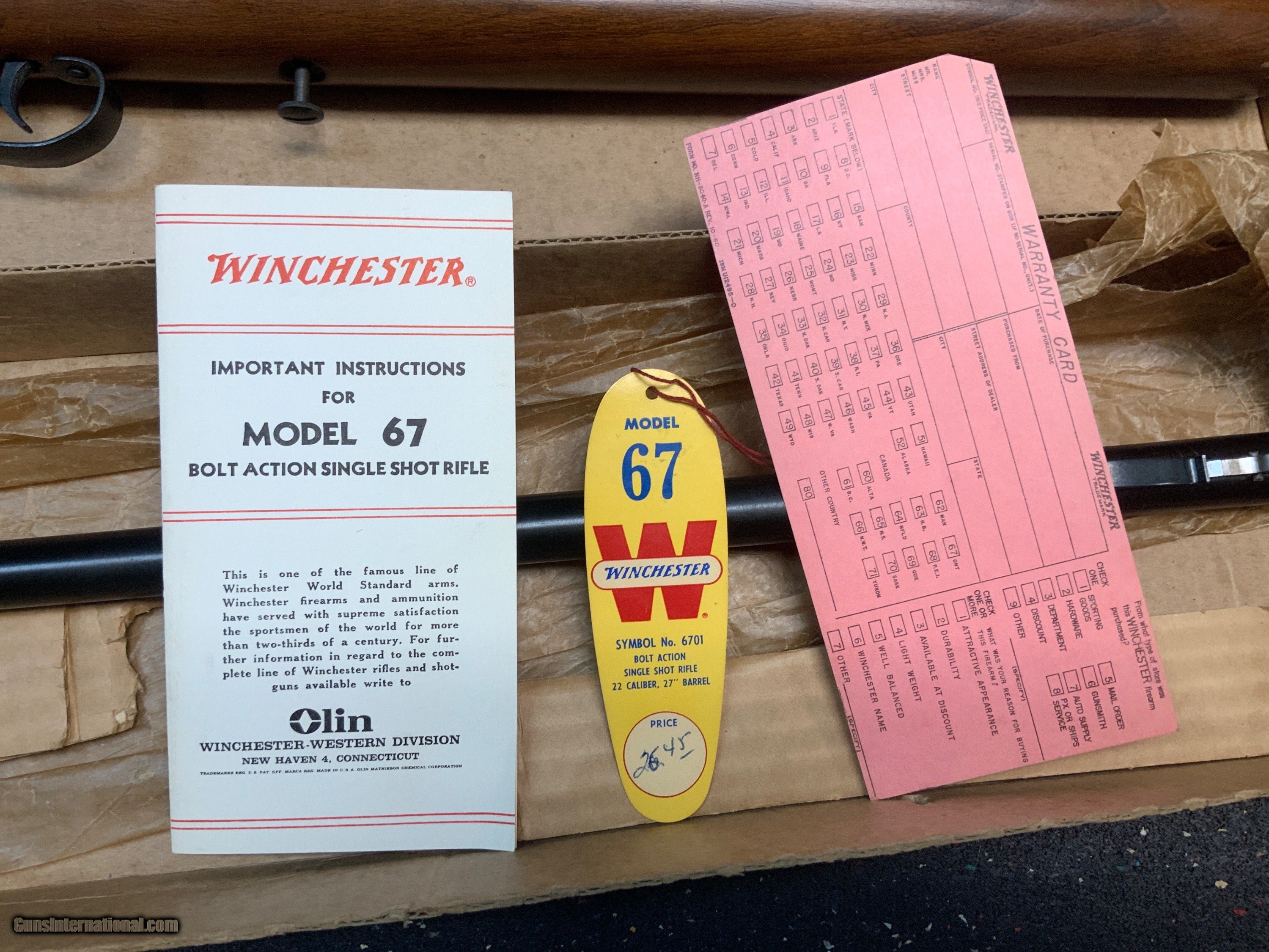 Description: Winchester model 67A bolt action single shot 22 caliber rifle as new in the original box. Does not appear to have ever been assembled. Comes complete with original box, hang tag, warranty card and brochure. Box is a bit rough and the top is missing one edge. Pictures tell the tale. Please add $65 for shipping and insurance to your FFL or C&R. SOLD Rifle Caliber: .22 Long Rifle Manufacturer: Win Model: 67A Condition: Minty Metal Condition: Minty Wood Condition: Minty Bore Condition: Minty Action: Bolt Extras: Box, Hangtag |
