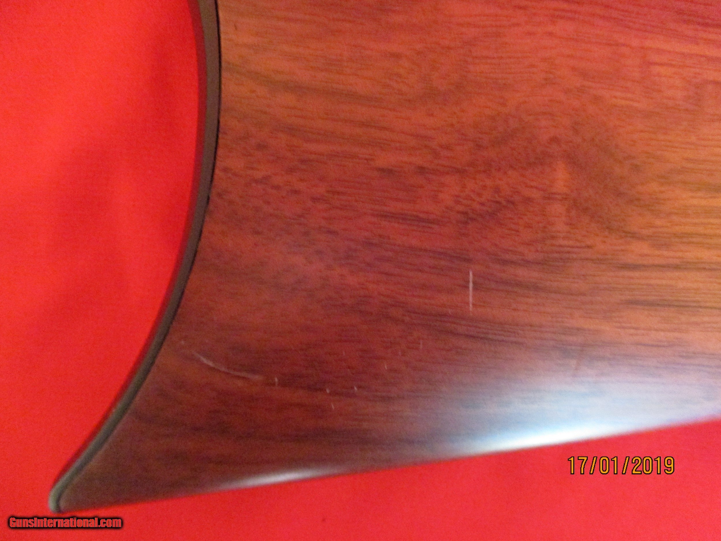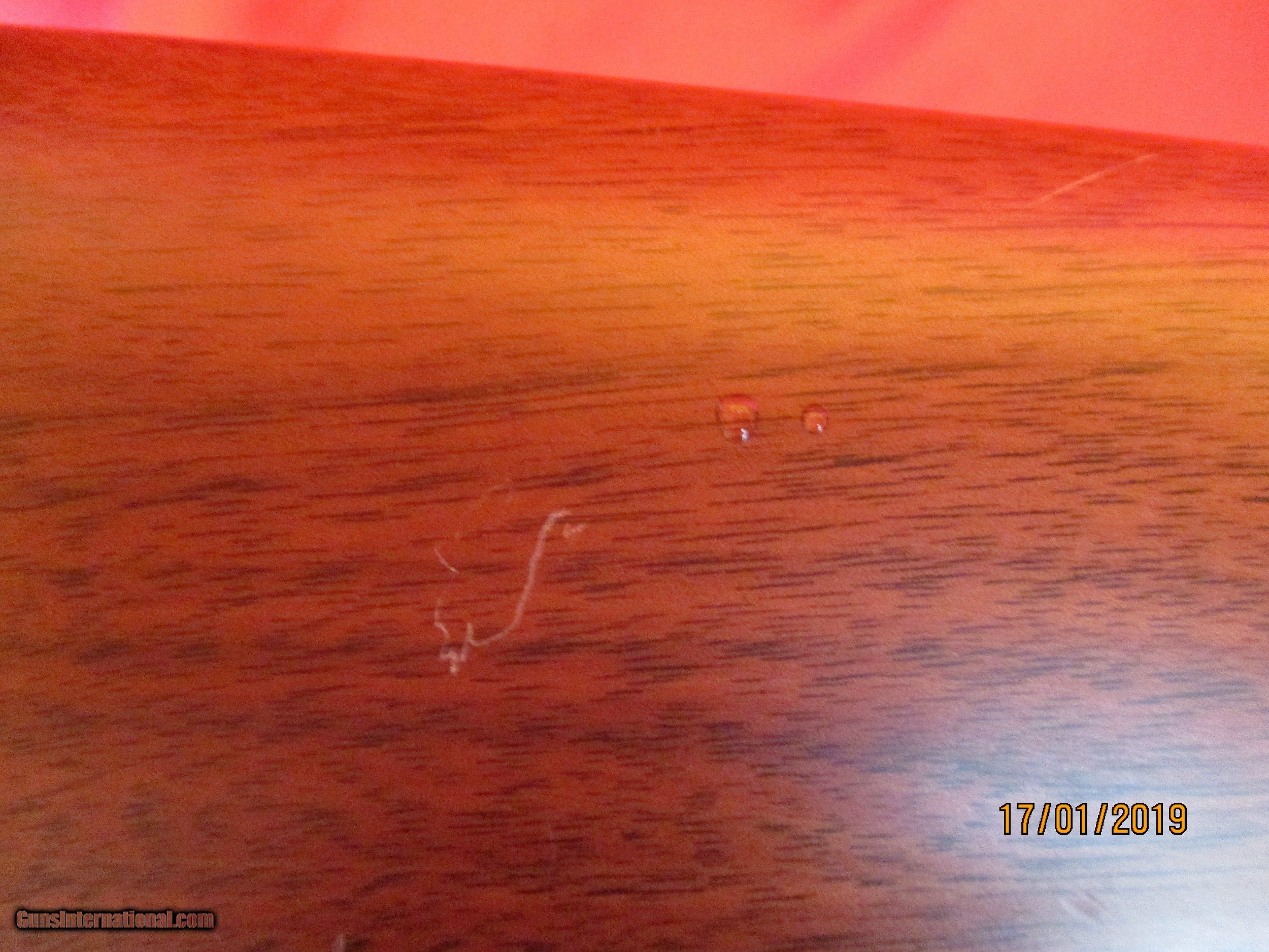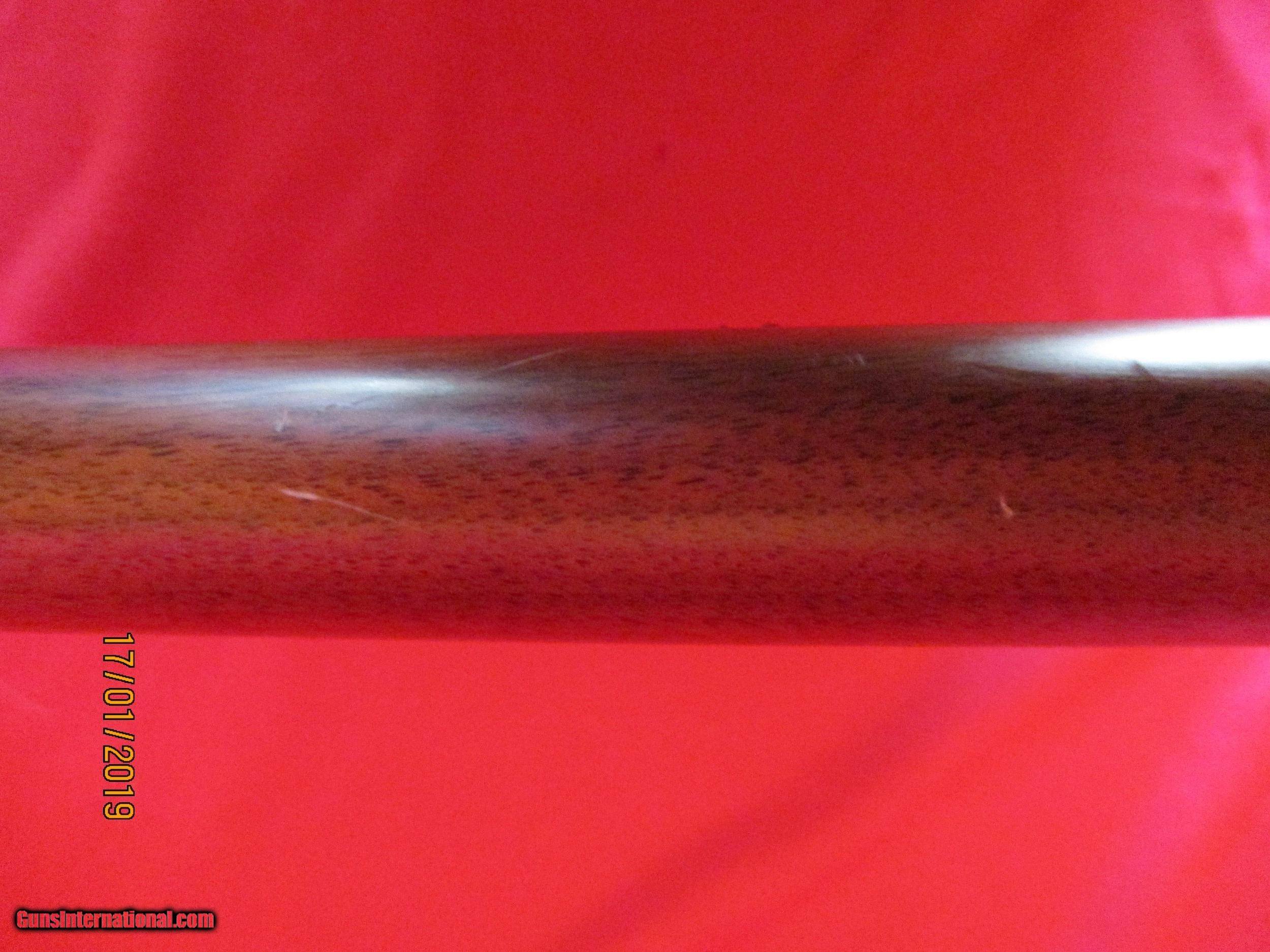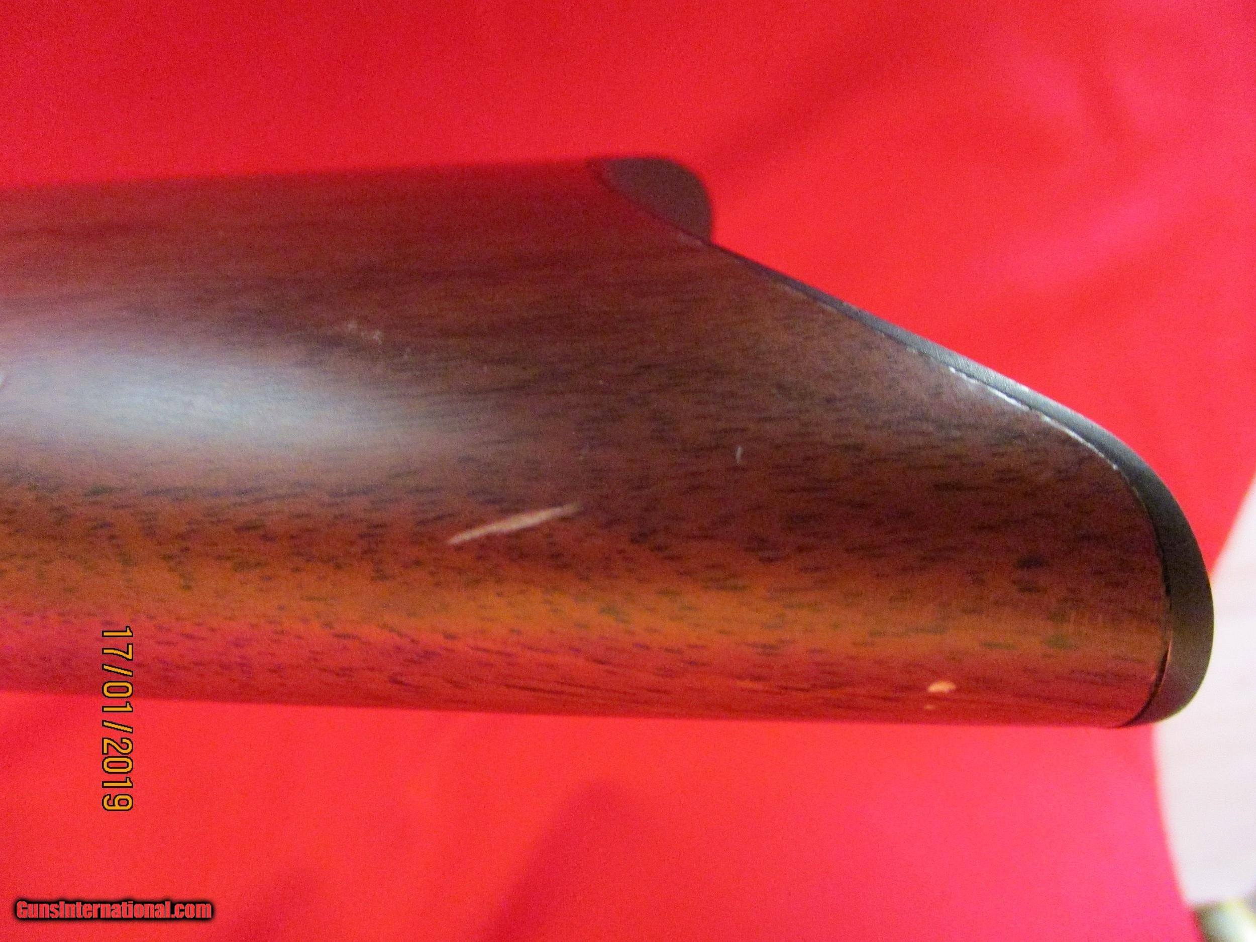 Description: 24" 1/2 round, 1/2 octogan barrel. Has folding leaf rear sight and a Marble's tang sight, adjustable for elevation and windage. This rifle has a steel upper tang as part of the receiver, and was factory drilled and tapped for a tang sight. Newer models do not have an upper tang. There are several minor nicks as shown in the photos, but rifle is nice over all. Text or E-mail with any questions. If you call, leave a message. Also, have new Leupold scope bases to go with rifle. SOLD Manufacturer: Winchester Licensee, U. S. Repeating Arms Co., Mfg. by Miroku Model: 1885 Serial Number: 0000EF0388 Caliber Info: .22 LR Metal Condition: Excellent Wood Condition: Very Good Bore Condition: Mint Barrel Type: 1/2 round, 1/2 octogan Action: Falling Block |