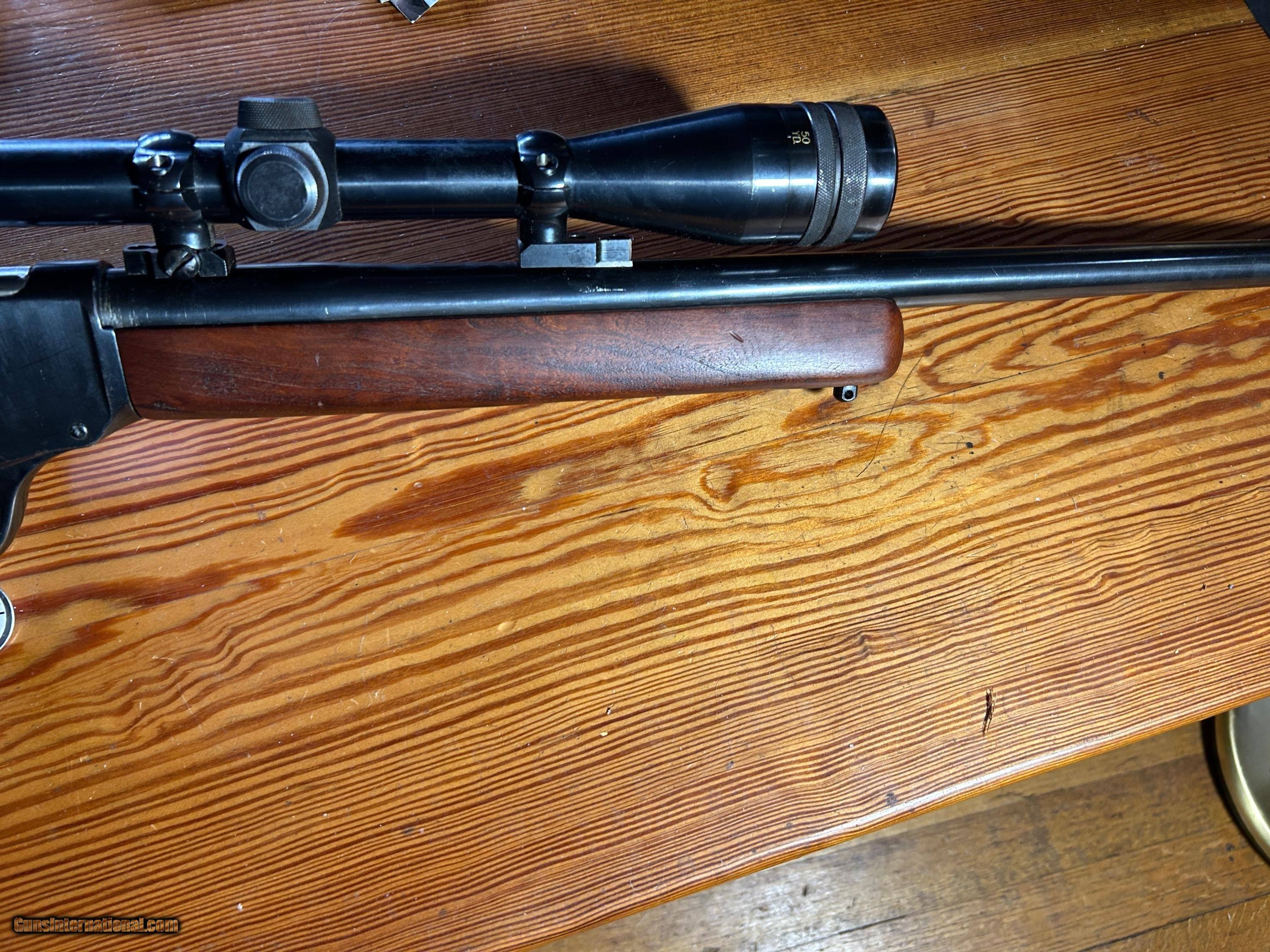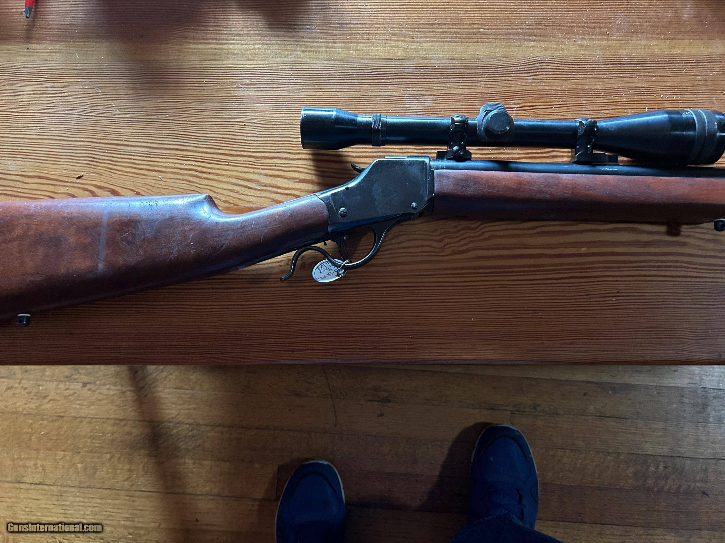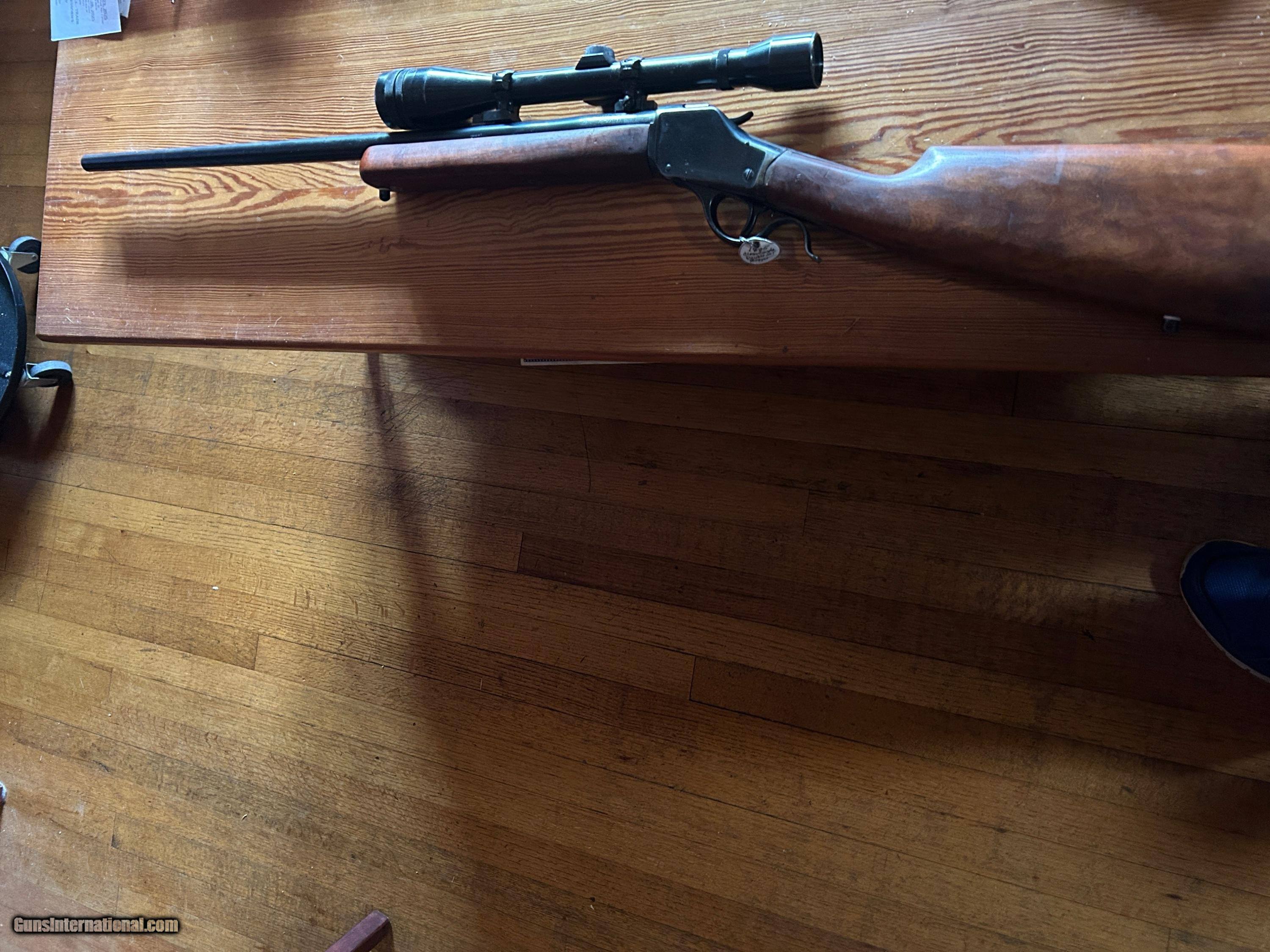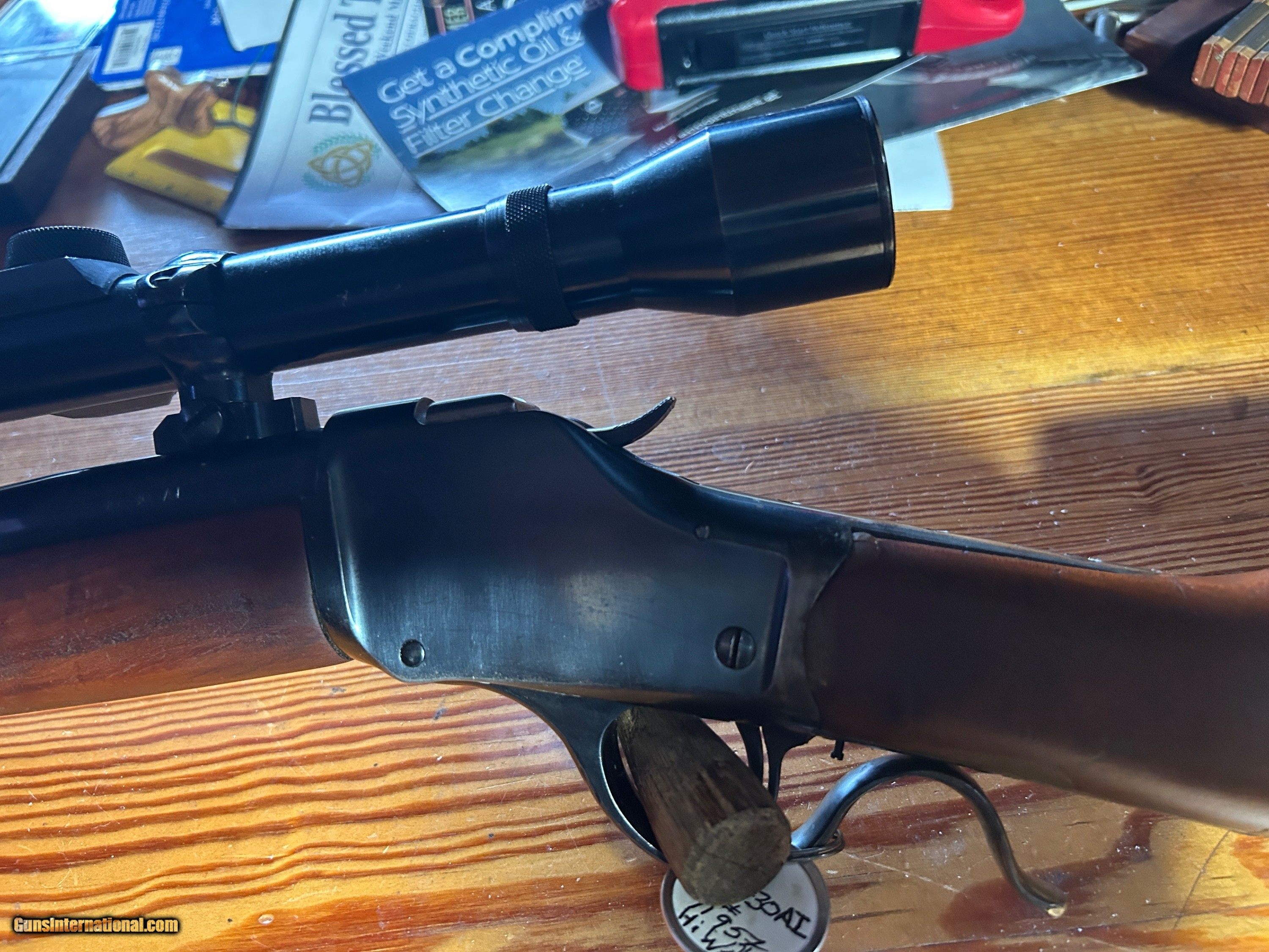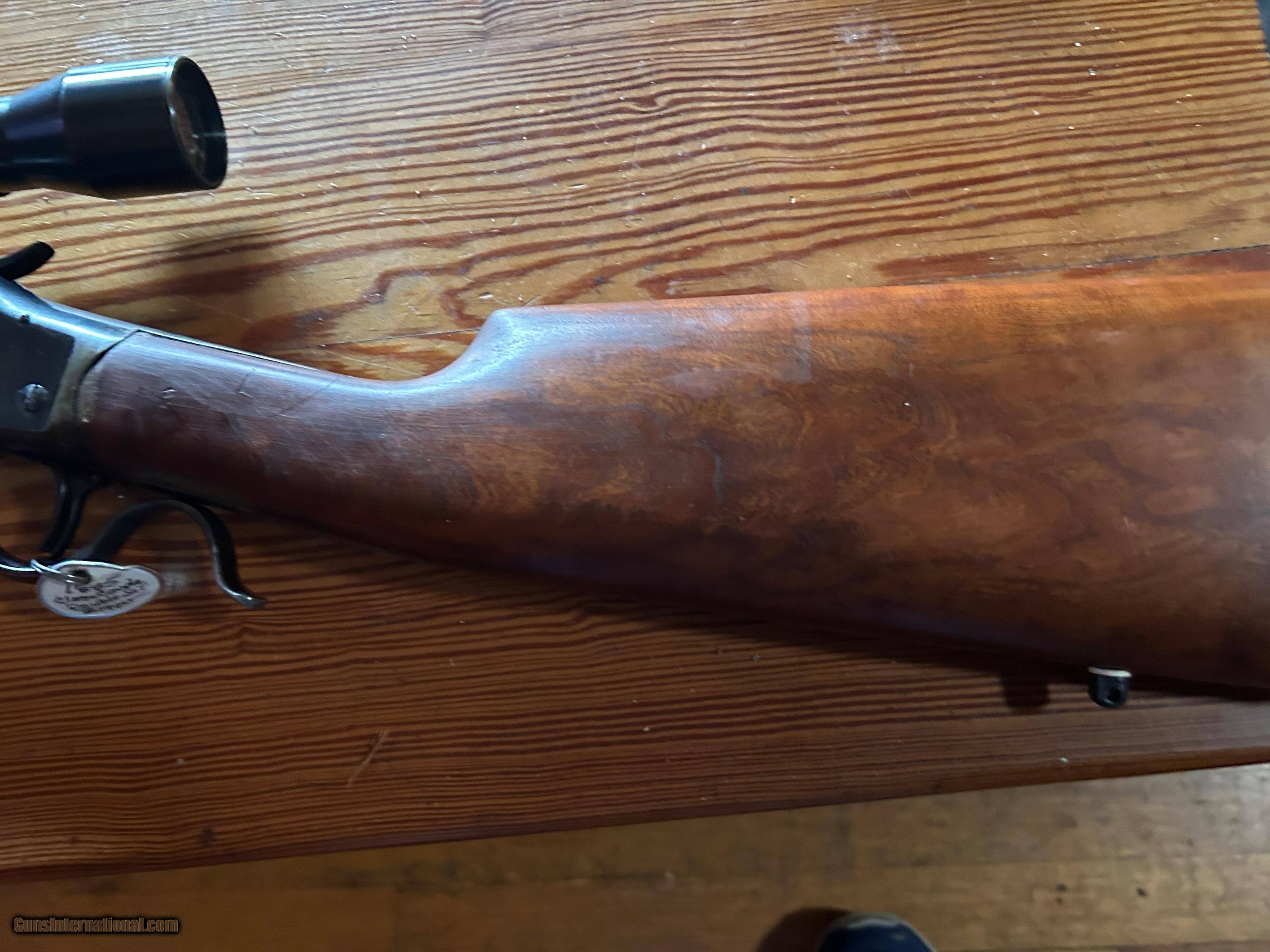 Description: Custom Winchester Hi Wall 30-30 Ackley Imp Cherry wood stock Weaver K8-1 Good condition The stock has a repair where the butt stock meets the left side of receiver shown in picture.Cherrywood stock. At some time in its life it was bored out from 22 Hornet to 30-30 Ackley Improved Close coupled double set trigger. It is not a Winchester barrel on gun. Smooth action. Rifle Caliber: .30-30 Winchester Manufacturer: Winchester 1891. Antique Model: 1885 Winchester Serial Number: 91957 Barrel Length: 25 1/2” Bore Info: Exc Chambers: Exc Ejectors: Good Condition: Good Metal Condition: Good Wood Condition: Good Bore Condition: Exc Barrel Type: Single Action: Falling block Triggers: Close couple double set trigger Stock: Cherry Finish: Blue Sights: Scope Item Location: St Petersburg Price: $900.00 Shipping: $175.00 Contact Seller |