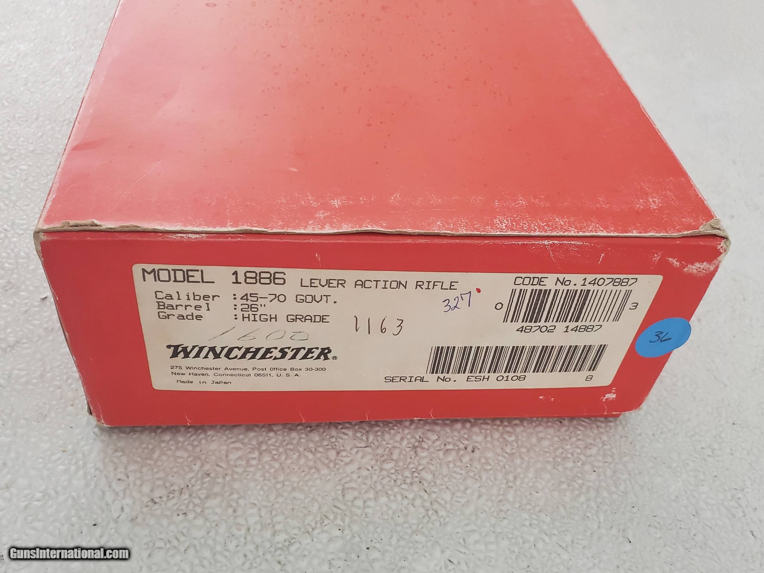 Description: MADE IN JAPAN. 26'' BARREL WITH OPEN SIGHTS. ALL FACTORY AND NEW IN BOX. INCLUDES BOX AND BOOKLET. PLEASE ADD $75 FOR SHIPPING. SOLD Rifle Caliber: .45-70 Government Manufacturer: WINCHESTER Model: 1886 Condition: NIB Metal Condition: NIB Wood Condition: NIB Bore Condition: NIB |
