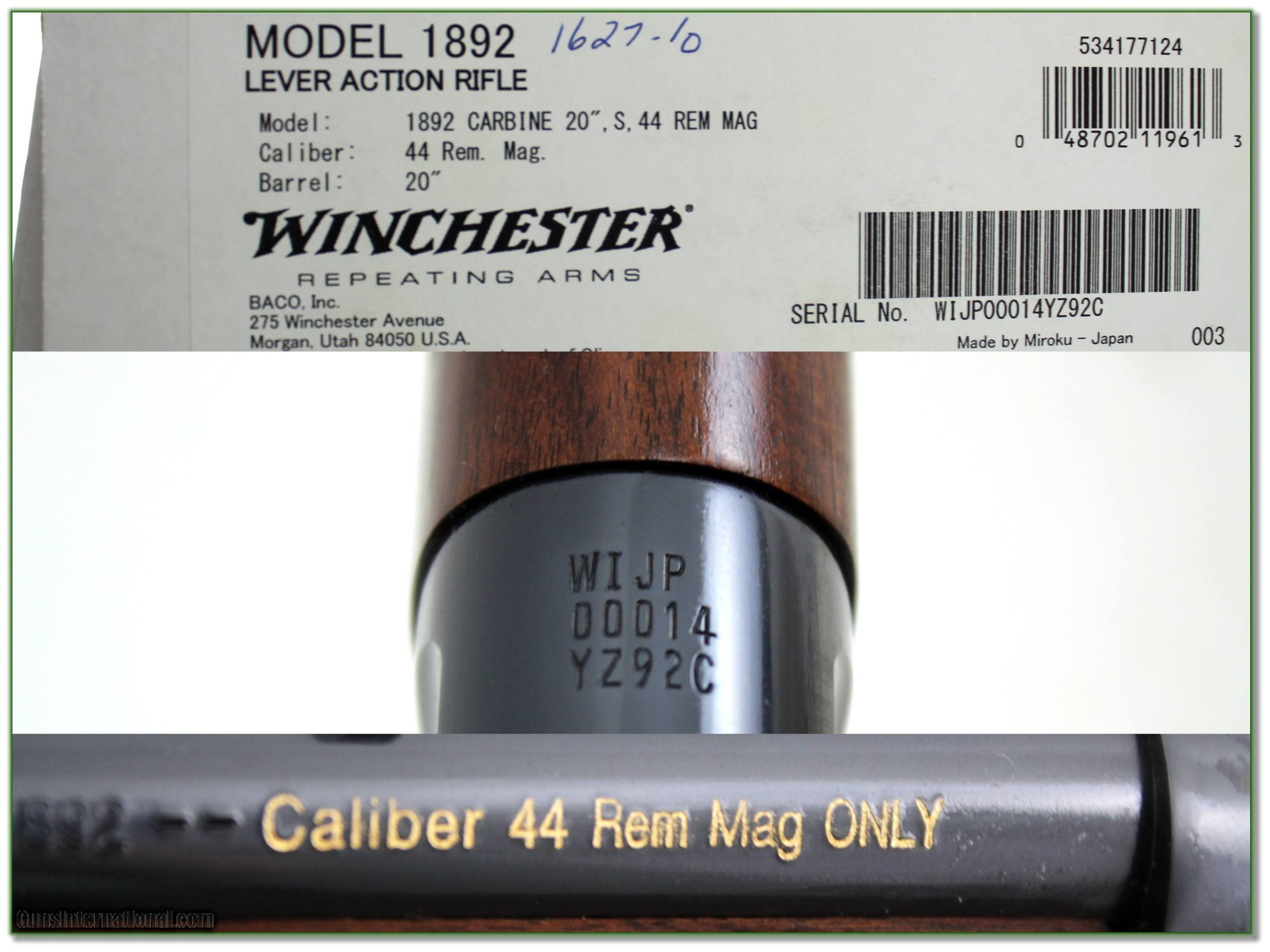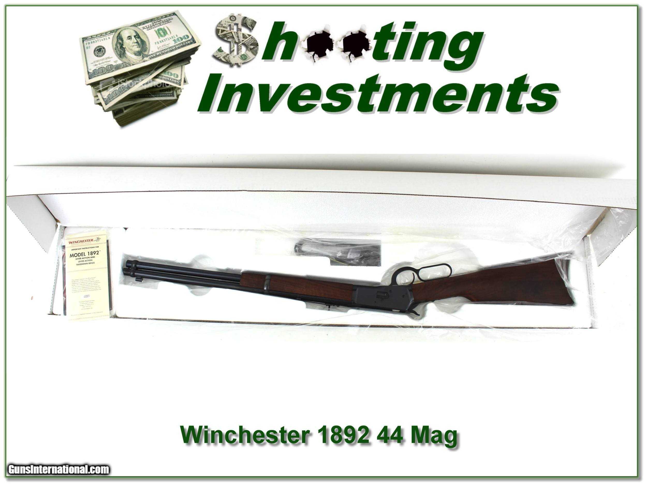 Description: This is a limited production Winchester 1892 in 44 Magnum with 20in barrel. It comes unfired in original box with manual. It has beautiful oil finished walnut and will make a classic hunting gun or be a fine addition to your collection. It is a real Shooting Investment! I am selling this one on consignment and as such lay-a-way can’t be used. It does of course have the standard 3-day inspection. Shipping and insurance is $49. Please email me with any questions or larger pictures. (Consign your quality firearms with Shooting Investments for only 12%! Let me know if you have any you would like to sell!) 22-0700 Payment: Payment is by Money Order, Cashiers Check or Personal Check. I can now also accept Credit Cards (MasterCard, Visa, Discover & American Express) with a 3% convenience fee. Shipping: The shipping charge will be listed in each description. It is $49 for most long guns. Some heavy guns, over 48in boxes or those insured for over $2000 will be higher. Shipments to Alaska and Hawaii are higher because air shipment is required. Most firearms are shipped on Tuesday and Thursday and usually in 5 days of receipt of payment. We package all shipments carefully and insure them. Optics are shipped Priority Mail and most other non-firearm shipments are shipped First Class. Returns: Our return policy is simple. If for any reason you are not pleased with your purchase, you may return your item for a full refund of purchase price. Ammunition cannot be returned. It is important to us that you are happy. Guns cannot be fired or dissembled before returning them and they must be returned in the same condition as received. Notification of a return must occur with-in 3 days of receipt at your dealer. Shipping, convenience and dealer fees are not refundable and are the responsibility of the buyer. Lay-a-way: If needed, we offer a 60 day lay-a-way option on most firearms. It is 1/3 now, 1/3 in 30 days and 1/3 in 60 days. Lay-a-way firearm sales are final and if not completed the first payment cannot be returned. Consigning your firearms with Shooting Investments: We will help you get top dollar for your firearms. While most local guns shops charge 20% or more, our fee is only 12% with a minimum of $75. At your local gun shop it might take months to sell. Selling on-line provides instant access to thousands of interested buyers. You won’t find any other on-line dealer willing to sell your firearms for only 12% or listing every gun on 3 separate s. Selling through an House typically costs the seller 15% and the buyer an addition 15% (so 30%) and you have to wait several months to sell and longer to receive funds. If properly priced, we will sell your firearms in a few weeks. Send us an email or give us a call and we’ll explain how easy it is for you to get top dollar. Trading: Trading for use is really just buying your gun to re-sell. If you have a gun you want to trade, please email a picture and we will let you know what we can give or it. You will always get more if we sell it for you on consignment. Help for California Buyers: We are happy to ship to California. It is the buyer’s responsibility to make sure any item you buy is legal in your state. We are also happy to help with your purchase of a firearm from someone other than us. If you see a gun you would like to buy but the seller can’t or won’t ship to California they can ship to use and we’ll then ship it to your California dealer. The cost for this service is only $30 + shipping. Let us know if we can help! SOLD |